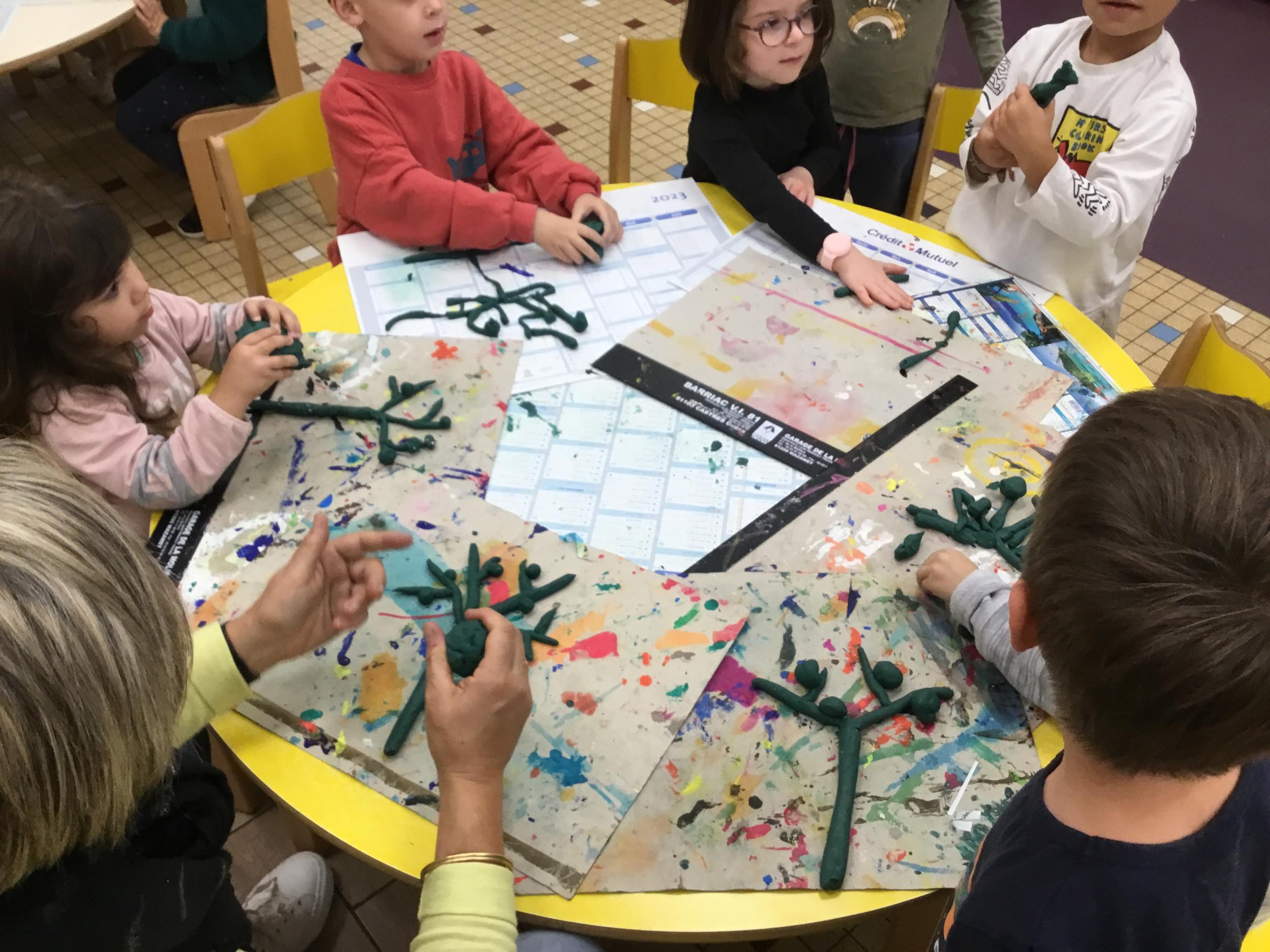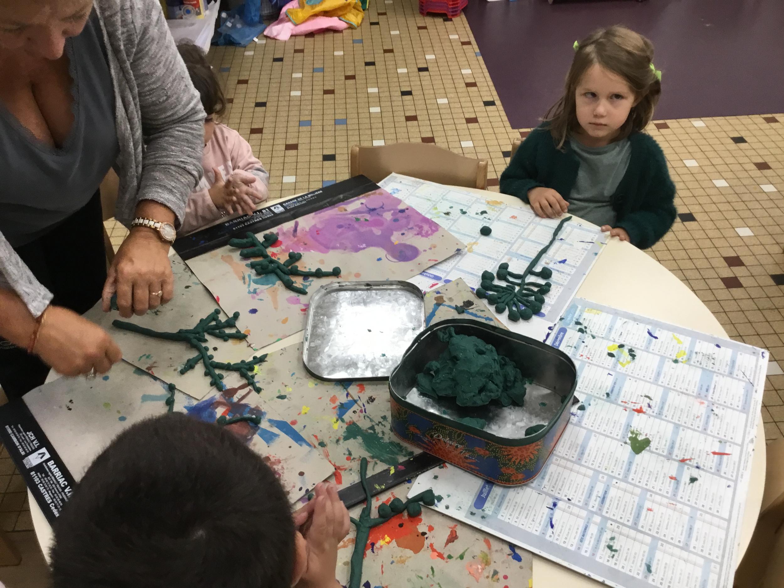 Petite et moyenne section 04/10/2024 Les élèves de MS ont fabriqué les pommiers de Montdragon en pâte à modeler.