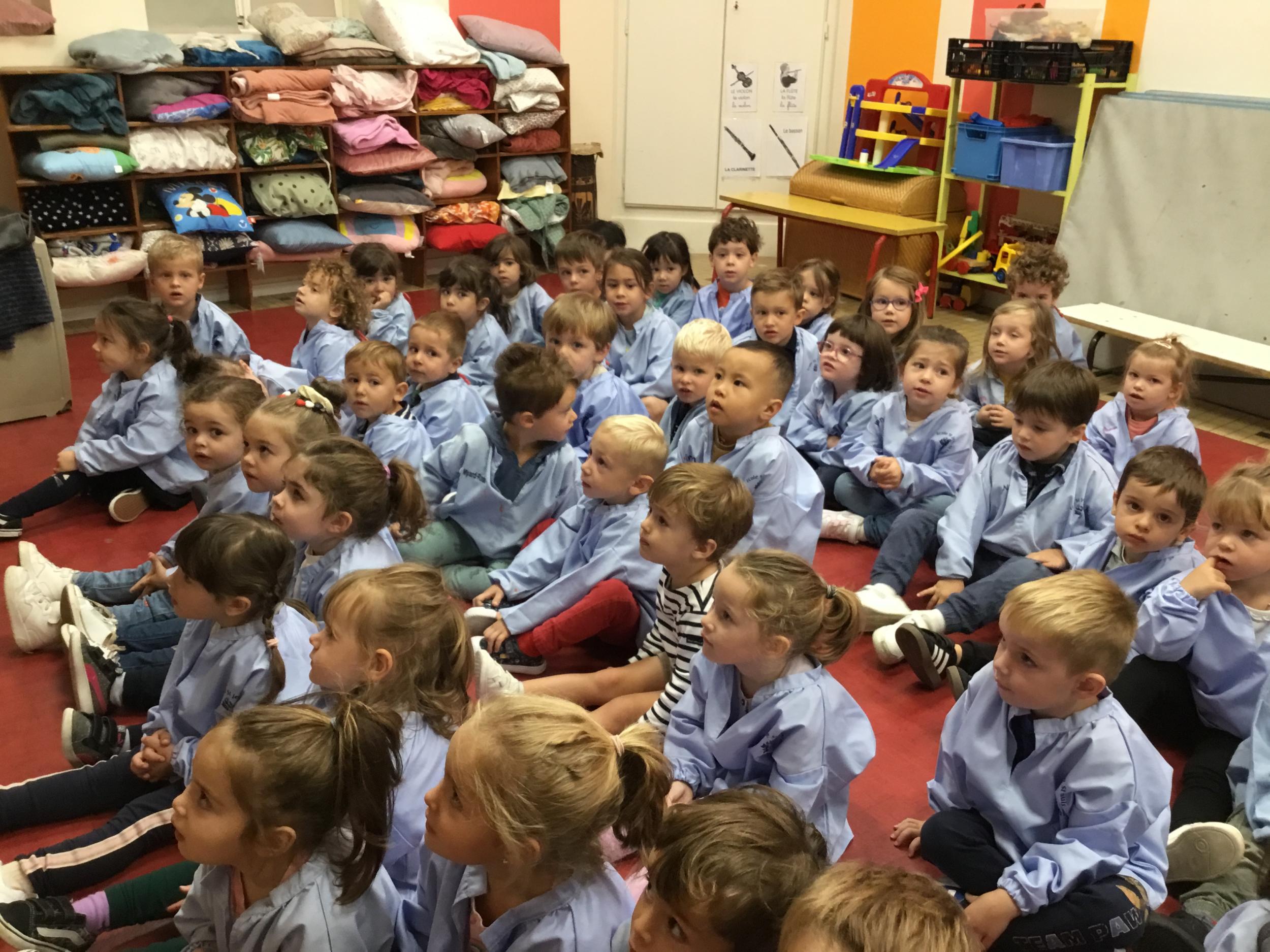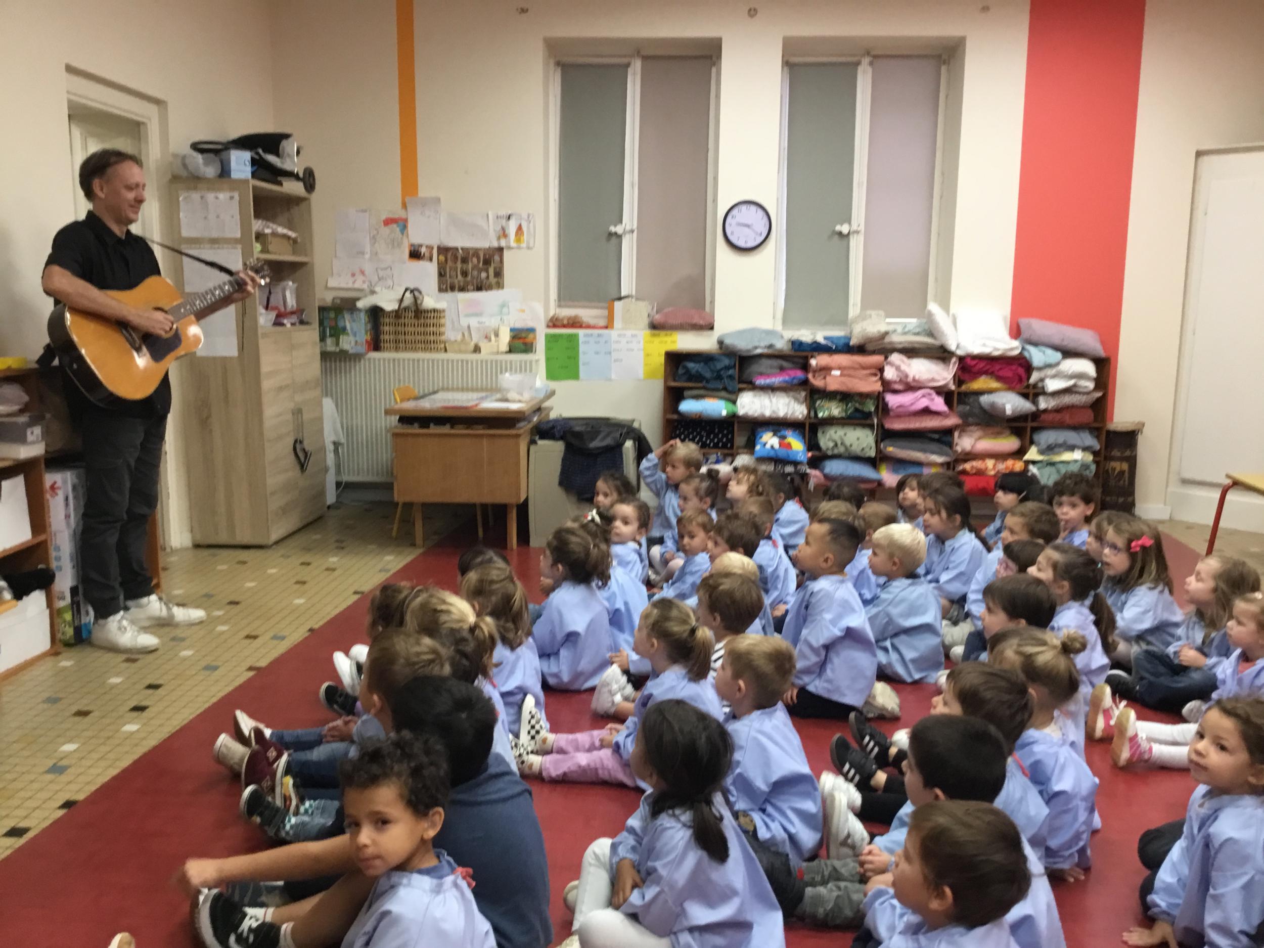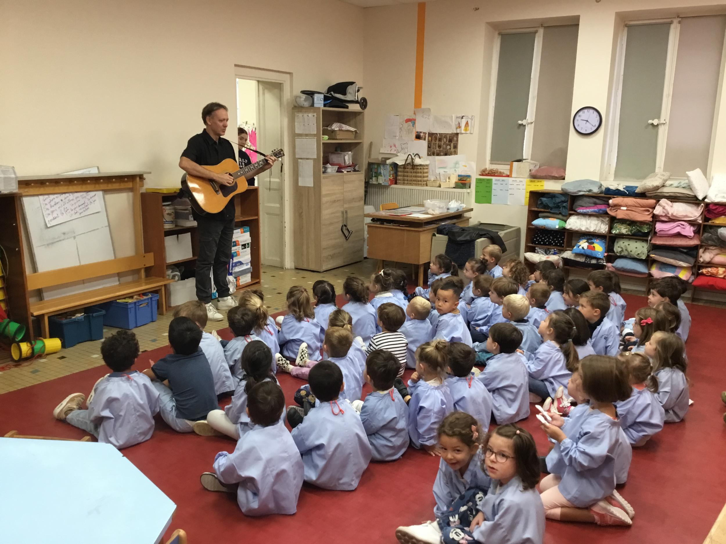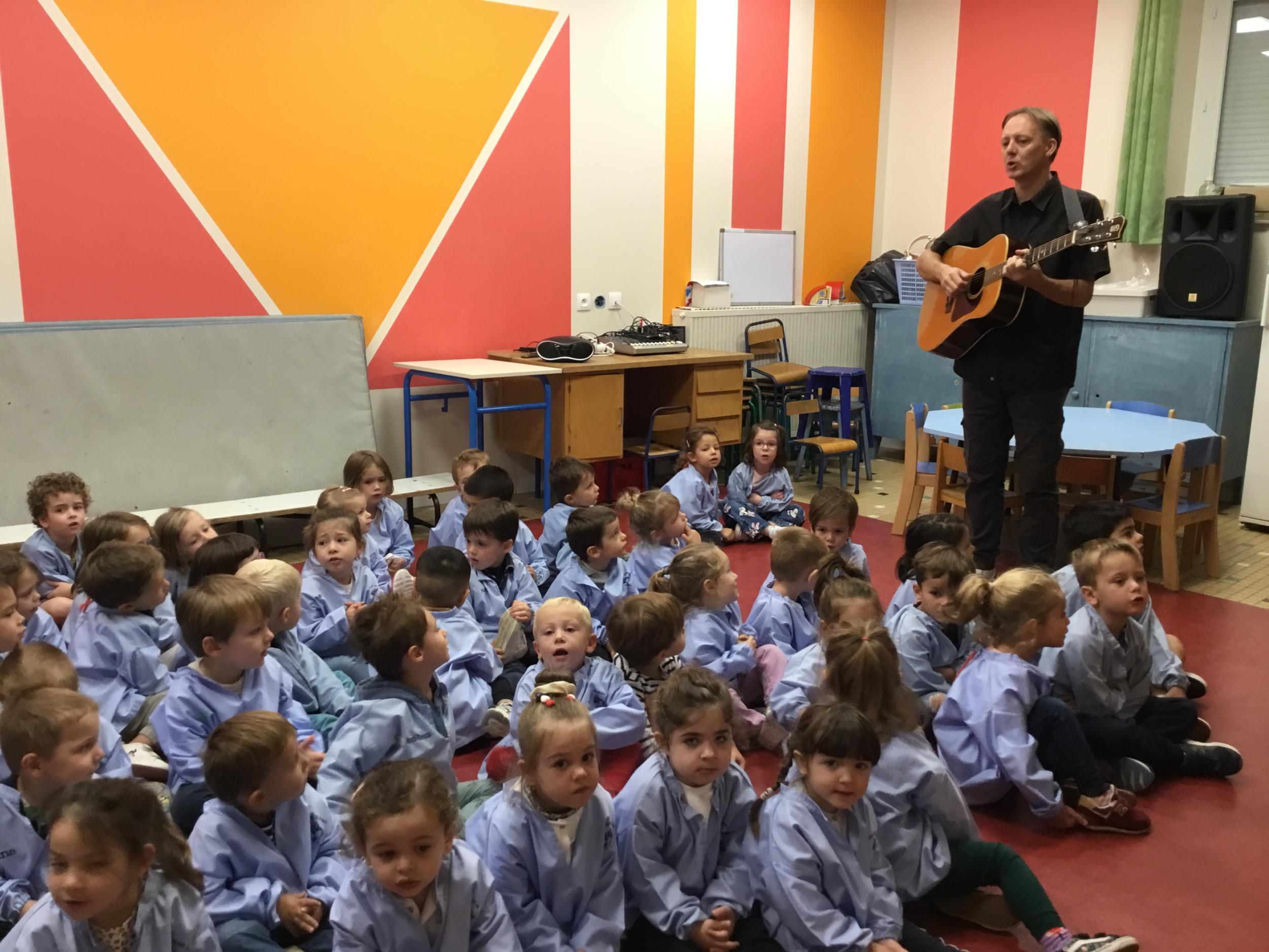 Petite et moyenne section 20/09/2024 Tous les vendredis , nous nous retrouverons pour chanter avec la classe des moyens. Les petits étaient ravis de découvrir la guitare du maître.
