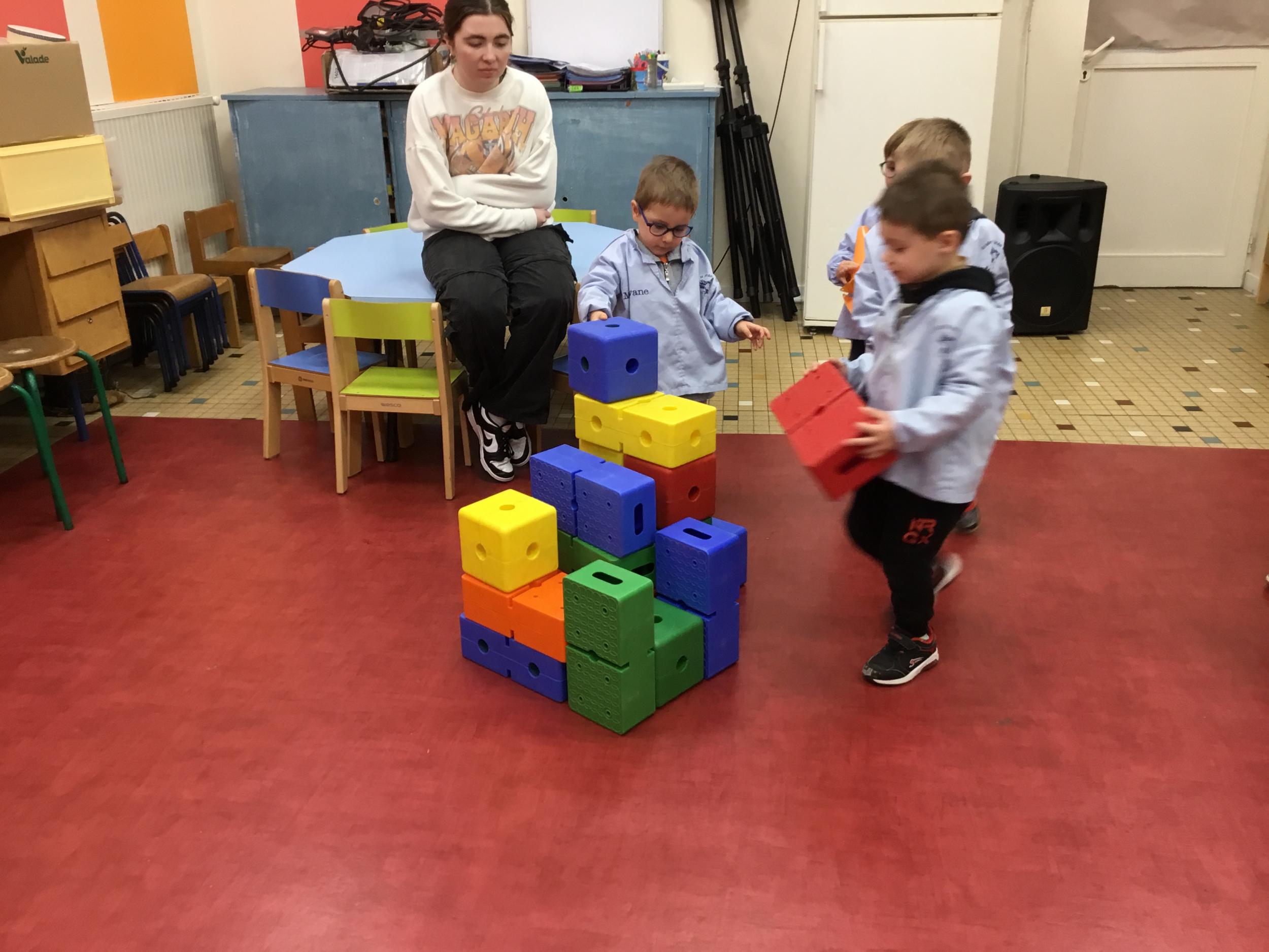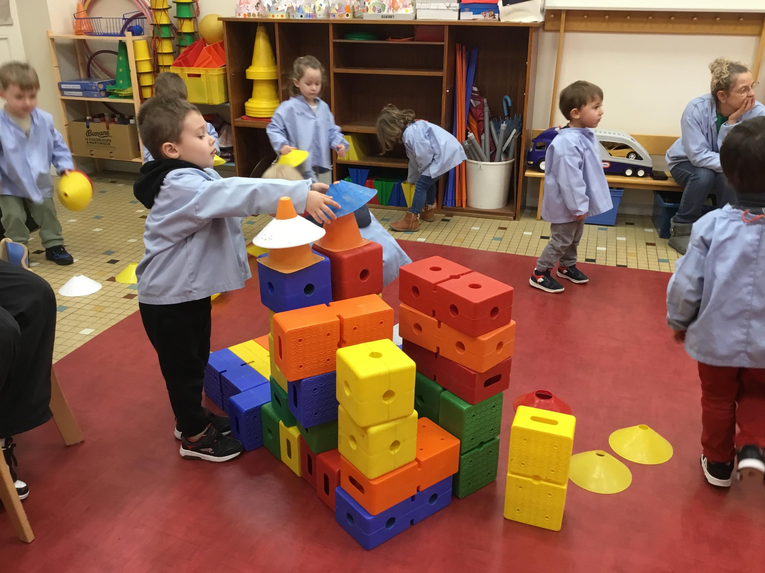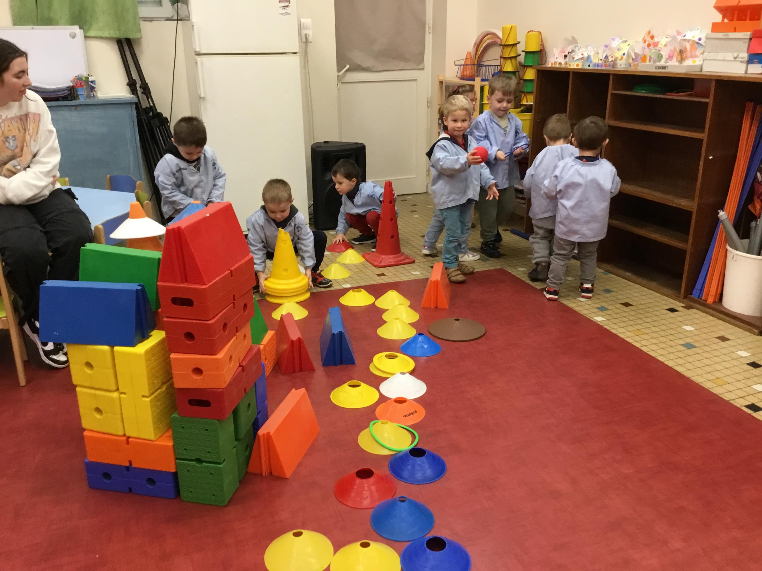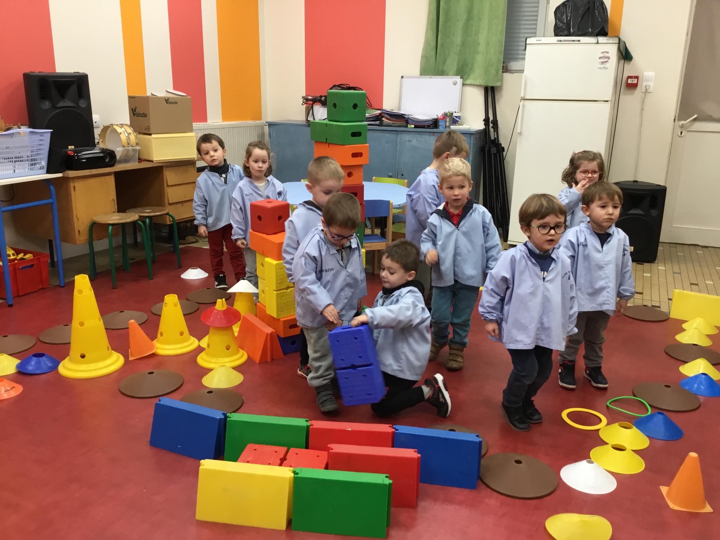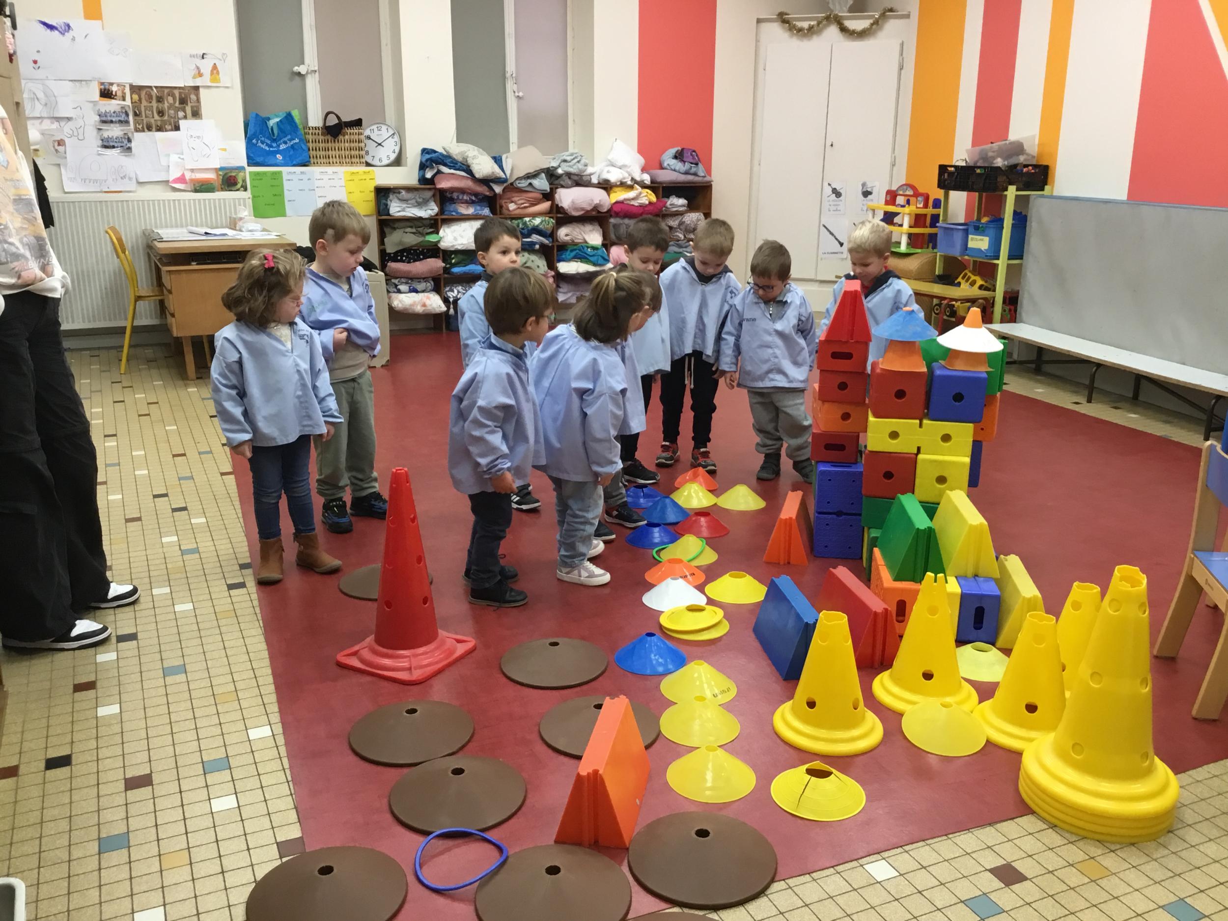 Une nouvelle fois, la maîtresse a proposé de construire collectivement une cabane en utilisant librement le matériel mis à disposition dans la salle de motricité. L’occasion de transporter, déplacer , créer….la maîtresse avait rajouté un critère :