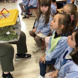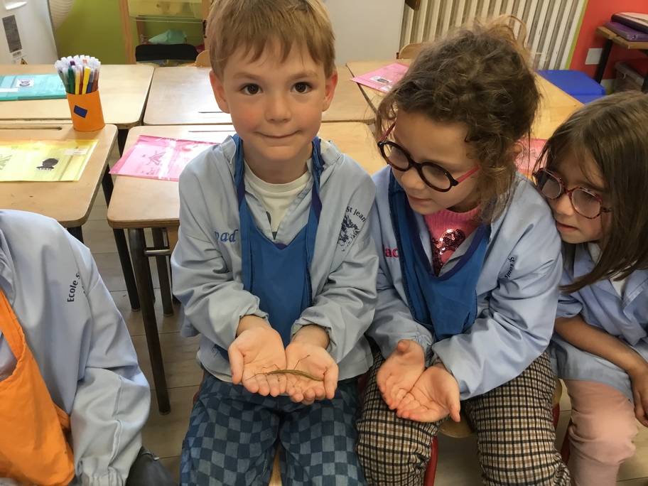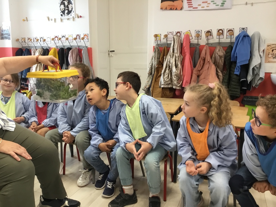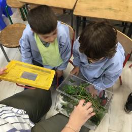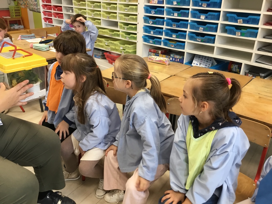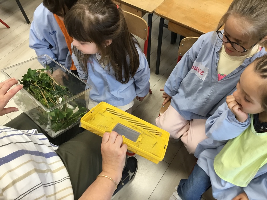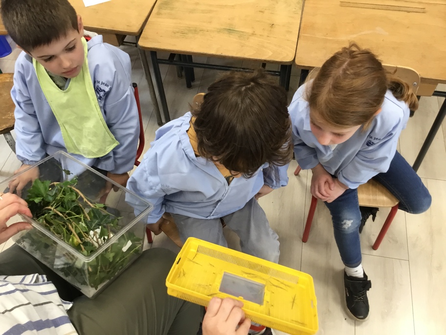Depuis la rentrée des dernières vacances, les élèves ont des nouveaux "amis" en classe. Une drôle de boîte transparente au couvercle jaune a été installée sur un meuble. A l'intérieur, des feuilles, des points noirs sur un papier absorbant, des drôles de bâtons verts ou marrons qui parfois se mettent à bouger...