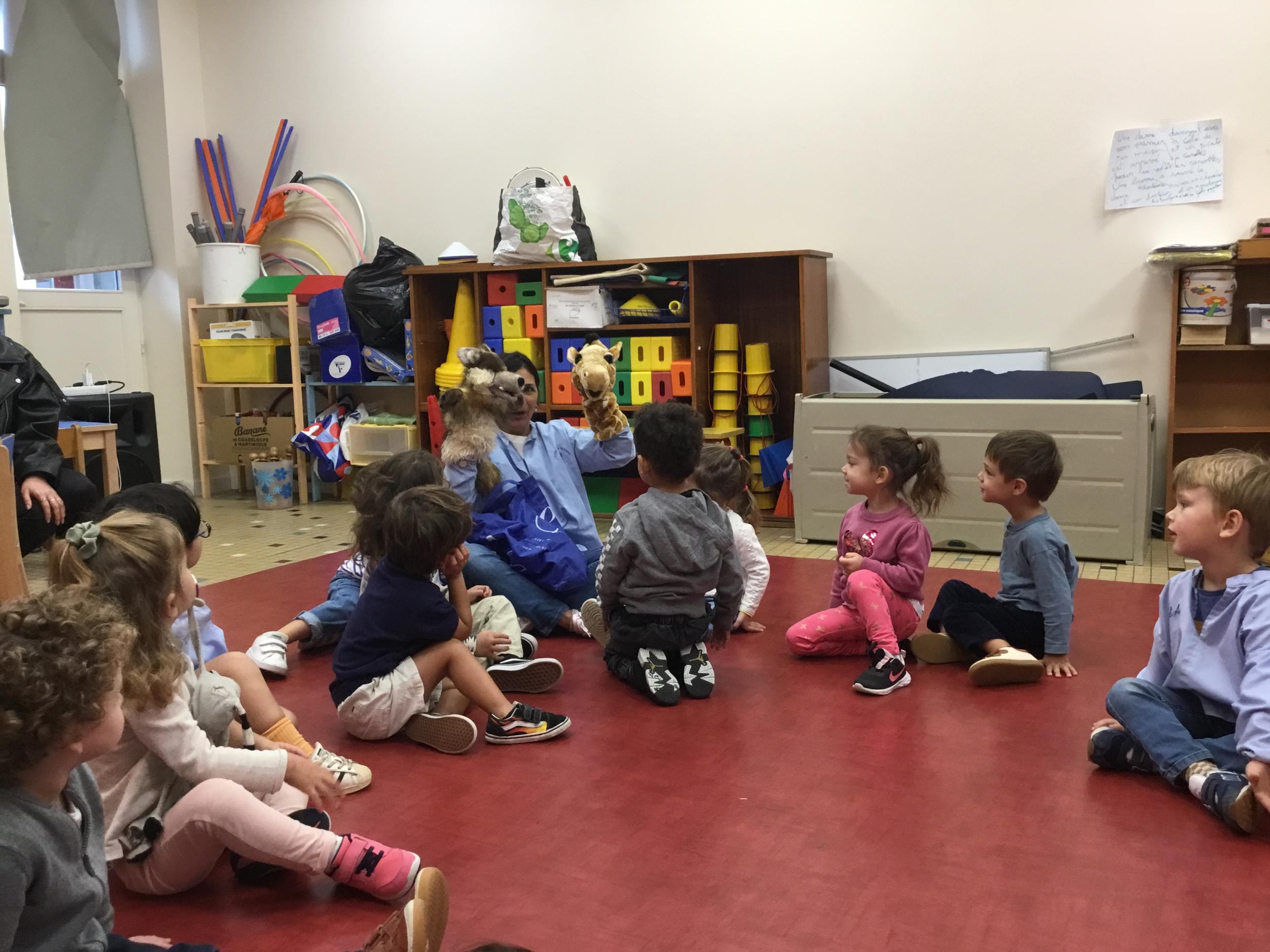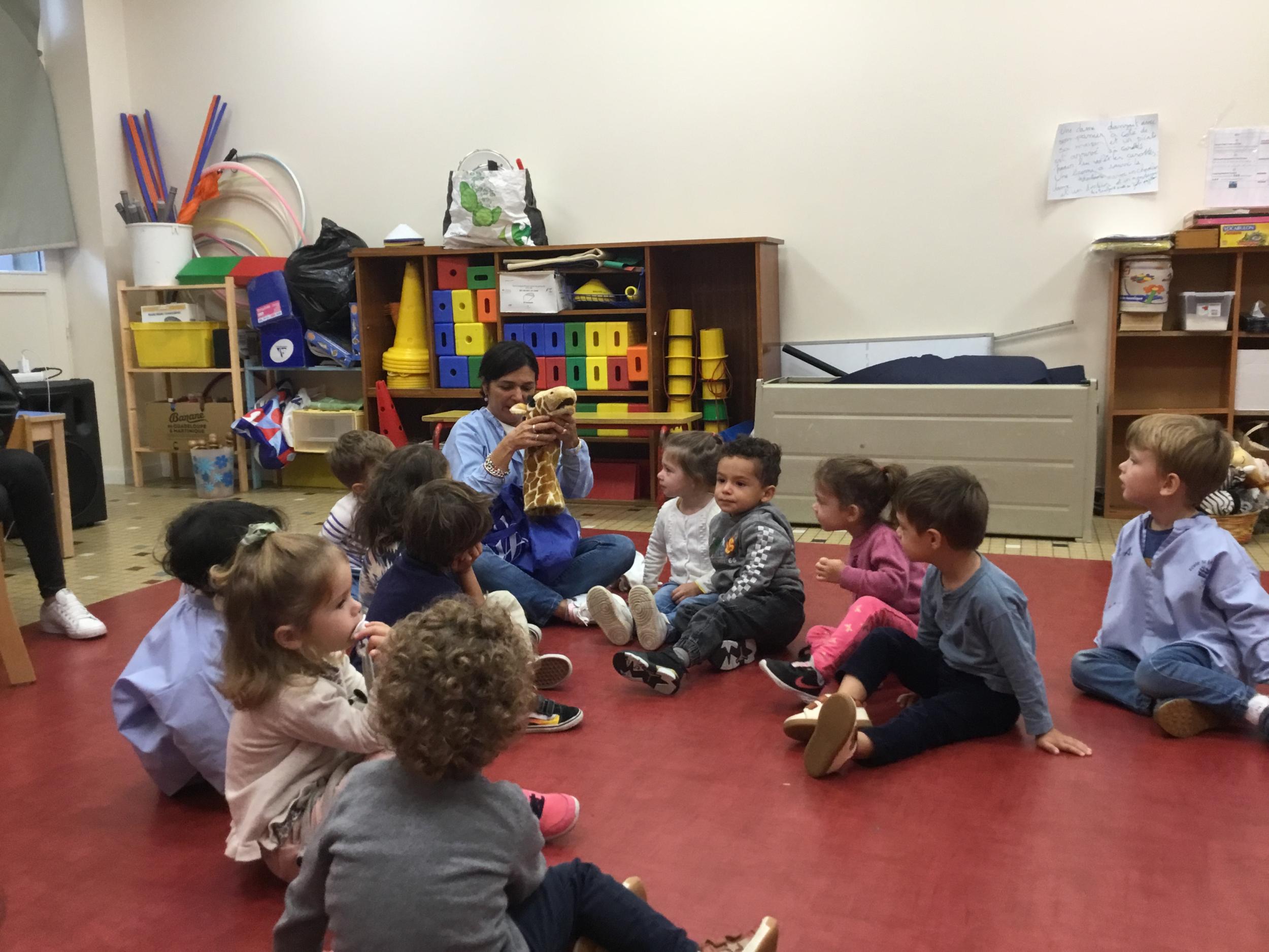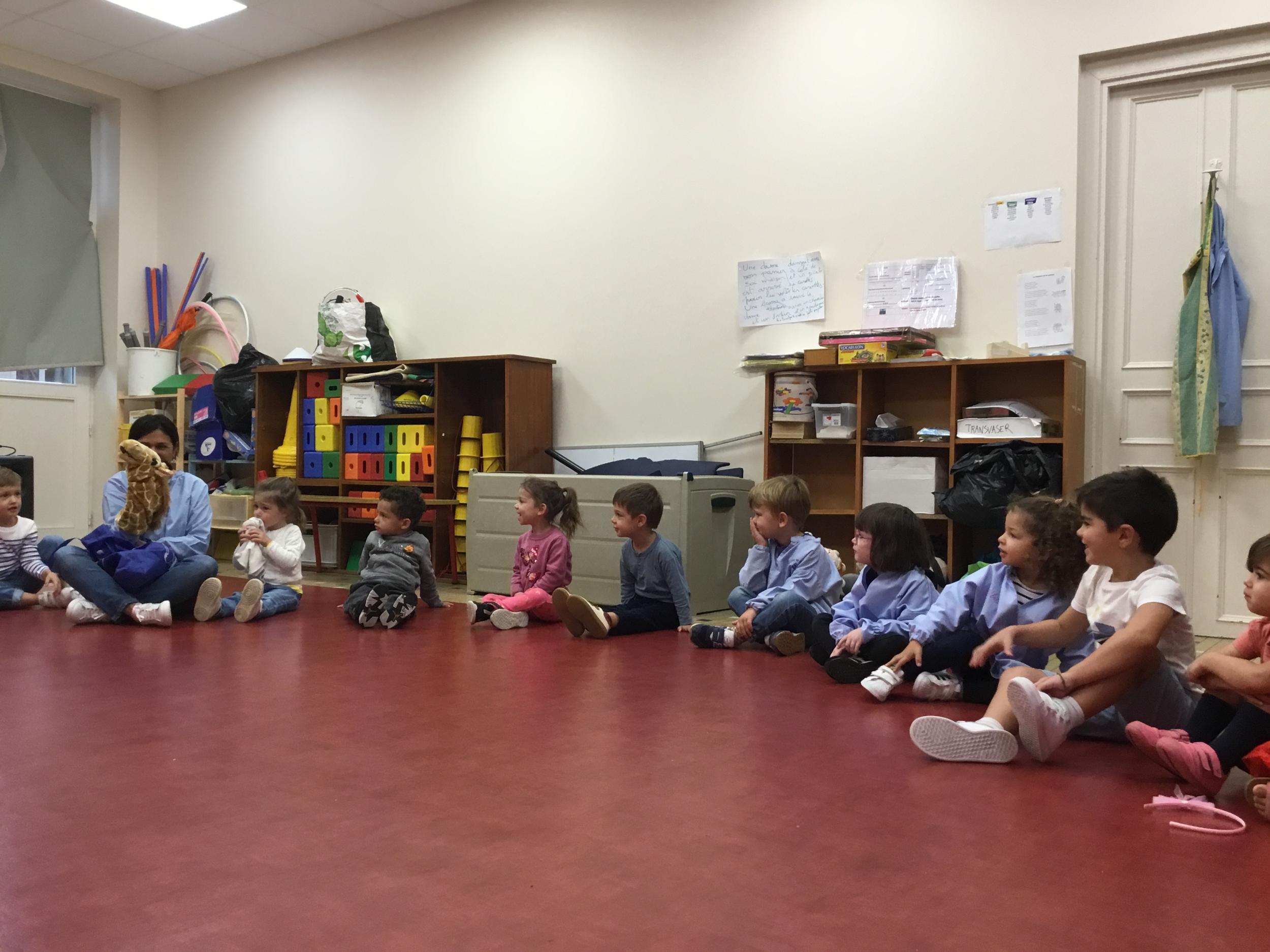 Chaque enfant a pris Gigi dans ses bras pour lui dire son prénom, puis Gigi est passée de bras en bras , en étant bien attentif à regarder son voisin en lui donnant la peluche.
