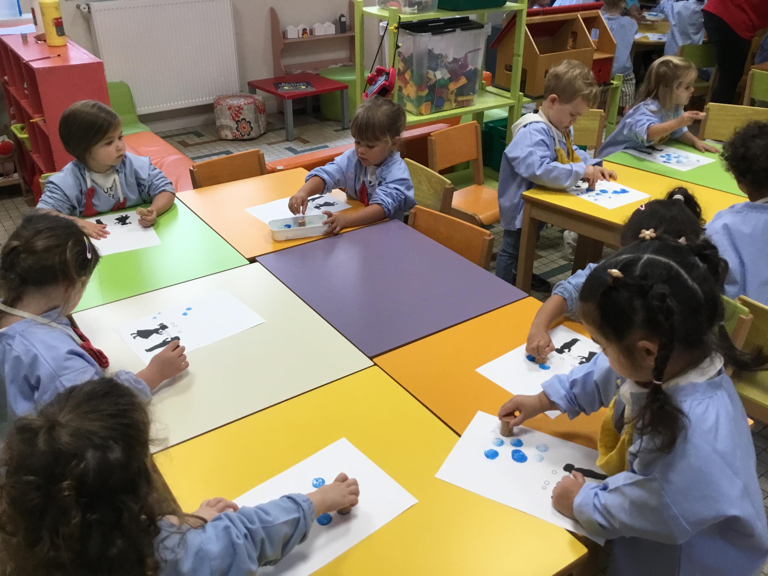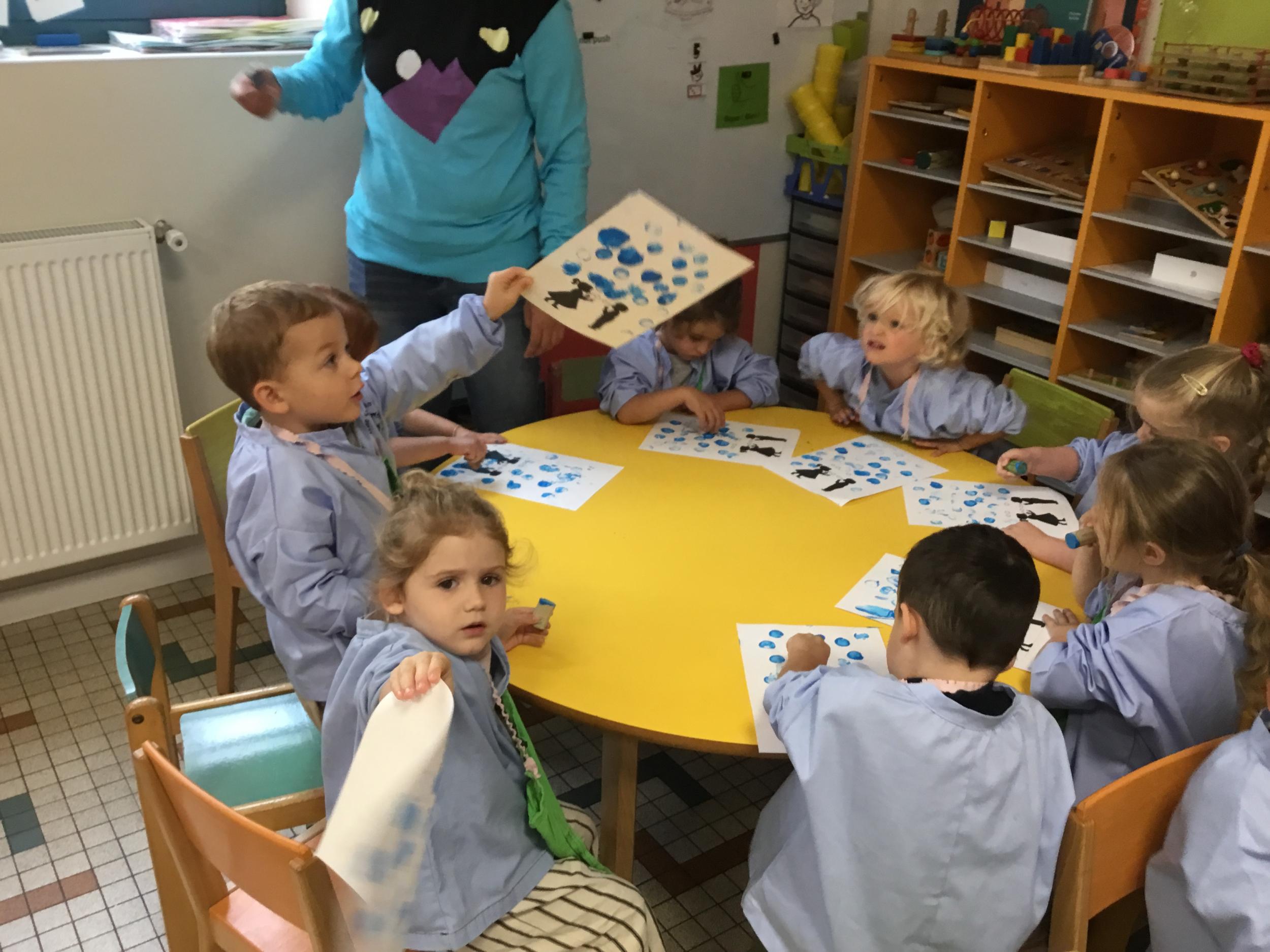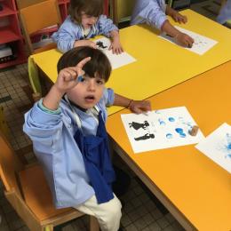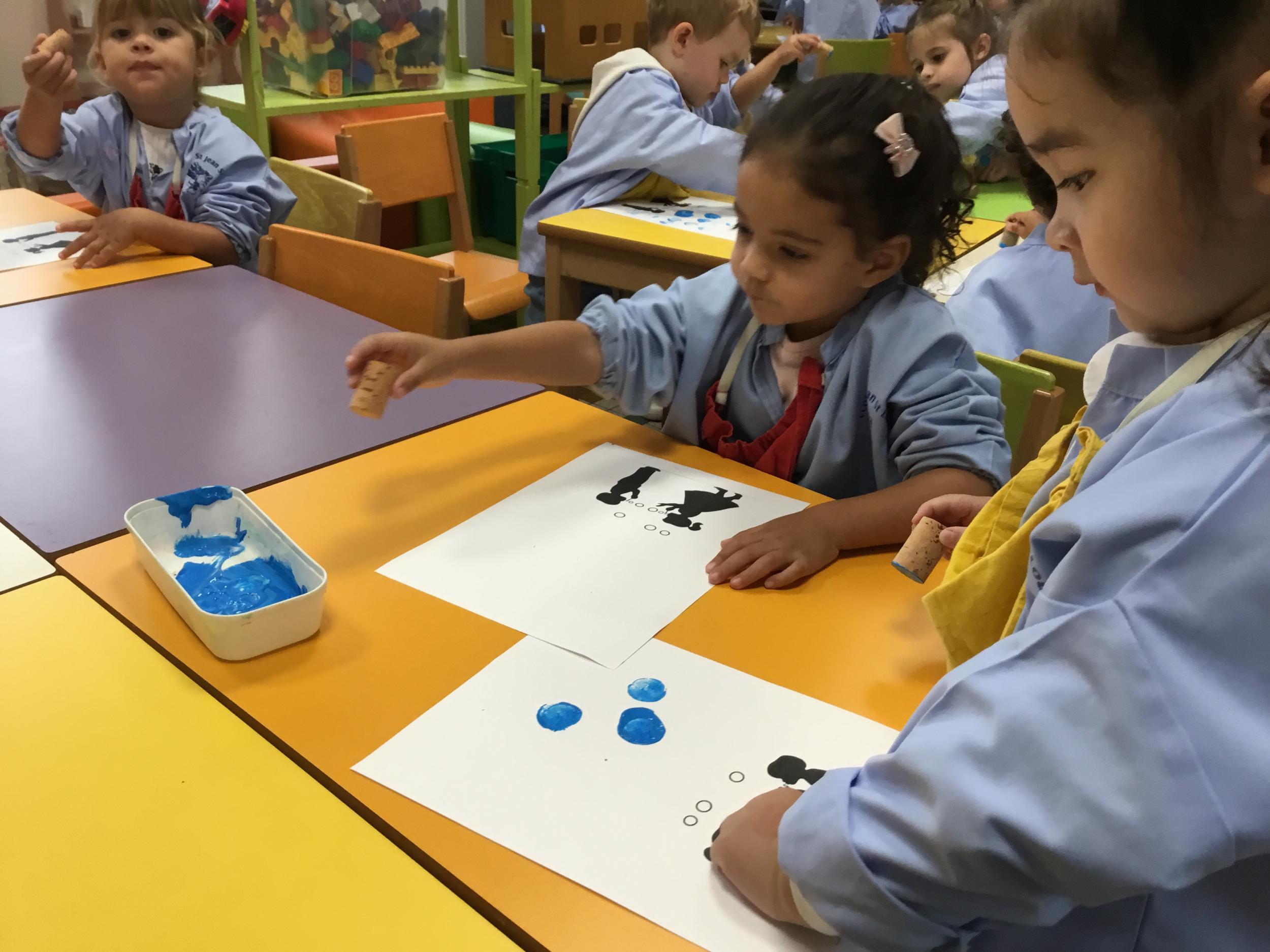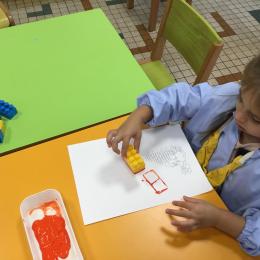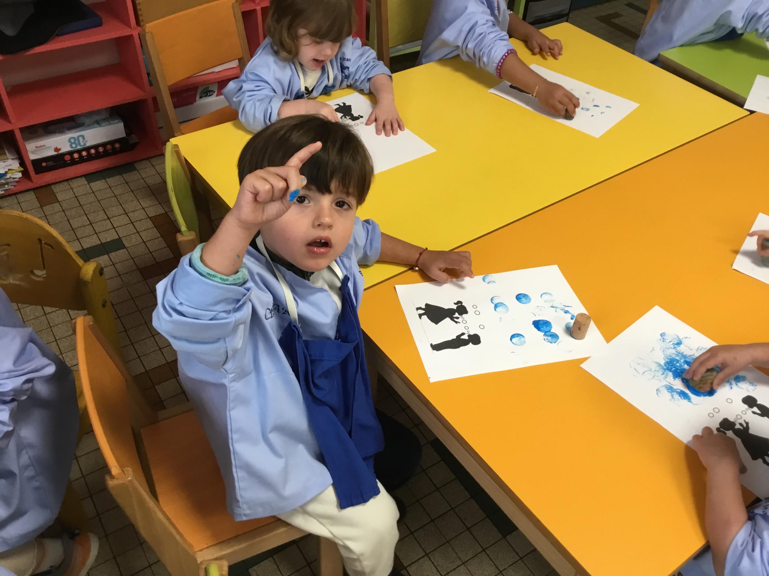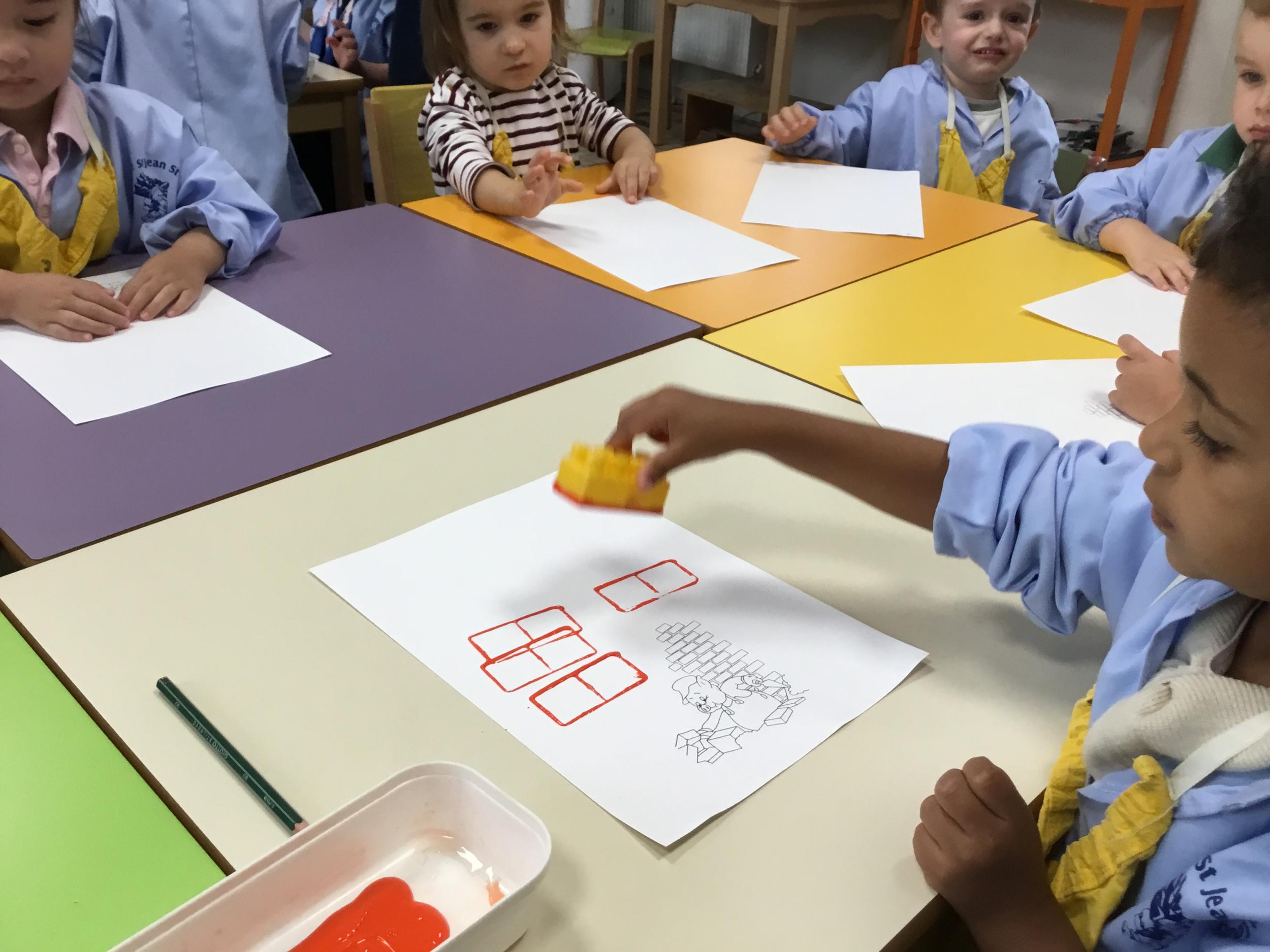 Cette période les élèves expérimentent des différents outils pour laisser des traces. Il faut s’approprier l’espace de la feuille et maîtriser son geste: poser et lever l’outil pour le reposer à un autre endroit de la feuille. Ils ont utilisé des légos et des bouchons, d’autres outils sont à venir.