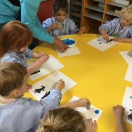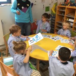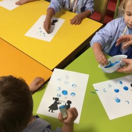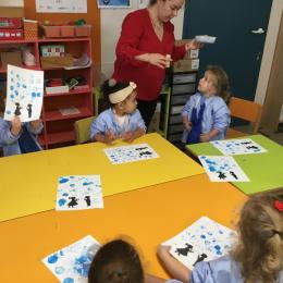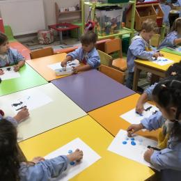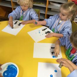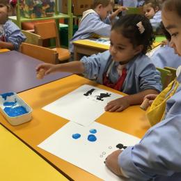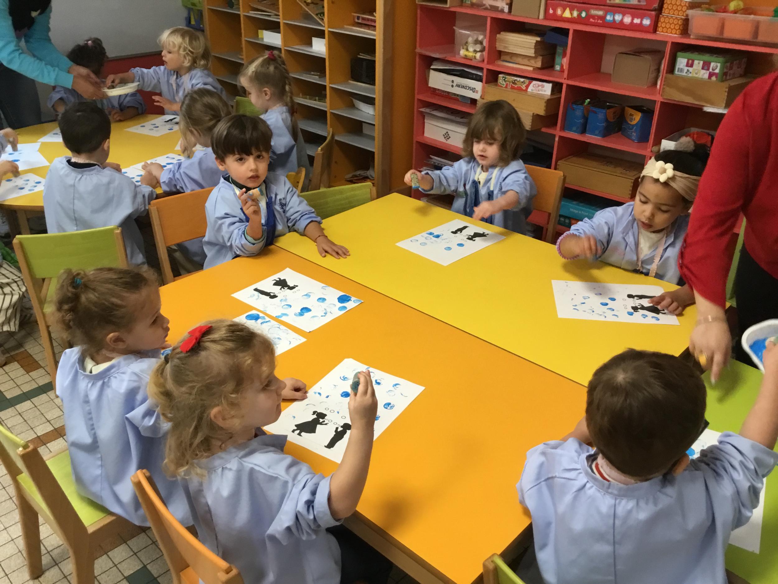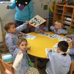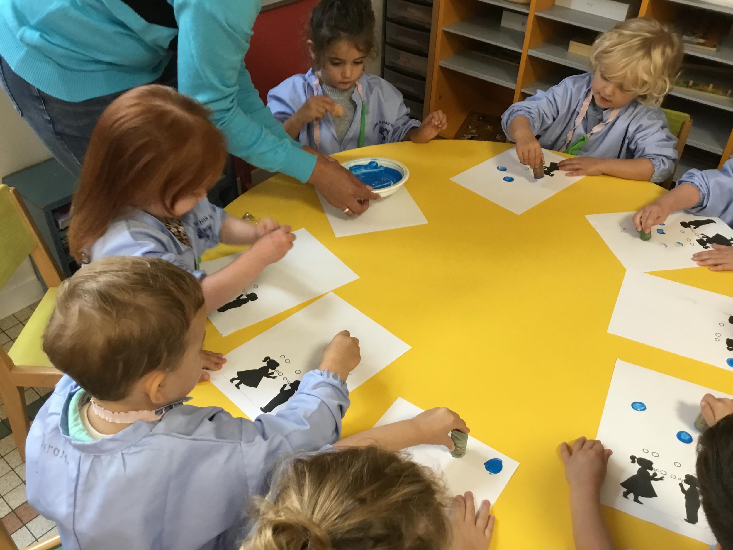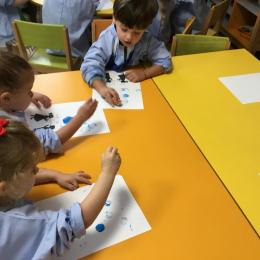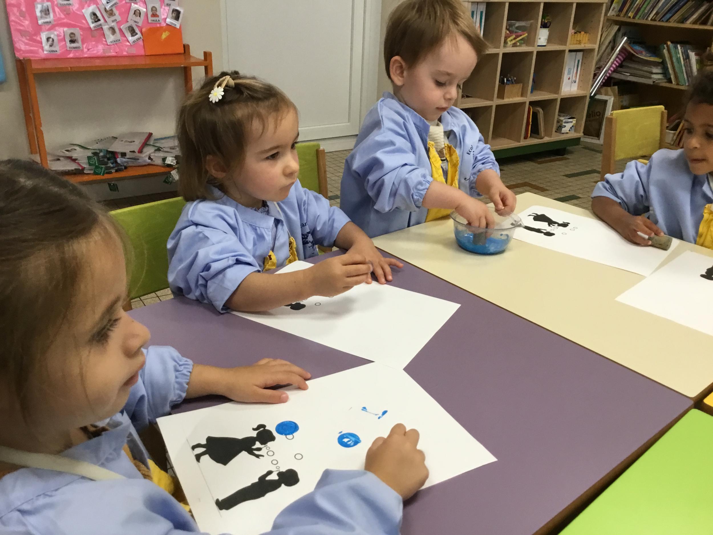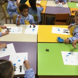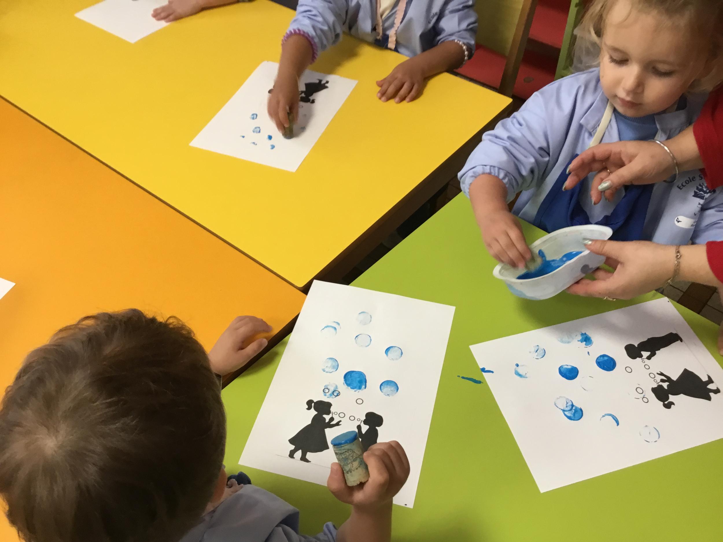 Cette période les élèves expérimentent des différents outils pour laisser des traces. Il faut s’approprier l’espace de la feuille et maîtriser son geste: poser et lever l’outil pour le reposer à un autre endroit de la feuille. Ils ont utilisé des légos et des bouchons, d’autres outils sont à venir.