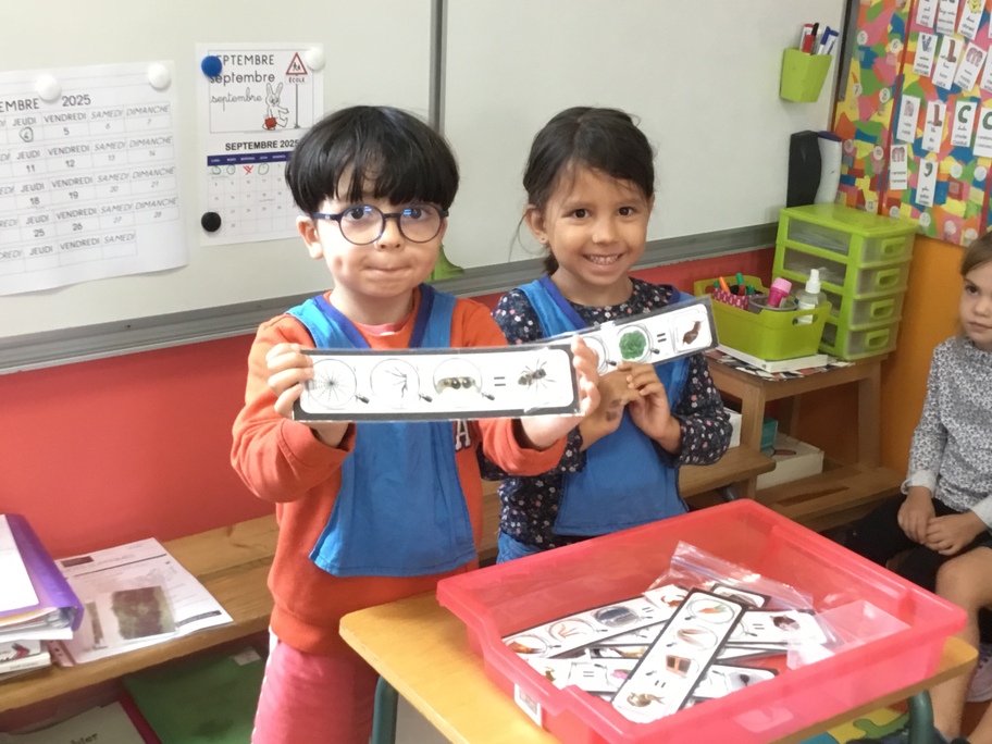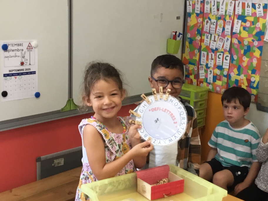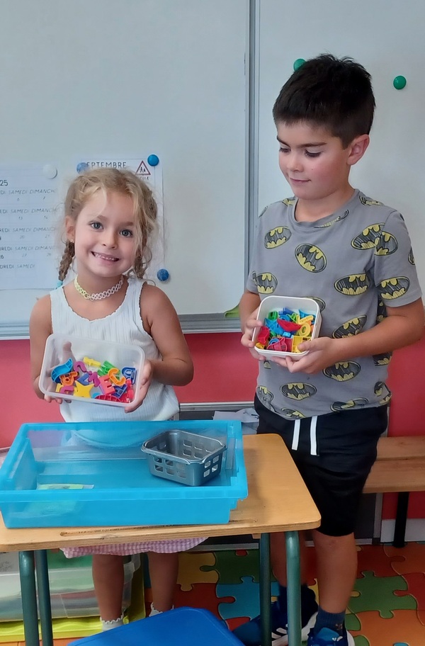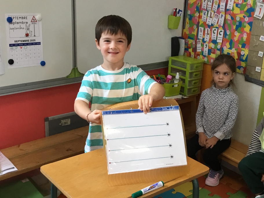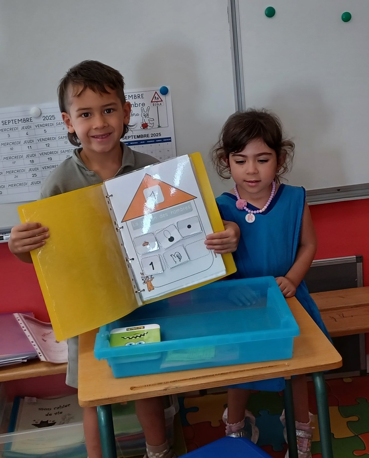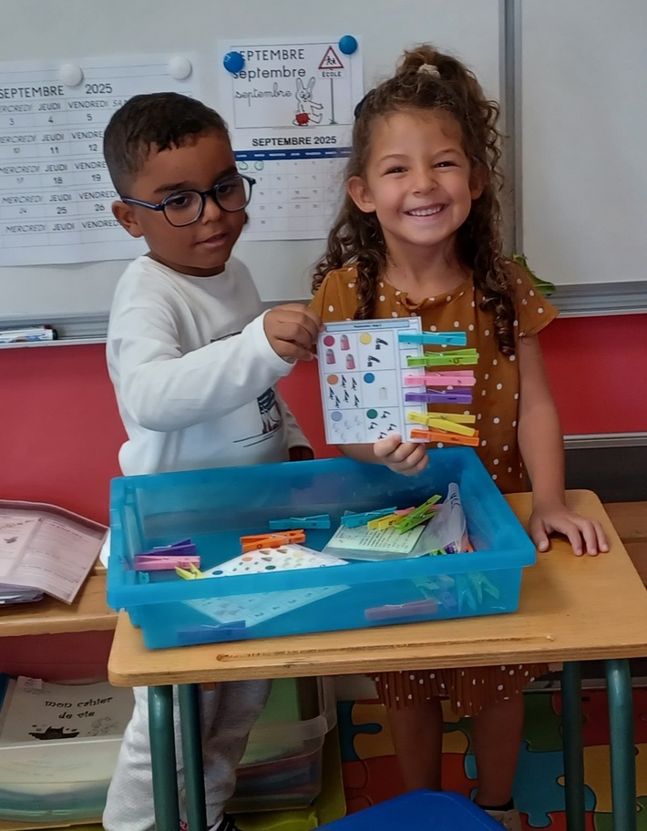 Les élèves ont découvert ces premiers jours les différents ateliers barquettes de type Montessori qu'il y a dans la classe. Nous considérons que les enfants apprennent plus facilement de façon ludique. C'est pour cette raison qu'ils disposent de nombreux ateliers regroupant les différents domaines d'apprentissages. Le matin, plus d'une heure sera consacrée à ces jeux. Les élèves disposeront d'un plan de travail pour se repérer : une grande feuille sur laquelle tous les jeux sont représentés. Ainsi, ils choisissent celui qu'ils ont envie de faire, s'entrainent, puis nous montrent et nous expliquent ce qu'ils ont fait. Si l'on considère l'apprentissage sous-jacent à l'activité suffisamment acquis, les élèves reçoivent un brevet qu'ils vont coller dans leur cahier des brevets. Ce cahier se présente sous la forme d'un répertoire avec un code couleur selon le domaine travaillé : jaune pour tout ce qui touche à la langue orale et le graphisme, blanc pour la découverte du monde, des objets et du vivant, vert pour la construction des nombres, bleu pour le travail dans l'espace et le temps, orange pour l'art visuel, rose pour les activités motrices.