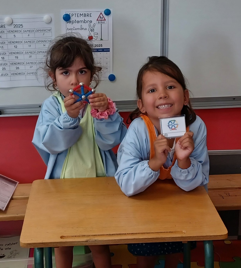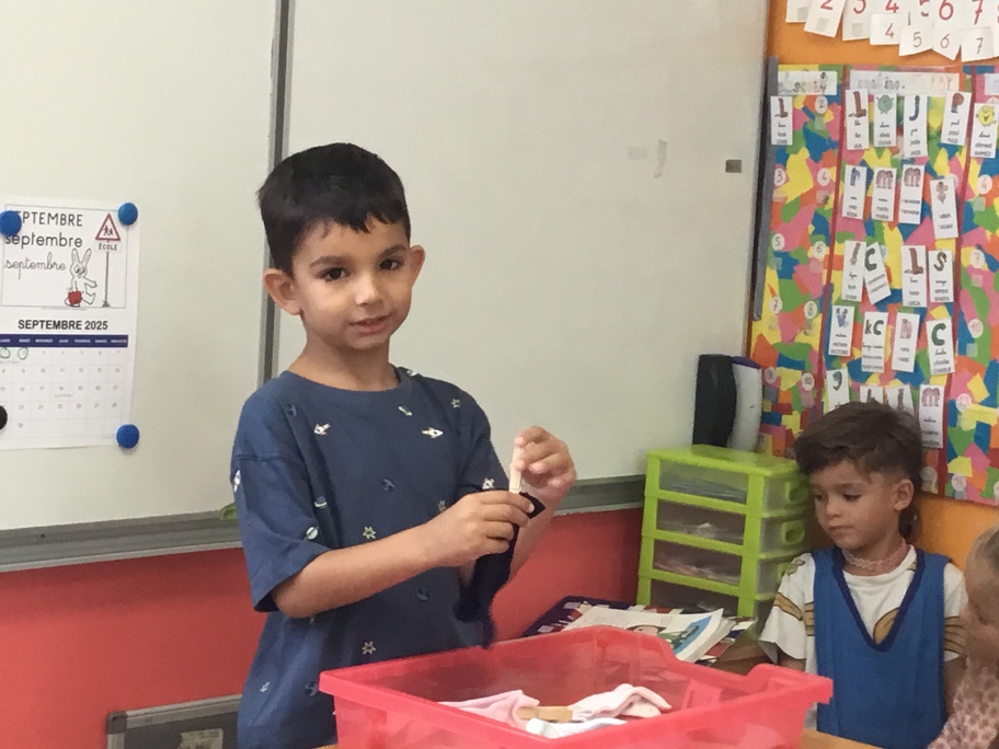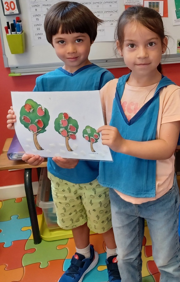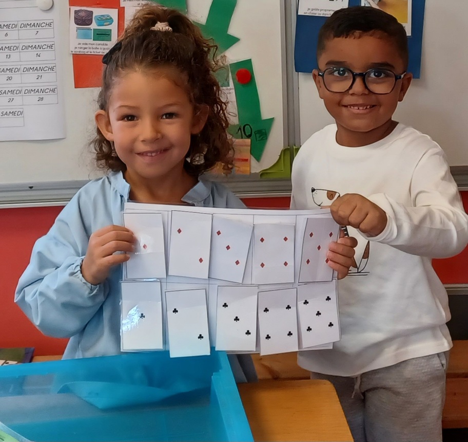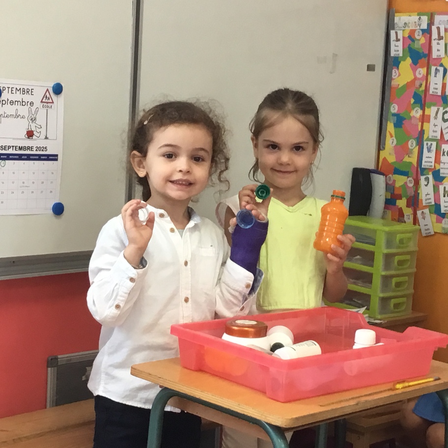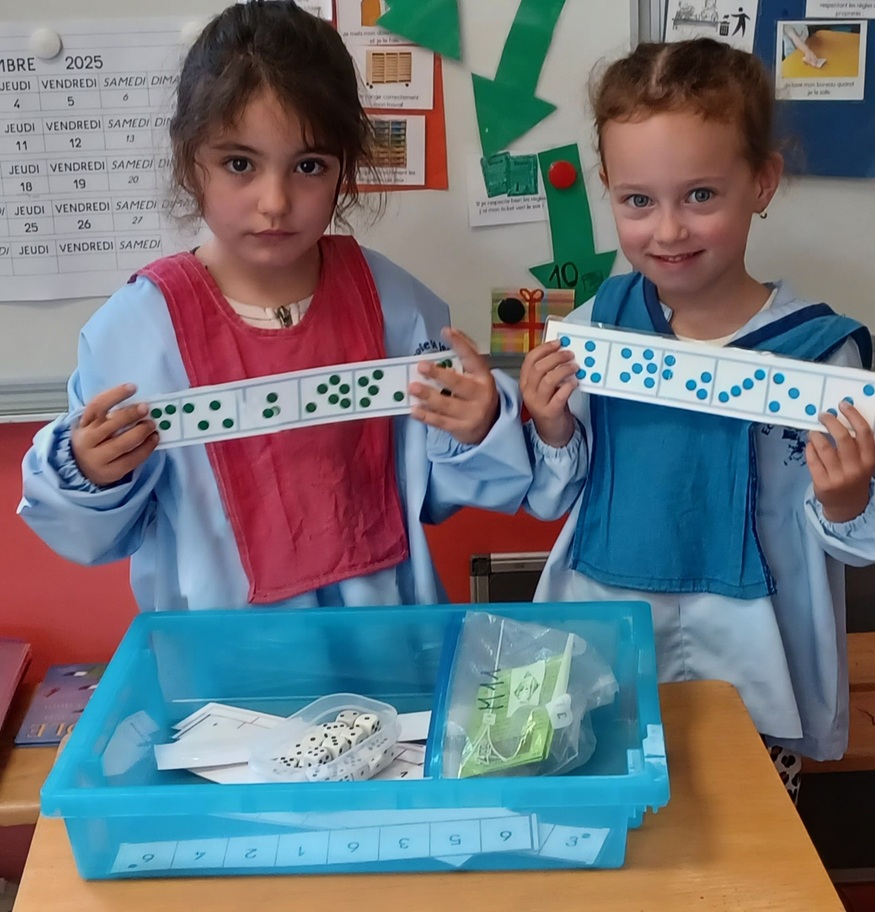 Les élèves ont découvert ces premiers jours les différents ateliers barquettes de type Montessori qu'il y a dans la classe. Nous considérons que les enfants apprennent plus facilement de façon ludique. C'est pour cette raison qu'ils disposent de nombreux ateliers regroupant les différents domaines d'apprentissages. Le matin, plus d'une heure sera consacrée à ces jeux. Les élèves disposeront d'un plan de travail pour se repérer : une grande feuille sur laquelle tous les jeux sont représentés. Ainsi, ils choisissent celui qu'ils ont envie de faire, s'entrainent, puis nous montrent et nous expliquent ce qu'ils ont fait. Si l'on considère l'apprentissage sous-jacent à l'activité suffisamment acquis, les élèves reçoivent un brevet qu'ils vont coller dans leur cahier des brevets. Ce cahier se présente sous la forme d'un répertoire avec un code couleur selon le domaine travaillé : jaune pour tout ce qui touche à la langue orale et le graphisme, blanc pour la découverte du monde, des objets et du vivant, vert pour la construction des nombres, bleu pour le travail dans l'espace et le temps, orange pour l'art visuel, rose pour les activités motrices.