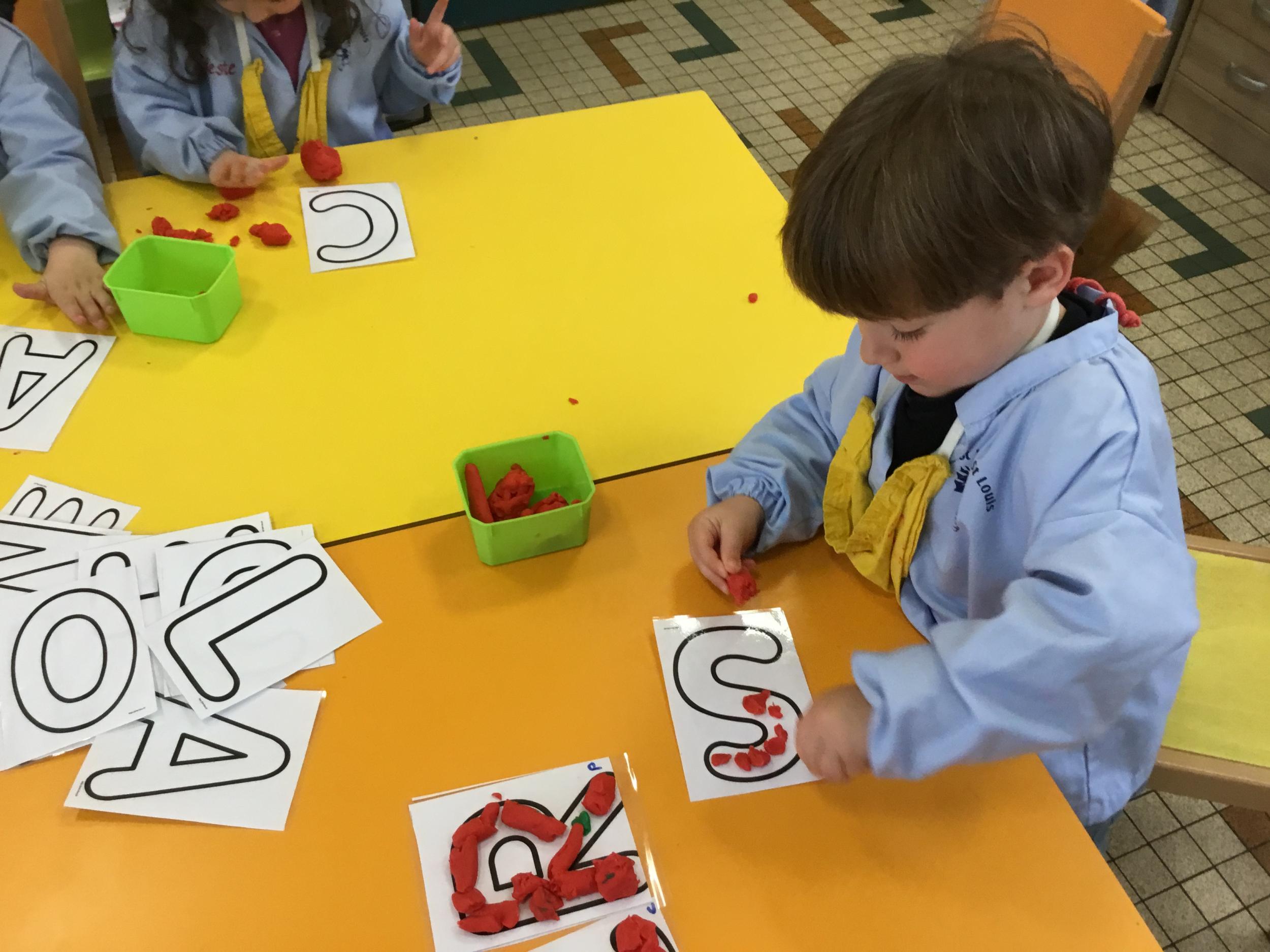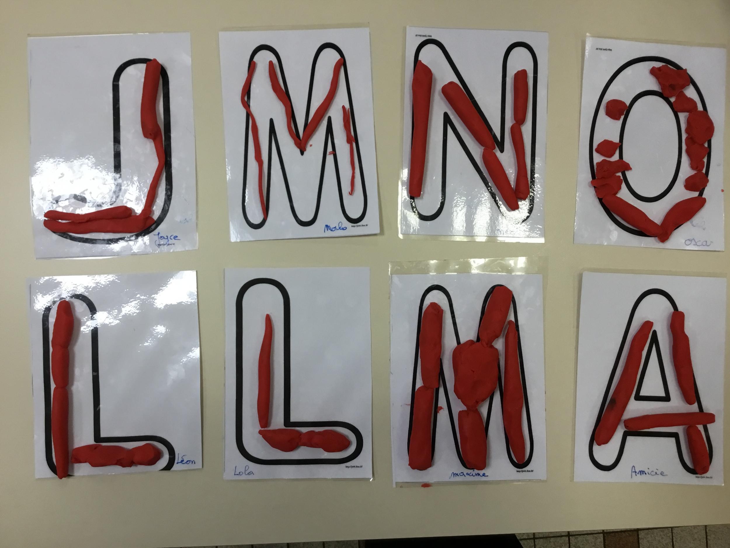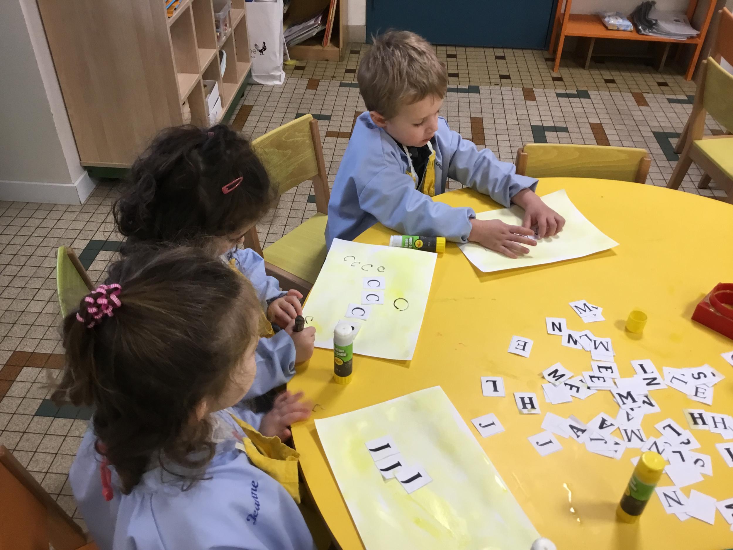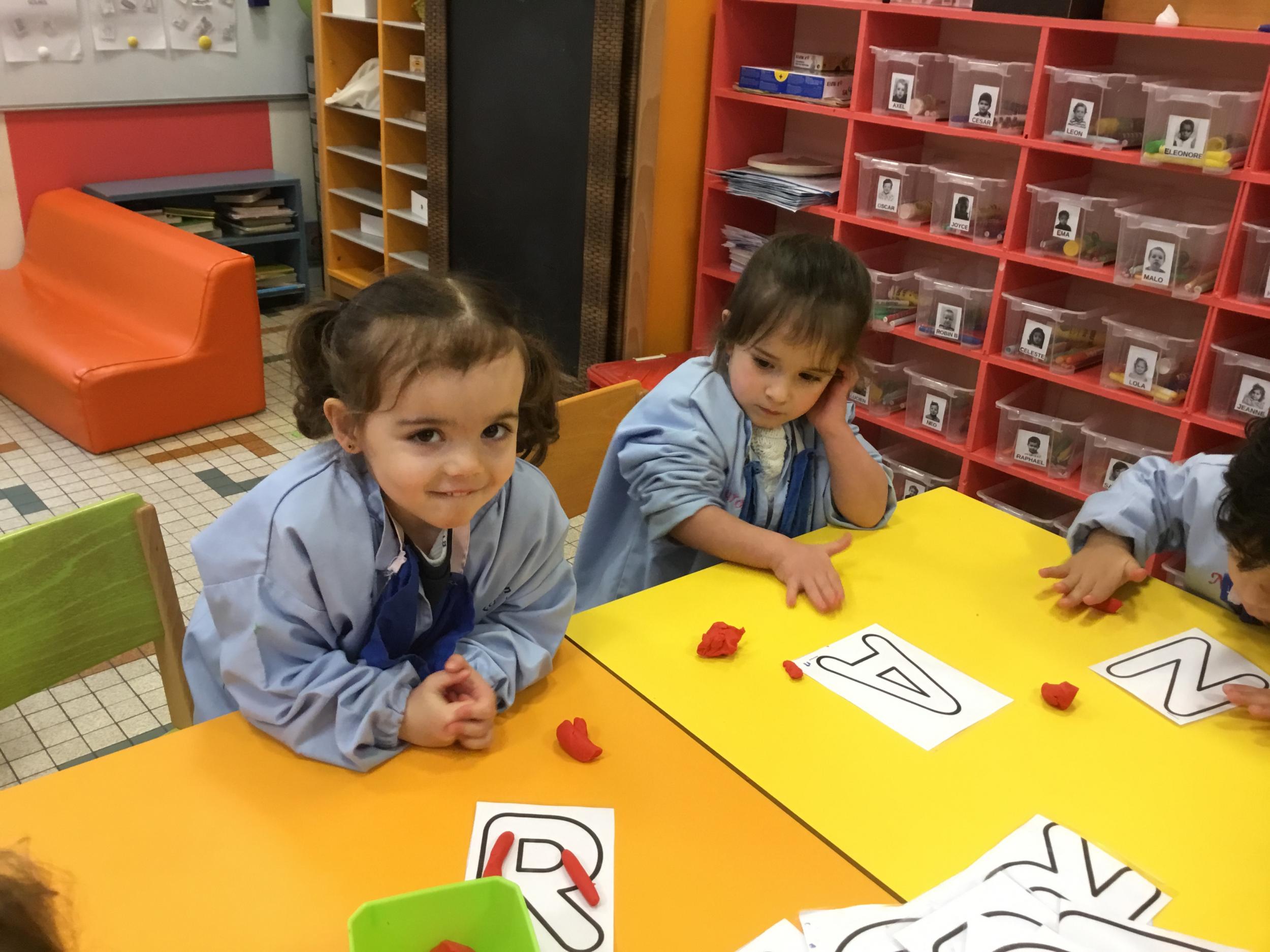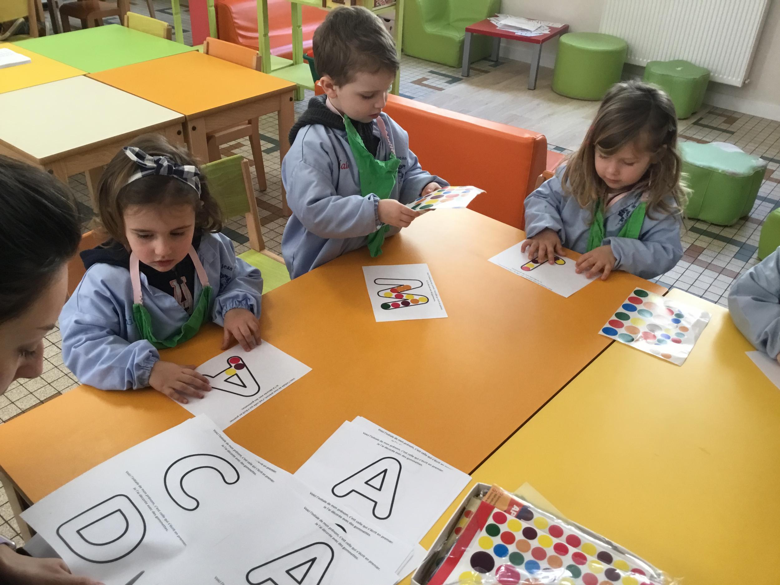 Depuis le début de la période les élèves travaillent autour de leur prénom et de leur initiale. Différents ateliers leur permettent d’appréhender l’écrit de leur initiale.