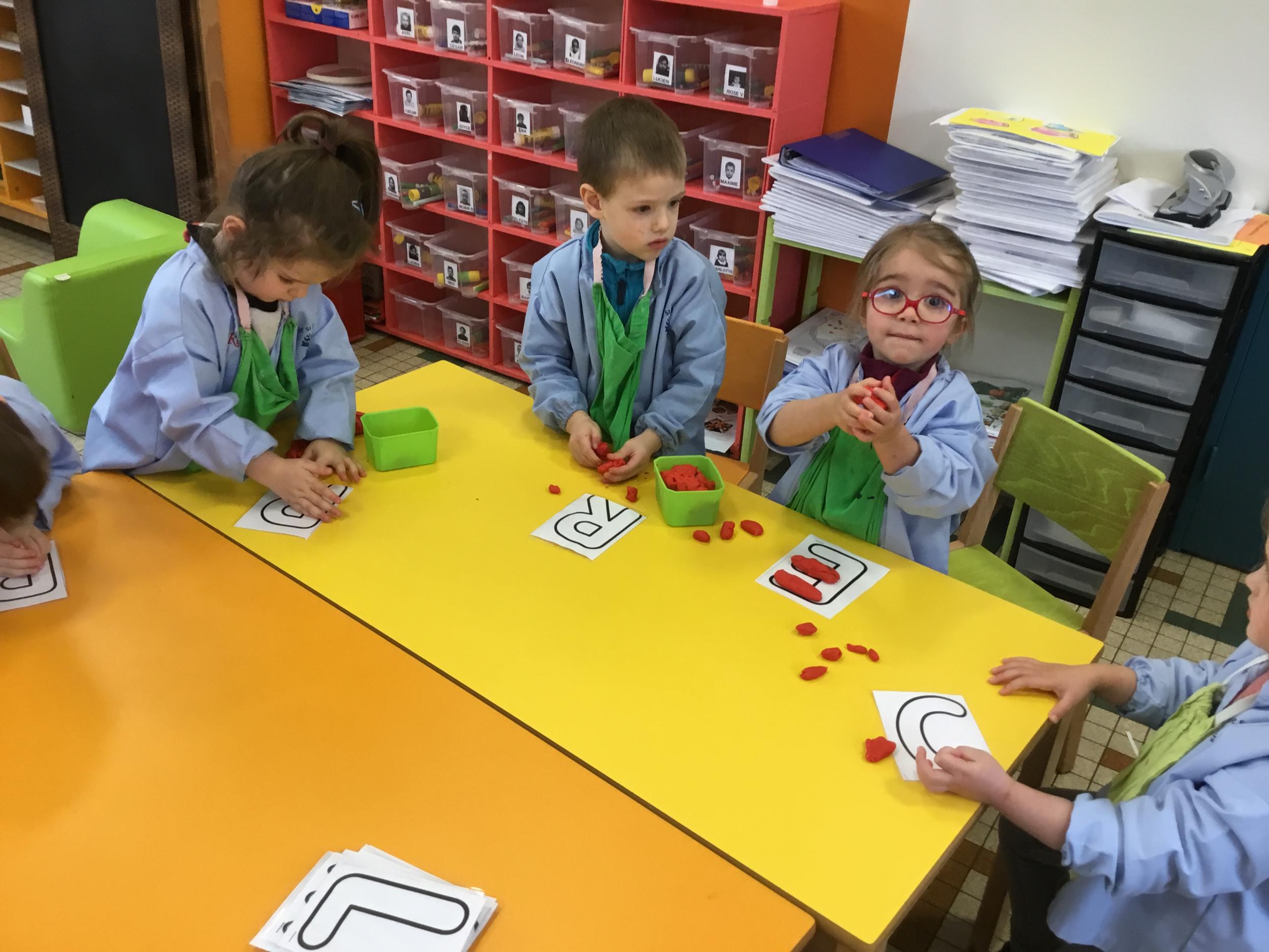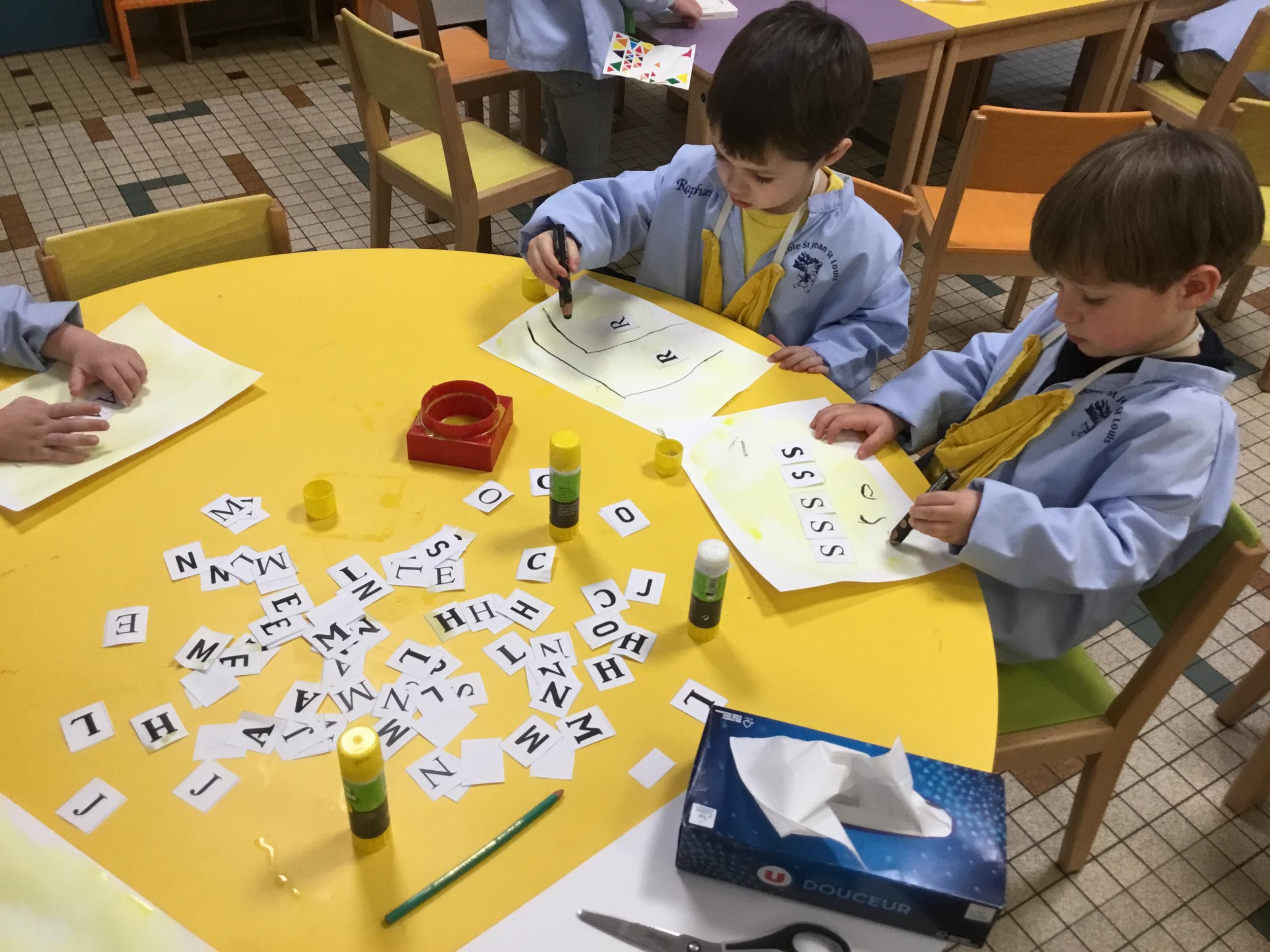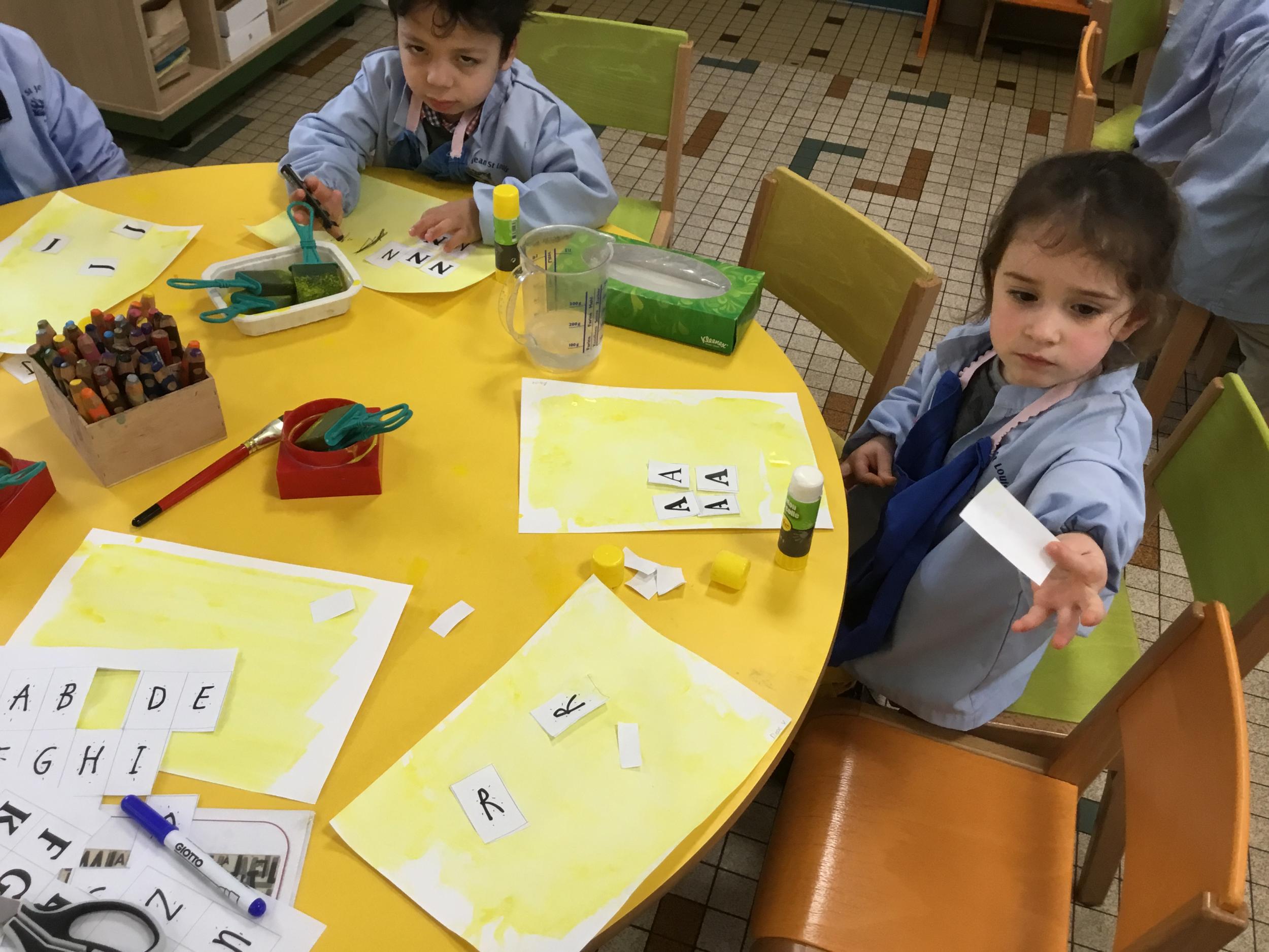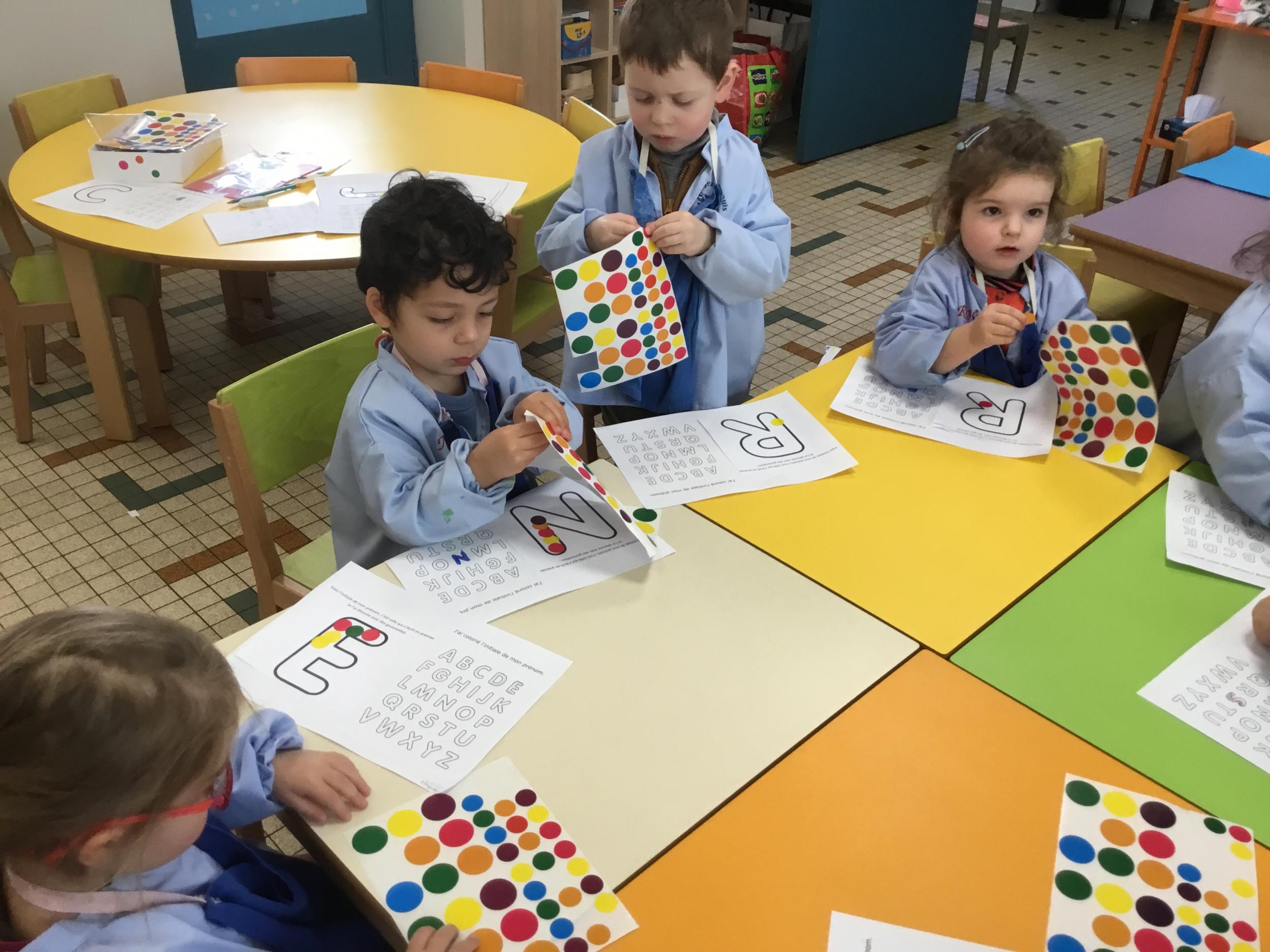 Depuis le début de la période les élèves travaillent autour de leur prénom et de leur initiale. Différents ateliers leur permettent d’appréhender l’écrit de leur initiale.
