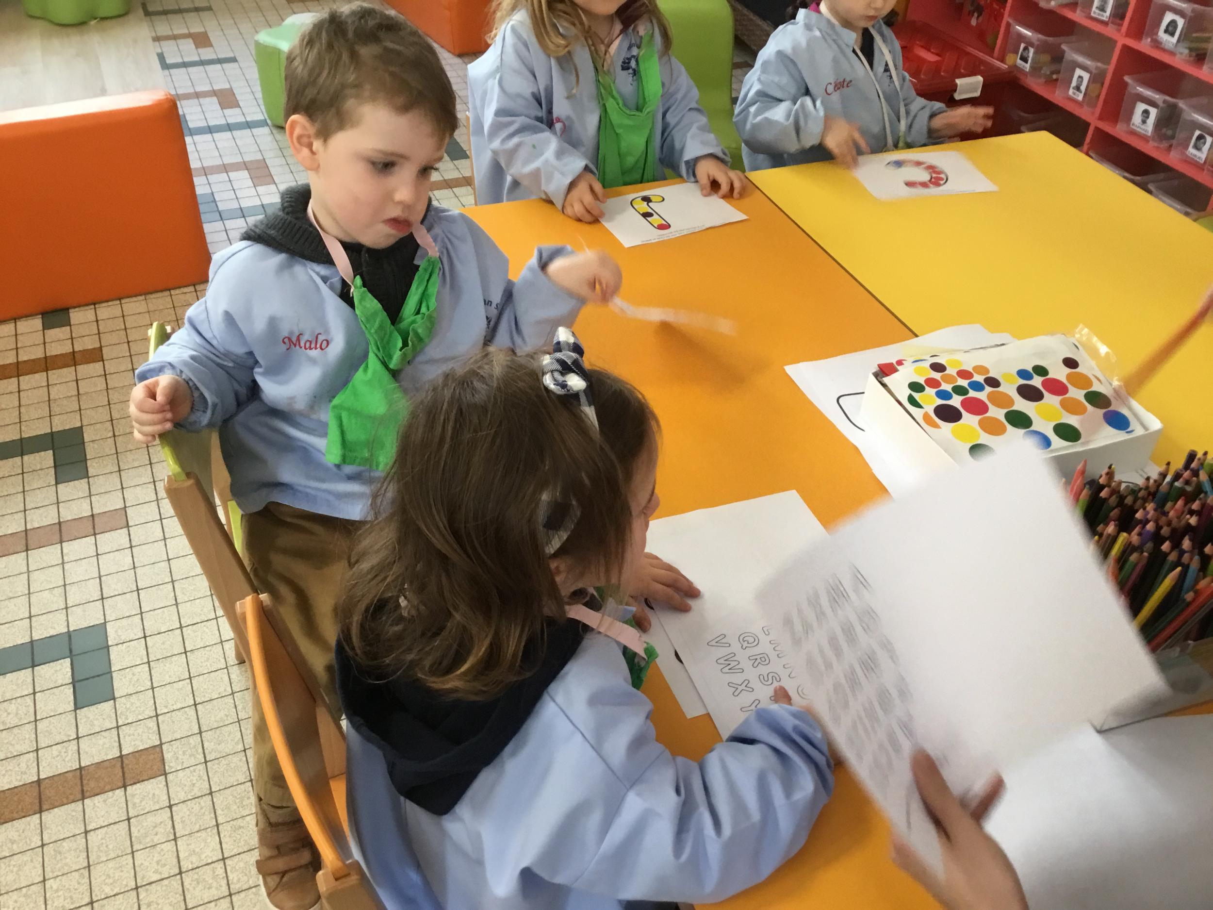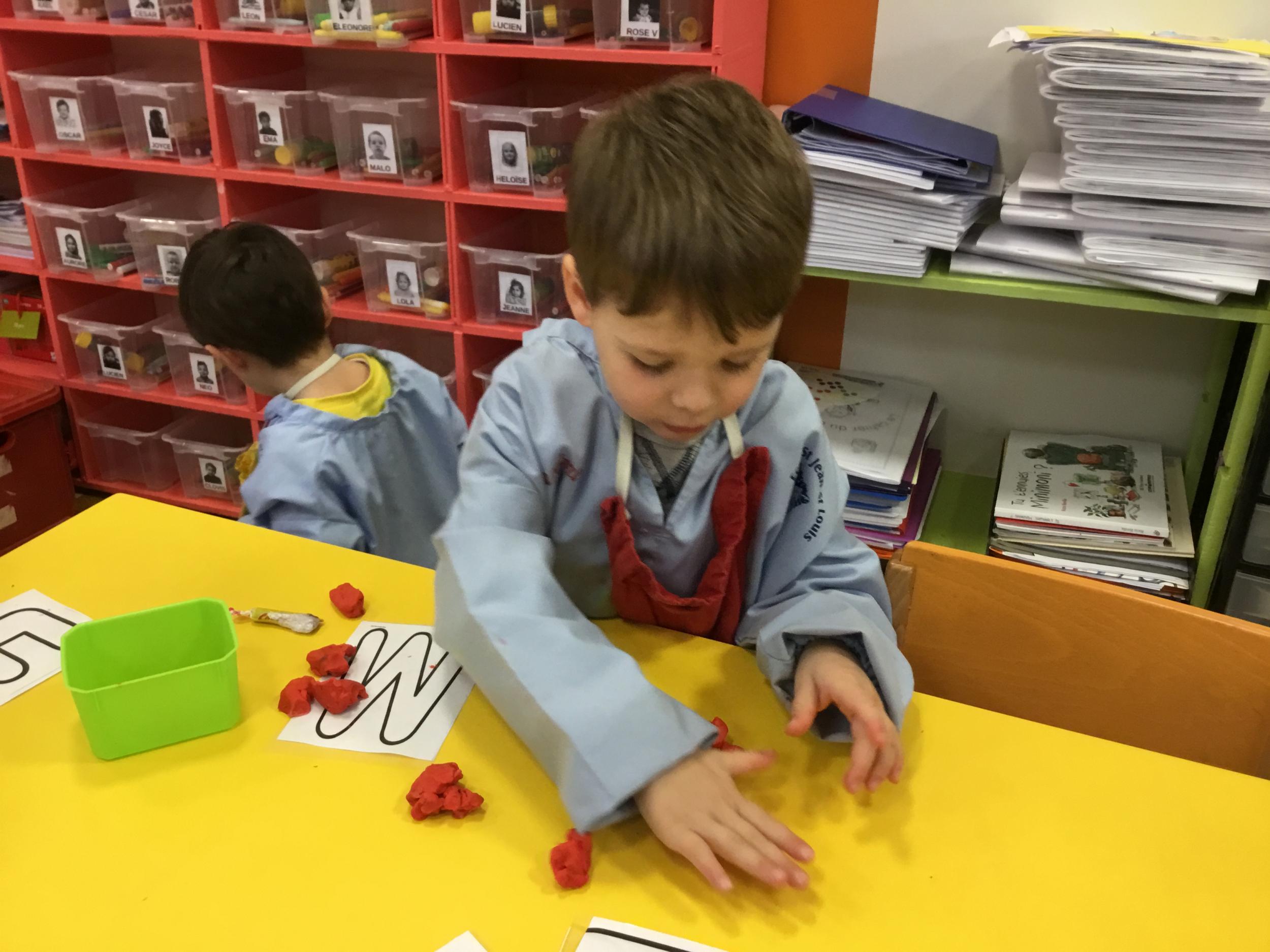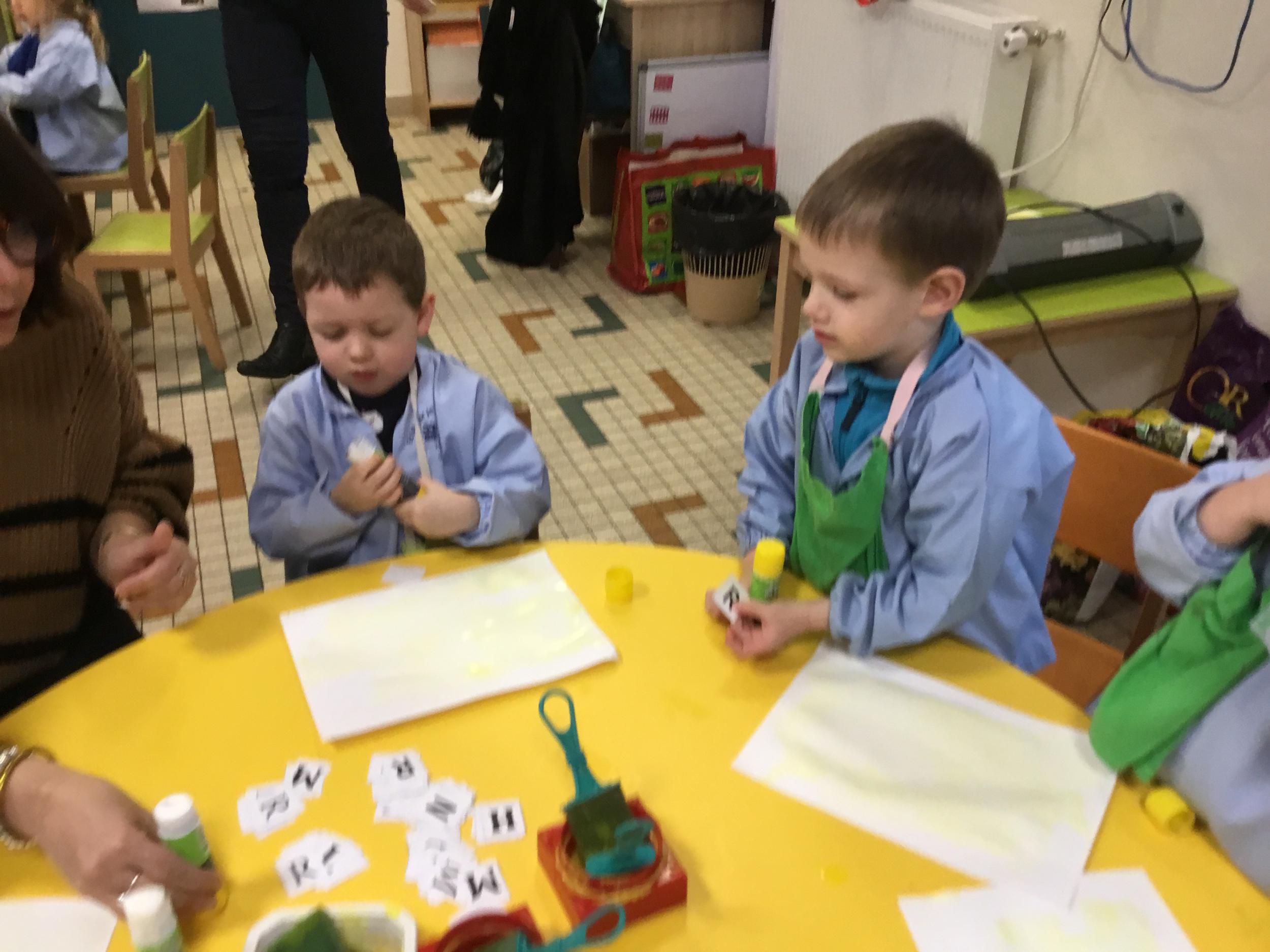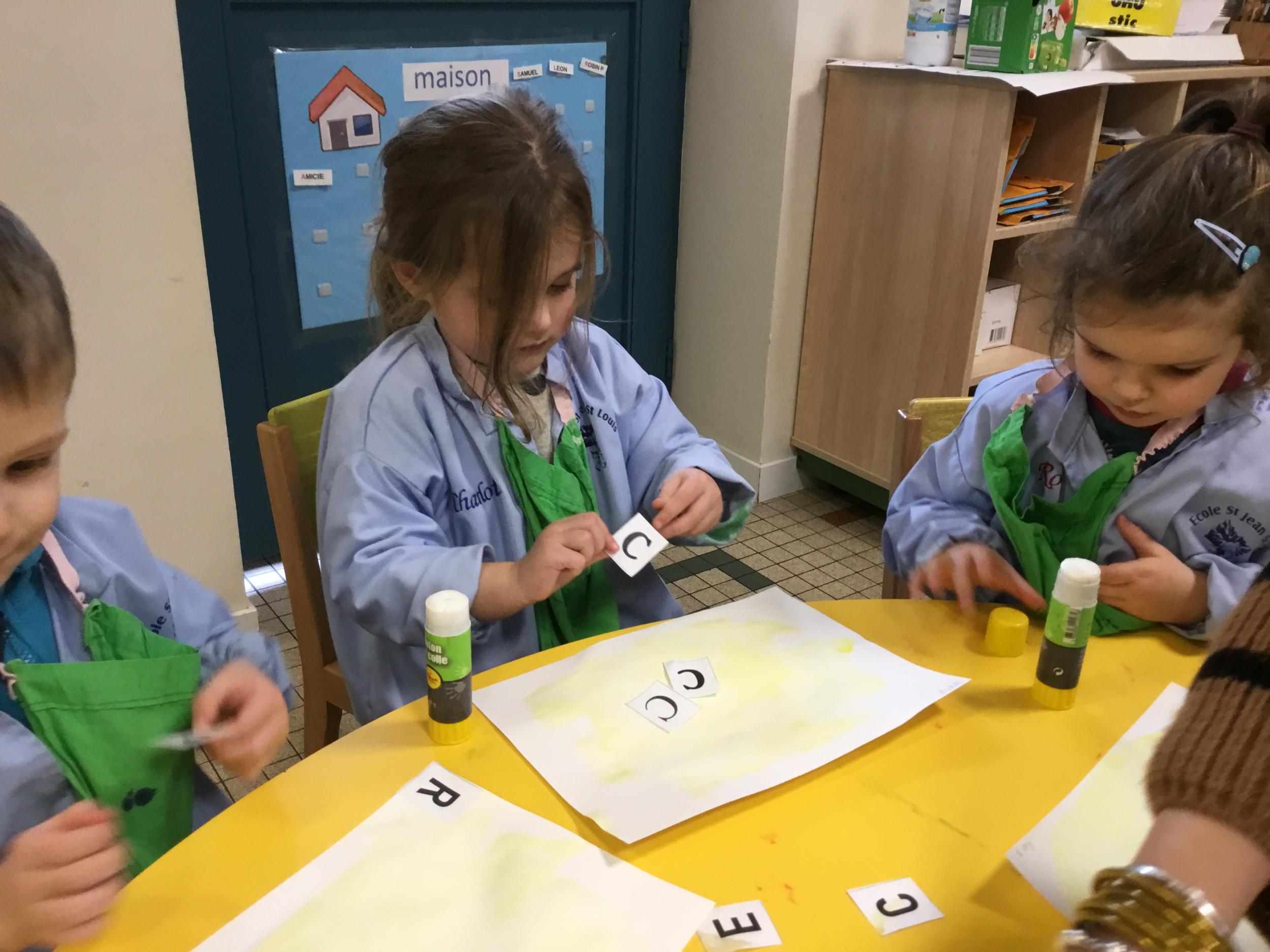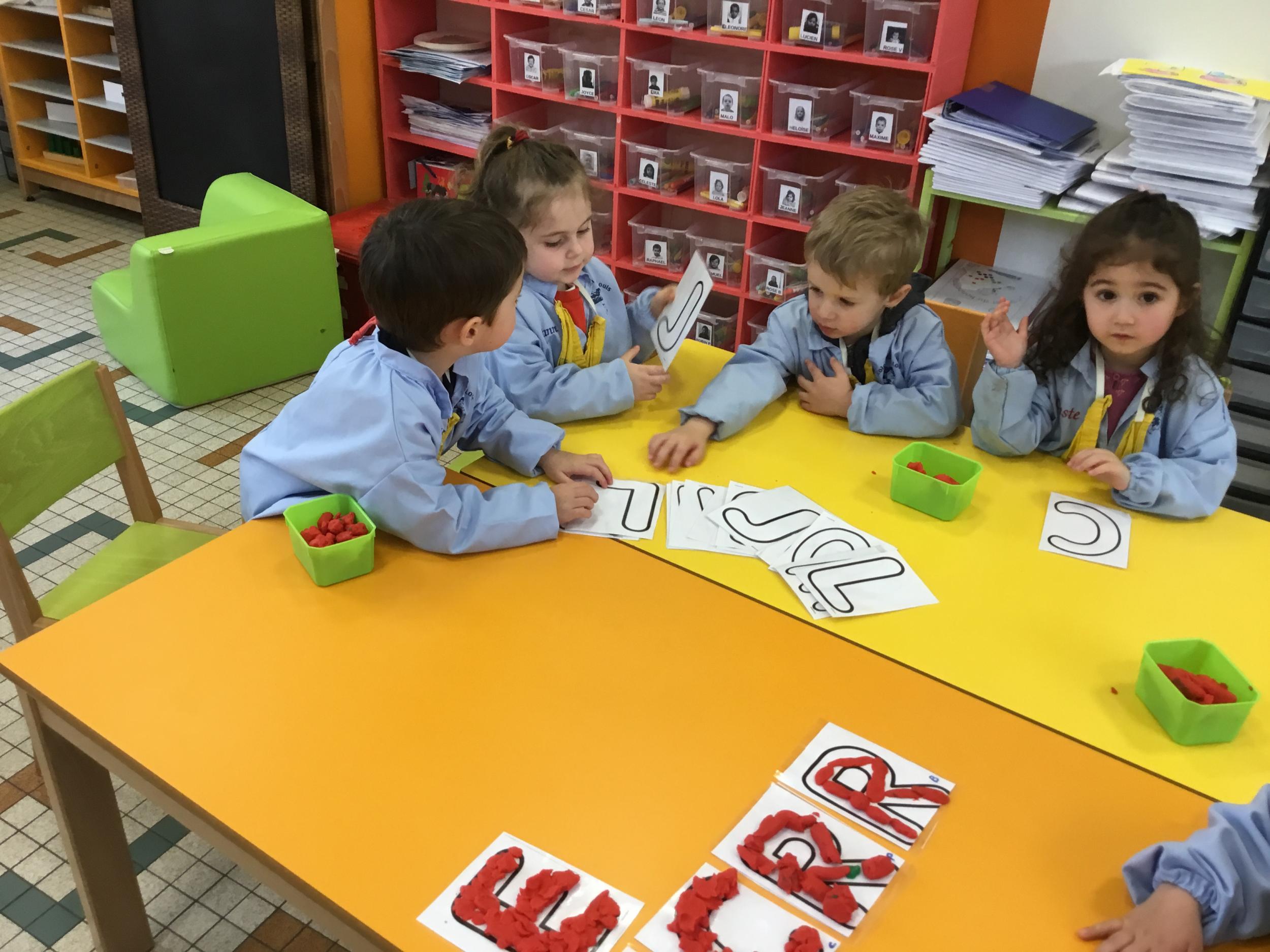 Depuis le début de la période les élèves travaillent autour de leur prénom et de leur initiale. Différents ateliers leur permettent d’appréhender l’écrit de leur initiale.