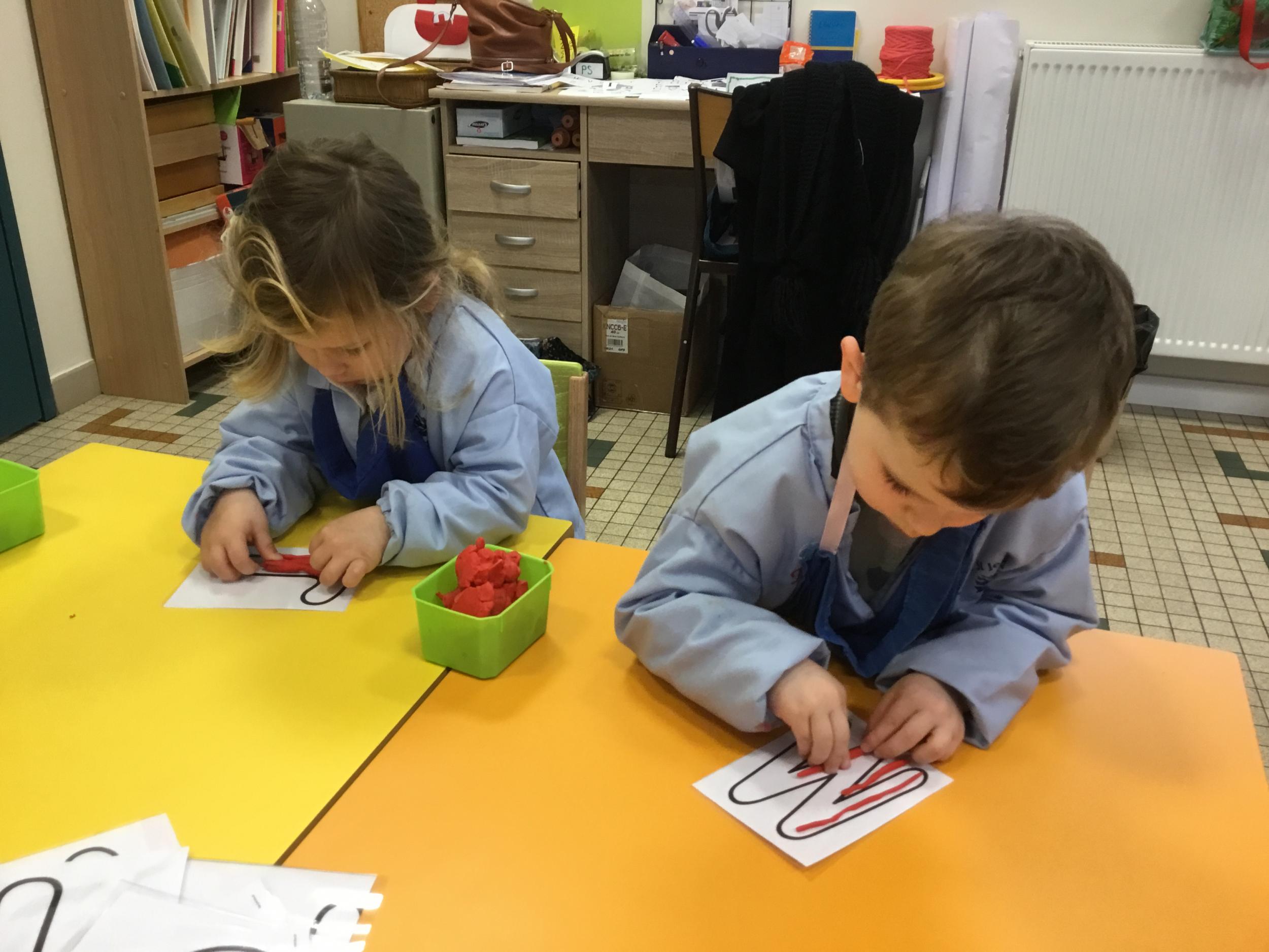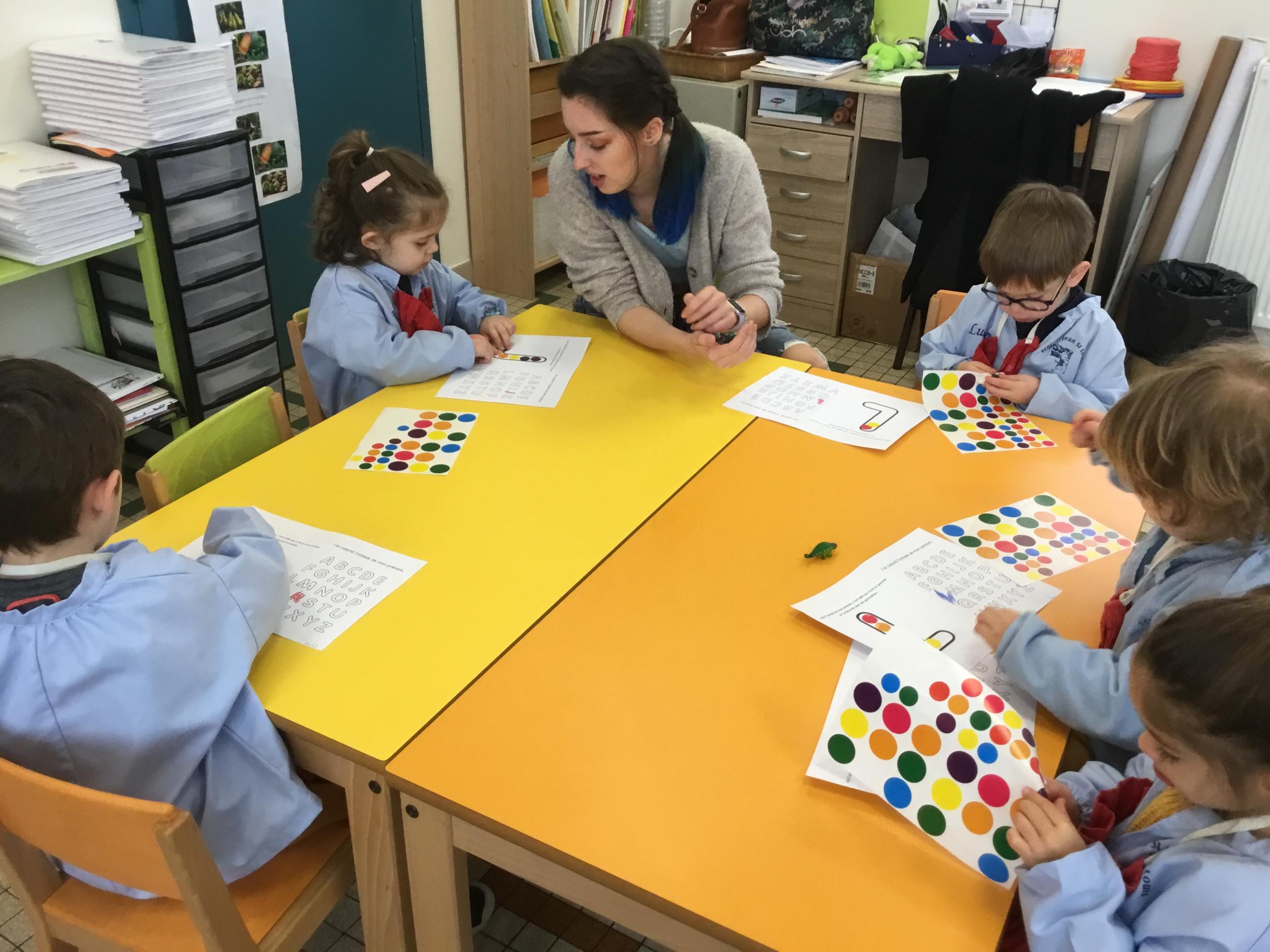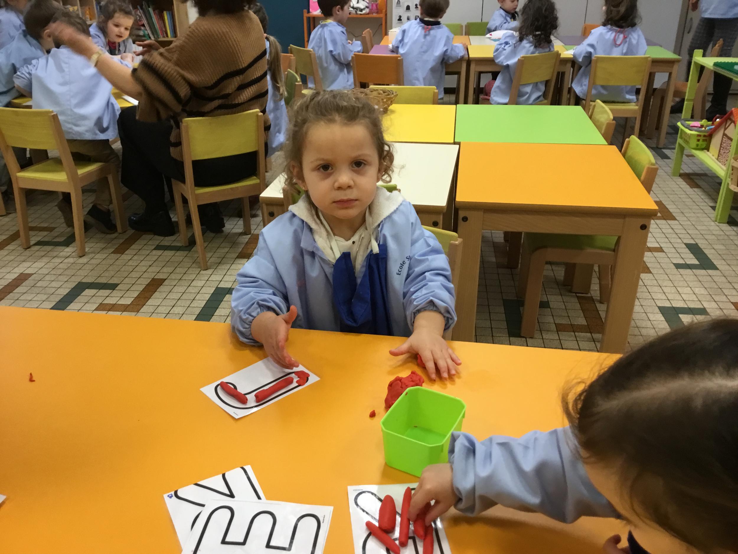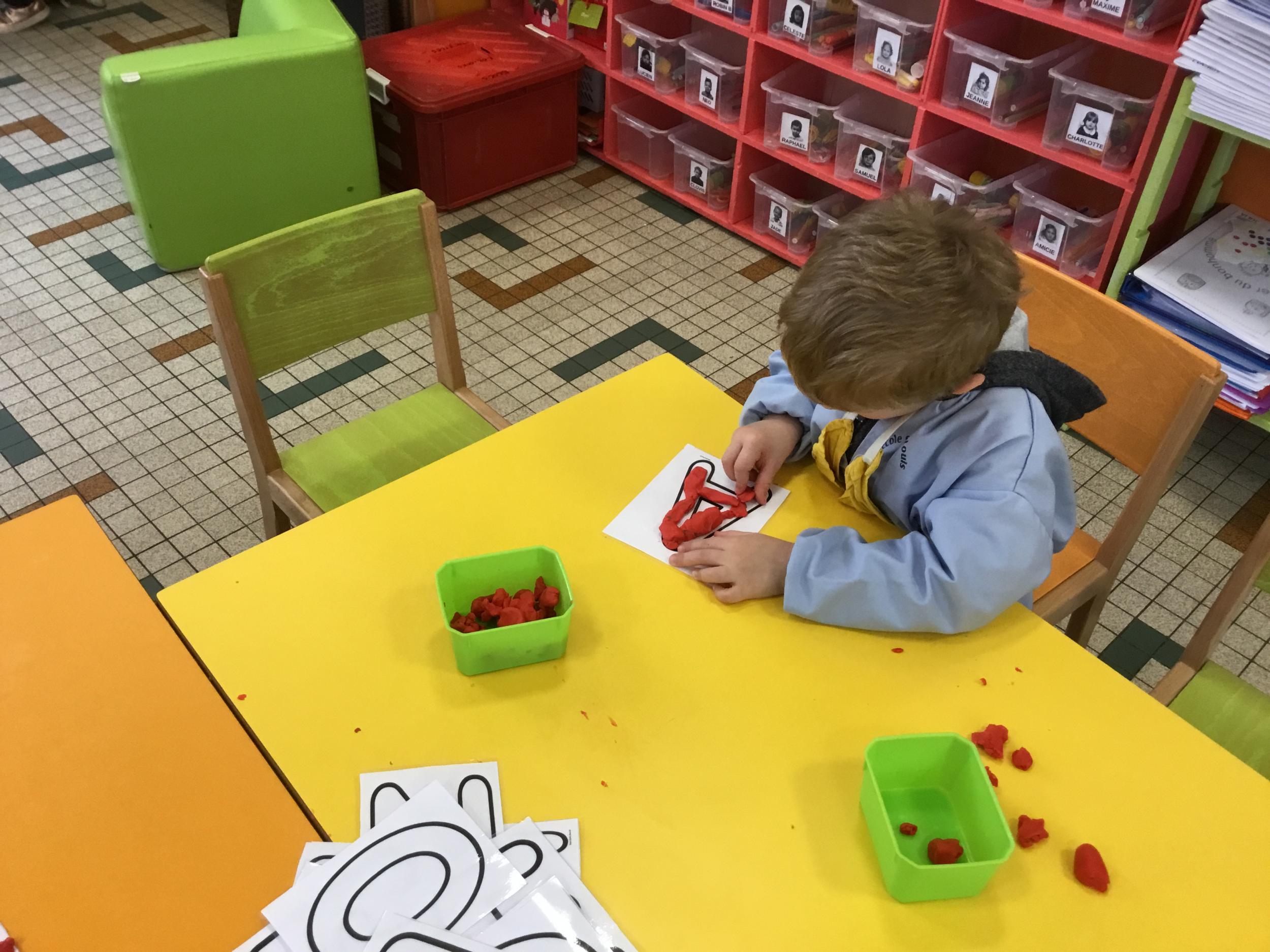 Depuis le début de la période les élèves travaillent autour de leur prénom et de leur initiale. Différents ateliers leur permettent d’appréhender l’écrit de leur initiale.
