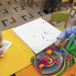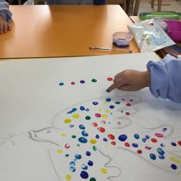 Cette semaine les élèves ont réalisé une œuvre collective. Chaque enfant a choisi une couleur et a rempli le corps de la colombe avec l’ empreinte de leur index. Puis ils ont signé l’œuvre de leur petit doigt.