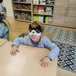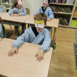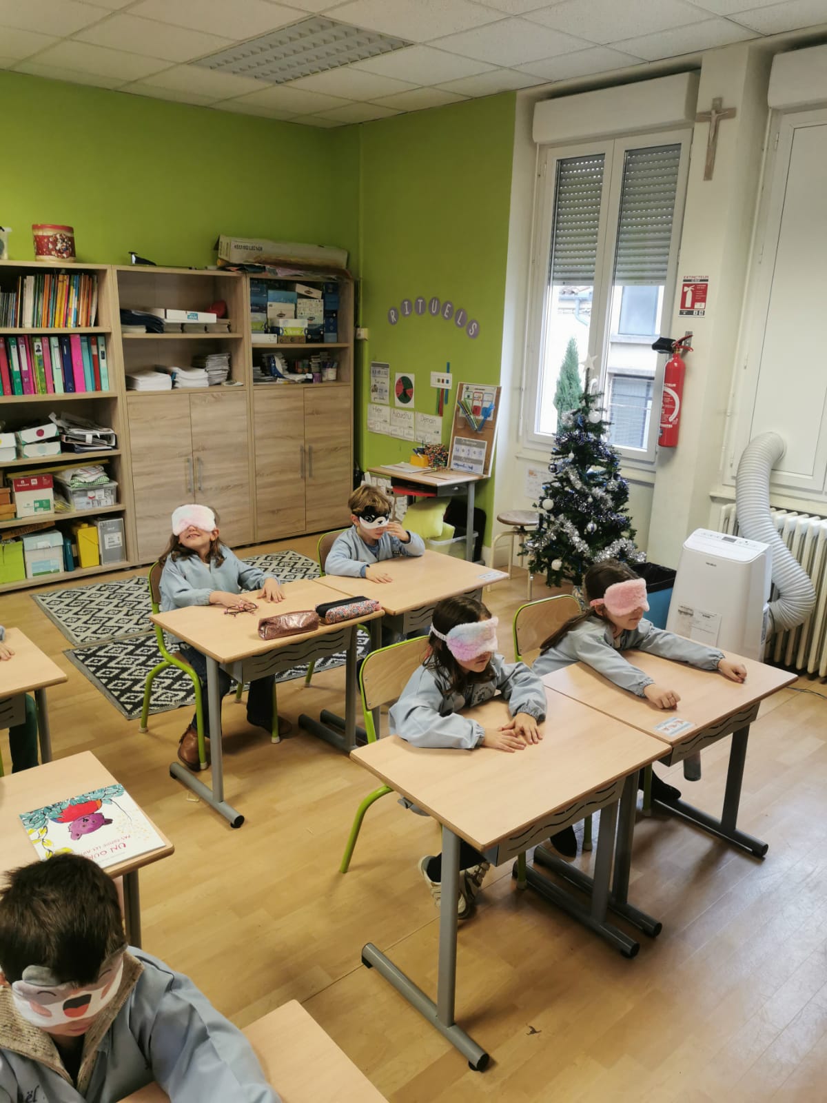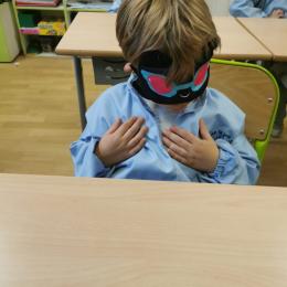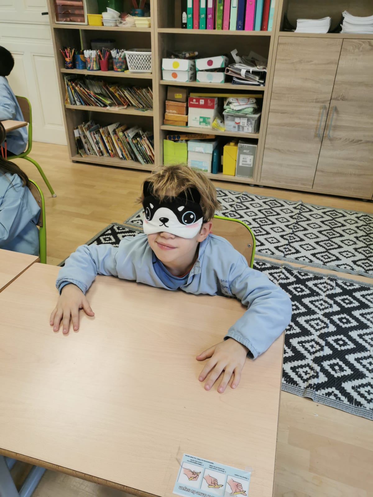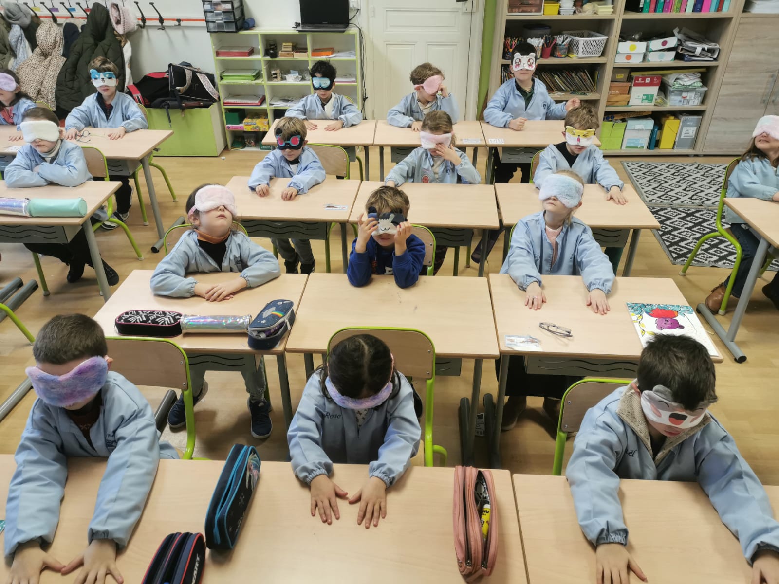 La maîtresse a acheté des masques rigolos pour aider certains élèves qui avaient des difficultés à fermer les yeux.