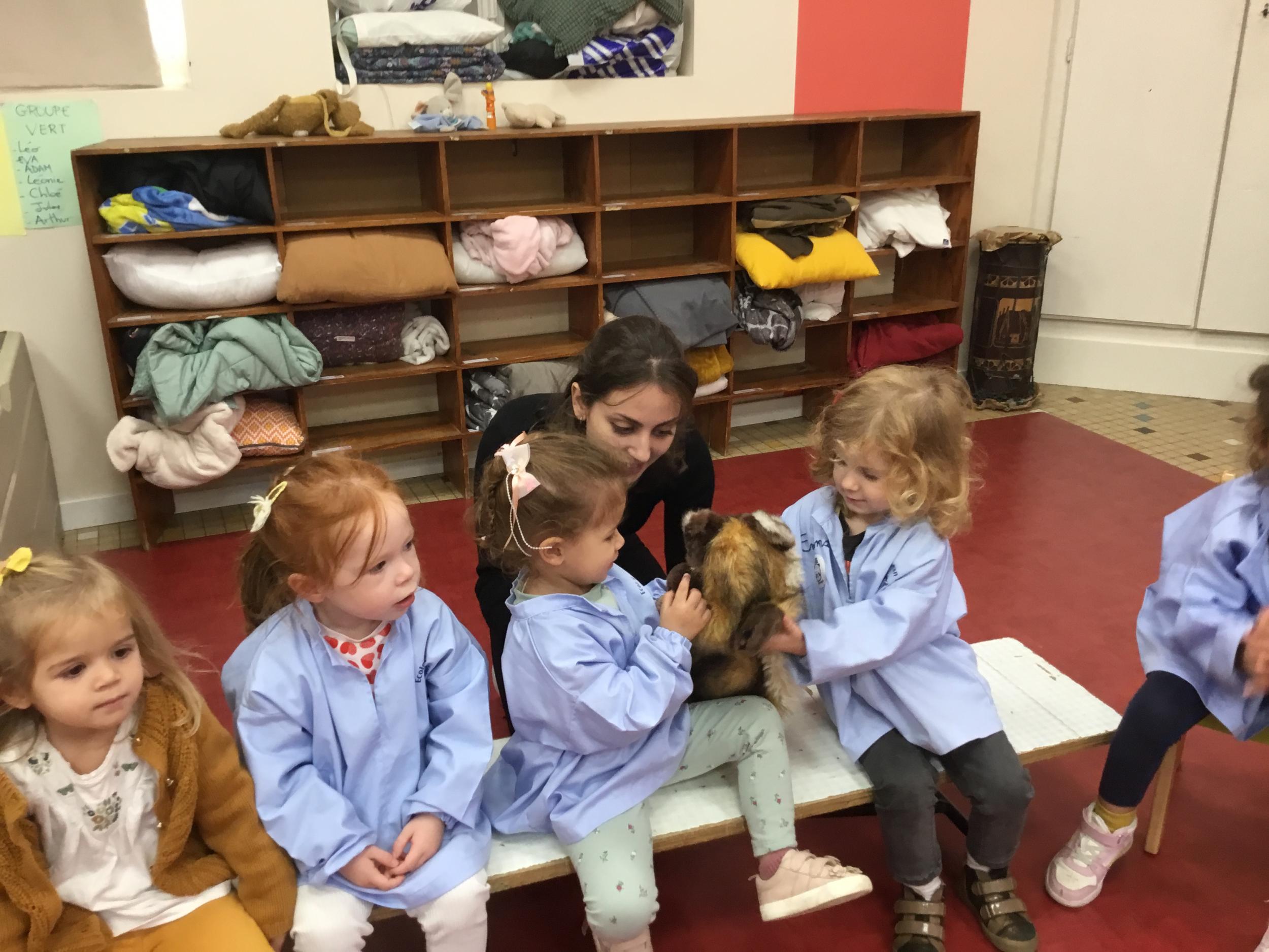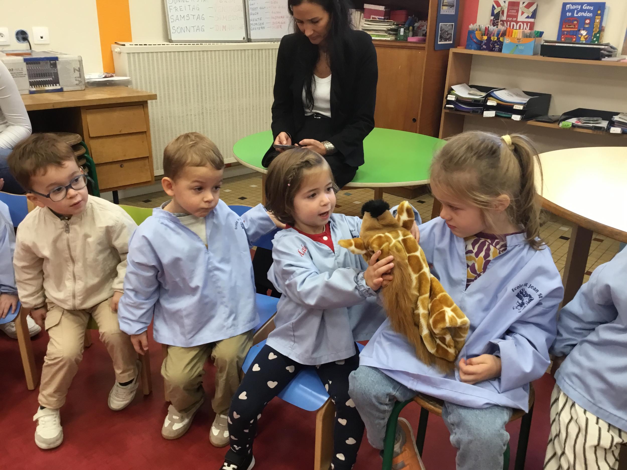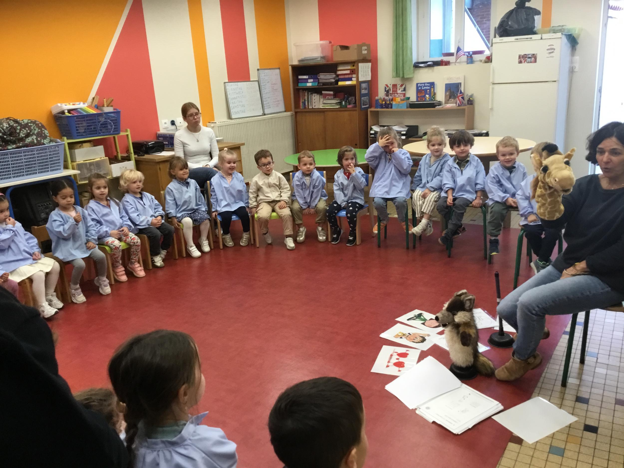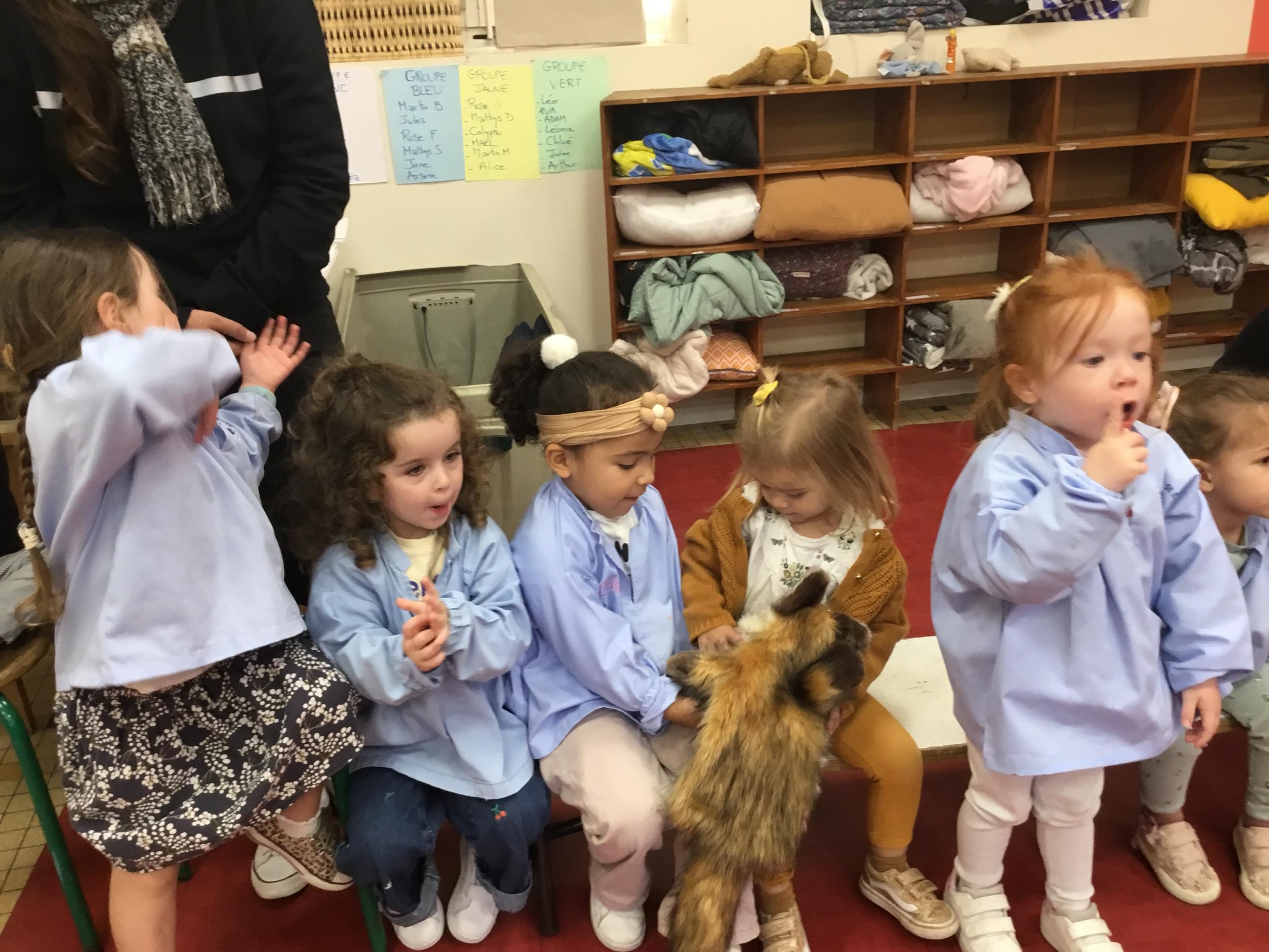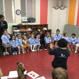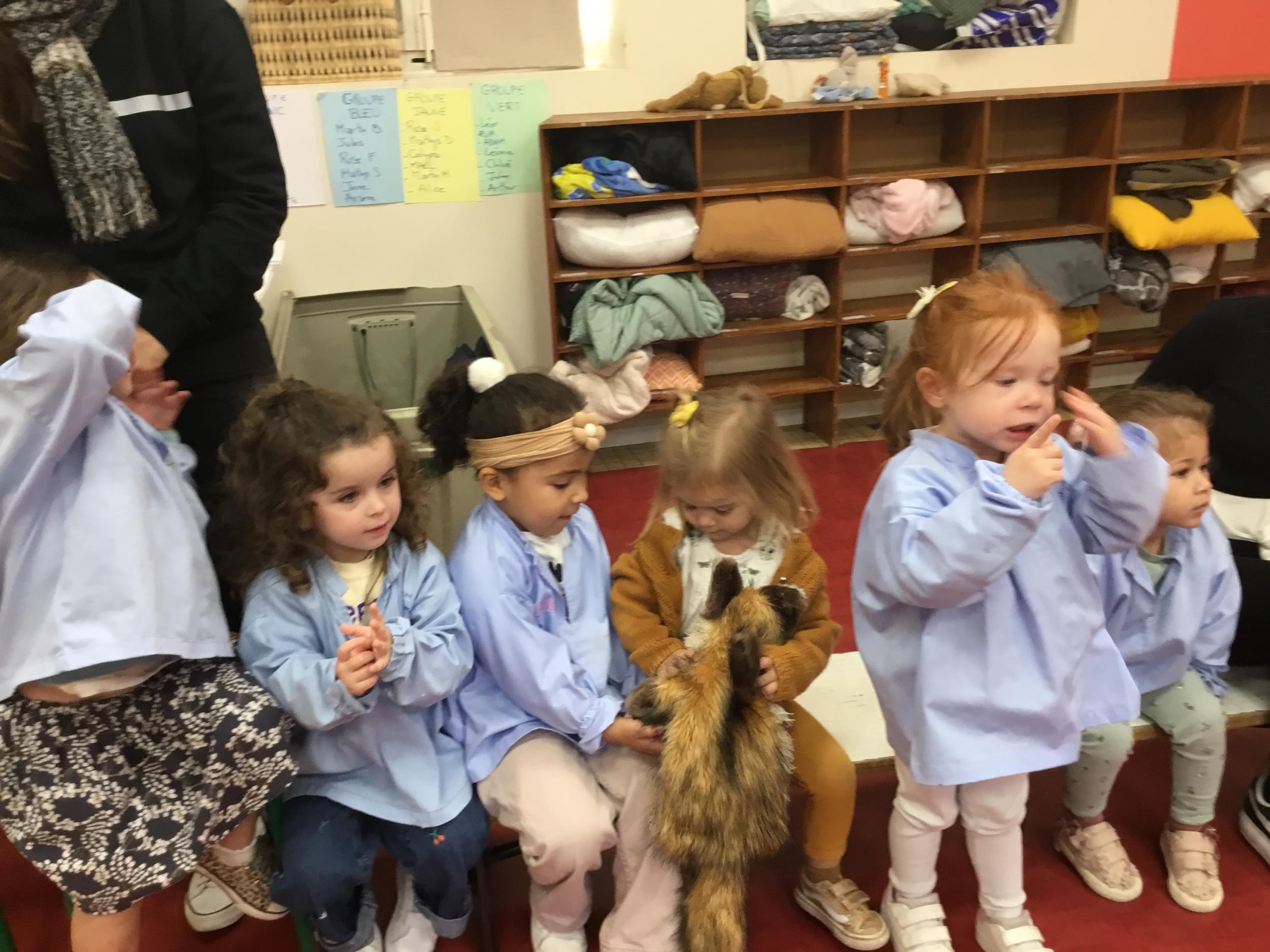 Nous avons découvert l’atelier de Gigi et Loulou…. Ses chants, ses règles, et le sens de cet atelier. Avec Gigi et Loulou les élèves vont repérer des émotions en fonction des situations jouées, vont pouvoir peut être s’identifier, et à leur tour s’exprimer. Tous ont souhaité toucher , tenir dans leur mains Gigi comme Loulou. Nous avons essayé de nous les faire passer doucement en se regardant dans les yeux .