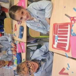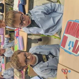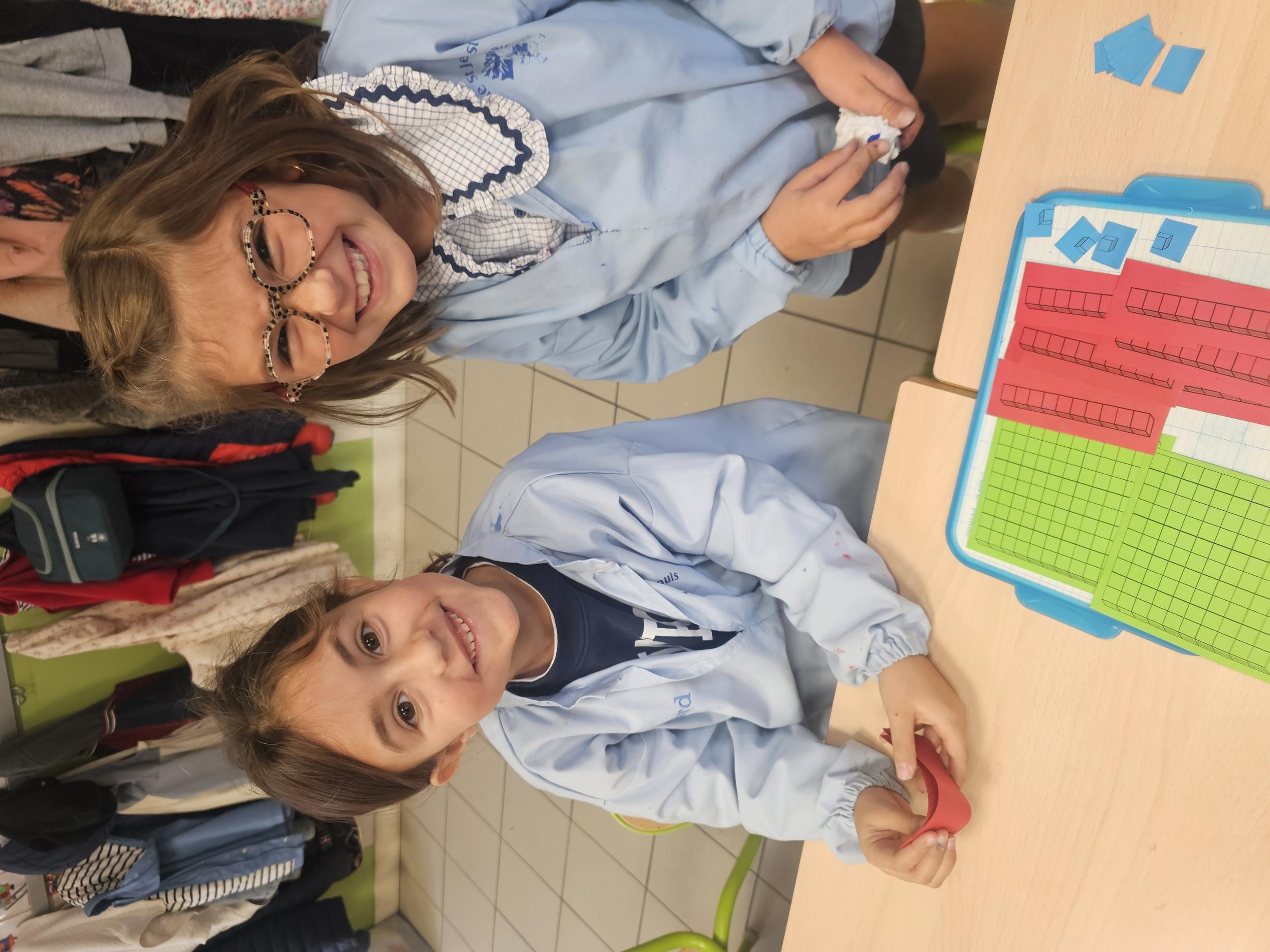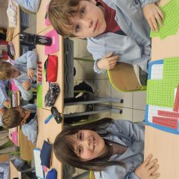 En CP, les élèves ont vu les nombres jusqu'à 100. Durant la première période de CE1 nous avons revu ces notions mais nous sommes rapidement allés au delà mais en passant beaucoup par la manipulation. Pour que l'abstraction soit possible en mathématiques il faut que l'enfant se représente le nombre de différentes manières. Ici l'unité est le cube bleu, la dizaine est une barre rouge (assemblage de 10 cubes) et la centaine est un carré vert (assemblage de 100 cubes). L'enseignante écrit un nombre au tableau, les élèves le représentent à l'aide du matériel. Le travail en binôme favorise les échanges, l'entraide et la réflexion collective.
