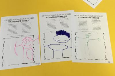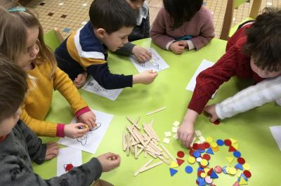 Les élèves devaient mémoriser une quantité d’objets commandés au maître en vue de décorer un dessin . Cette activité avait pour objectif de comprendre que le dernier chiffre de la comptine numérique récitée était une quantité et non un numéro.