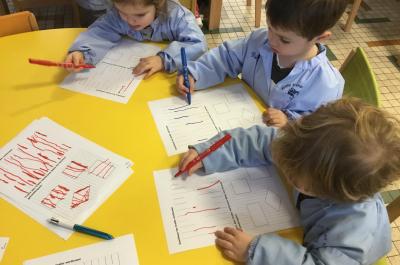 Après le trait vertical, les élèves ont travaillé autour du trait horizontal. Ces séances leur ont permis d’appréhender le sens de l’écrit de la gauche vers la droite et de maîtriser leur geste.