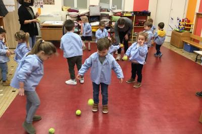 Les élèves se sont entraînés à jouer avec de façon individuelle ( rebond et lancer au niveau des yeux) puis nous avons appris à lancer le plus loin possible et à lancer en visant une cible .