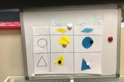 Après avoir manipulé, joué avec les différentes formes, après avoir appris à les nommer, les avoir triées, classées de différentes façons , nous apprenons à compéter un tableau à double entrée .