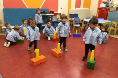 Nous avons beaucoup joué avec les différents objets qui se trouvent en salle de psychomotricité. Nous sommes montés dessus, les avons placés sur la tête ou au dessus de la tête…. Nous les avons placés devant nous, derrière nous … et avons ainsi découvert tous les connecteurs liés à l’espace.