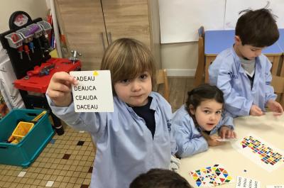 Les élèves à l’aide d’un jeu de cartes doivent retrouver le mot illustré par un dessin parmi plusieurs grâce au mot « modèle ».Ils prennent conscience que l’ordre des lettres dans un mot compte et que le fait de déplacer une lettre change le mot . Je les ai aidés à corriger leurs erreurs .