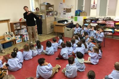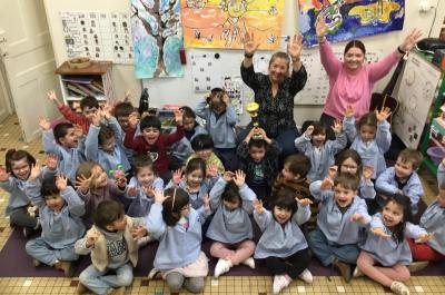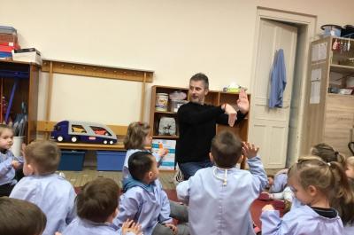 Tous les vendredis les PS et les MS se regroupent pour la chorale. D’abord nous chauffons notre voix , puis nous passons à des exercices de rythmes et enfin nous chantons en français et en anglais accompagnés de maître Chappuis à la guitare.