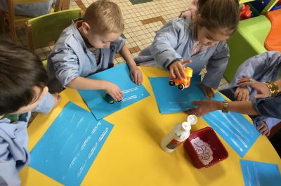 Pour écrire , il faut d’abord apprendre à déplacer sa main latéralement. C’est ce que nous avons fait ce matin en collant des gommettes de la gauche vers la droite , les unes à côté des autres, sans laisser d’espace, sans revenir en arrière et essayant de tenir l’horizontalité 🤪