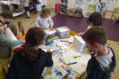 Ils ont ,de manières assez autonomes , appris à faire un gabarit d’un rectangle, à le découper correctement et à le coller sur une face de la boîte pour la décorer.