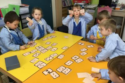 Nous avons travaillé à construire une collection équivalente à une autre collection. Puis nous avons testé nos connaissances pour rapprocher une constellation de doigts et une constellation de points.