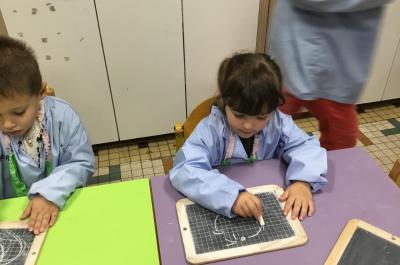Il est important de faire les lettres dans le bon sens . Aussi , après avoir fait tourner des foulards avec son bras en psychomotricité, les élèves se sont entraînés à tracer des ronds sur l’ardoise en respectant le sens de l’écriture