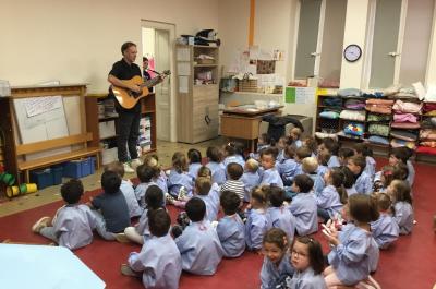 Tous les vendredis , nous nous retrouverons pour chanter avec la classe des moyens. Les petits étaient ravis de découvrir la guitare du maître.