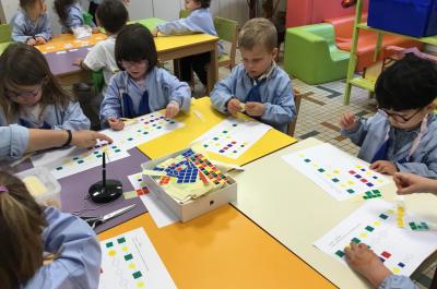 Les élèves ont d’abord manipulé et complété des suites de jetons. Certains ont inventé des algorithmes . Puis ils ont complété des suites à l’aide de gommettes.