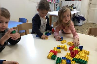 Pour apprendre à dénombrer , les élèves manipulent des légos et fabriquent des tours. Pour cela ils doivent être attentifs à la consigne donnée par le maître. Parfois la consigne peut être complexe « chacun de vous doit fabriquer deux tours de trois cubes » . Cela oblige l’enfant à différencier ce qu’est une tour et un cube. Le maître leur rappelle alors la définition.