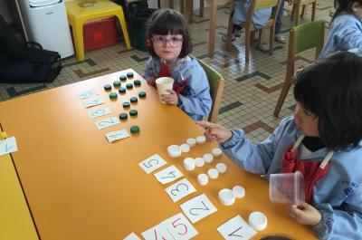 Puis chaque enfant est invité à compléter avec des jetons chacun des chiffres en disant 1 et 1 ça fait 2 puis 1 et 1 et 1 ça fait 3 …