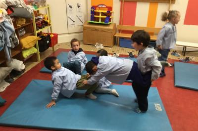 Nous commençons un cycle d’acrosport . Il s’agit de s’organiser par groupe de 3 ou 4 élèves pour faire des figures d’équilibriste . Les élèves se répartissent de manière autonome les différents rôles : équilibriste, porteurs et arbitre aide.