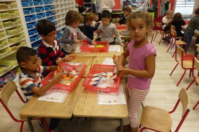 Depuis la rentré, les élèves découvrent les divers ateliers barquettes de style Montessori. Ils recherchent à deux l'utilisation du matériel puis le présentent à la classe et expliquent ce qu'ils ont compris.