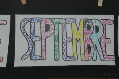 Il est important que les apprentissages aient du sens pour les élèves. en graphisme, après quelques entrainements, les élèves ont décoré les lettres évidées du mot "septembre" avec des graphismes divers pour lier l'acte graphique et l'habileté à une production plastique mise en valeur par un collage sur fond noir.
