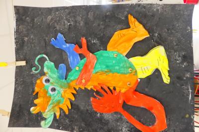 Pour terminer notre projet autour de l'album "Ernest et moi" parlant d'un dragon, nous avons réalisé un pantin dragon en utilisant diverses techniques d'art visuel.