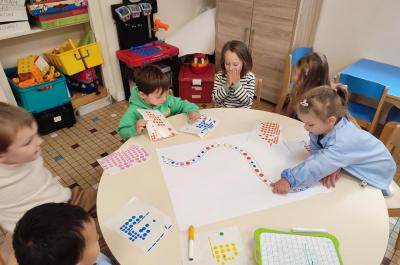 Le jeu du serpent permet aux enfants de lire les chiffres sur le dé et de dénombrer les gommettes correspondant à ce chiffre.