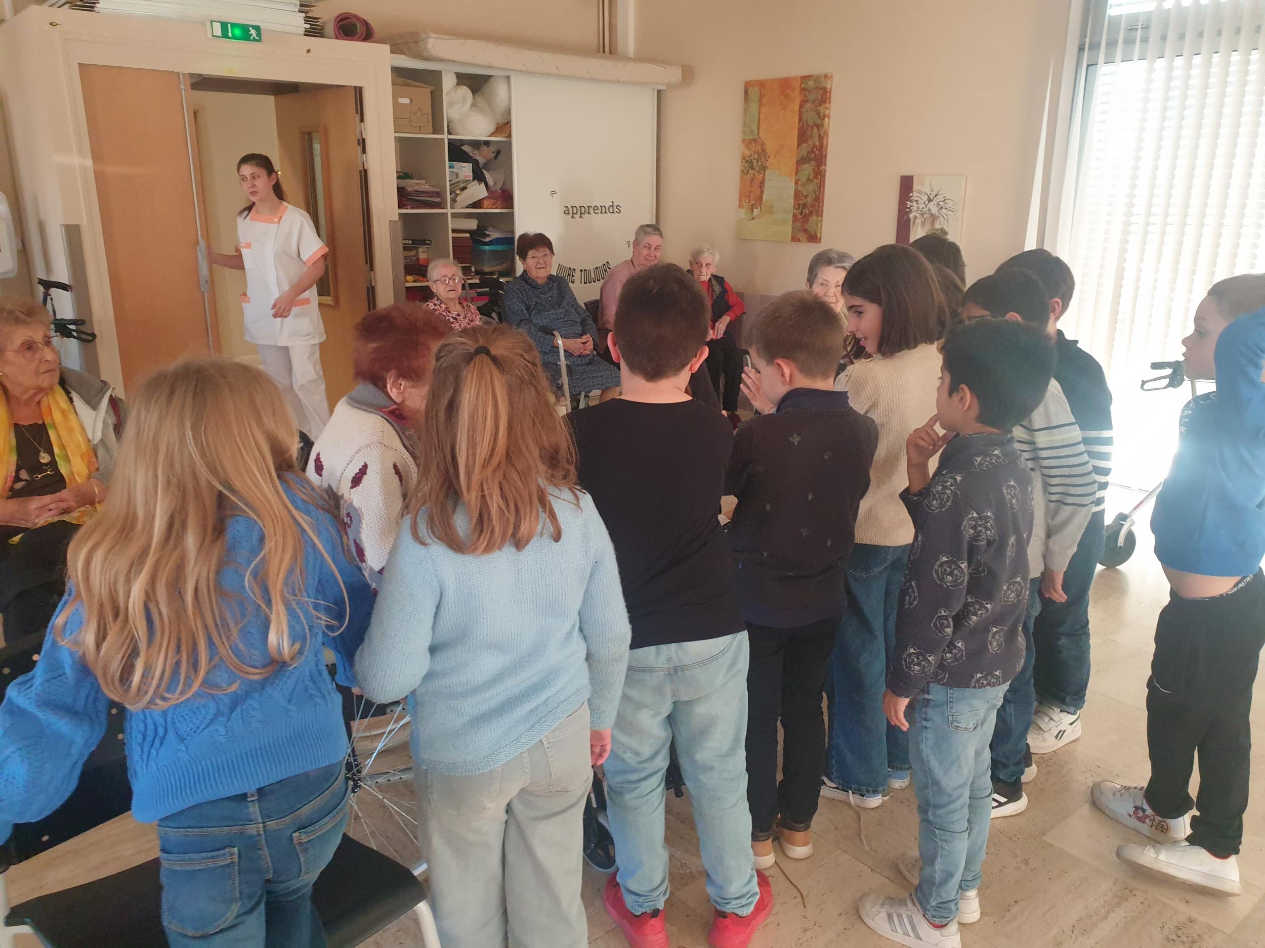 Dans le courant du mois de janvier, les élèves de CE1 qui n'avaient pas été rendre visite aux résidents du Refuge protestant lors de la période précédente ont pu y aller et cette fois-ci j'ai pensé à prendre quelques photos. Comme la première fois, les enfants étaient un peu impressionnés au début, et puis avec l'aide de l'animatrice, Cindy, chacun a pu poser des questions aux résidents et petit à petit un bel échange s'est créé. Evidemment il fallait parler fort et ça n'était pas toujours facile. Les enfants posaient des questions aux résidents, sur l'école et la vie autrefois lorsqu'ils avaient leur âge et les résidents posaient également des questions. Ce fût un beau moment de partage, hors du temps qui a donné le sourire aux résidents mais aussi aux enfants. Nous avons déjà hâte d'y retourner pour voir comment vont Yves, Odette, Gillette, Bernadette, Paule et toutes les autres résidentes.