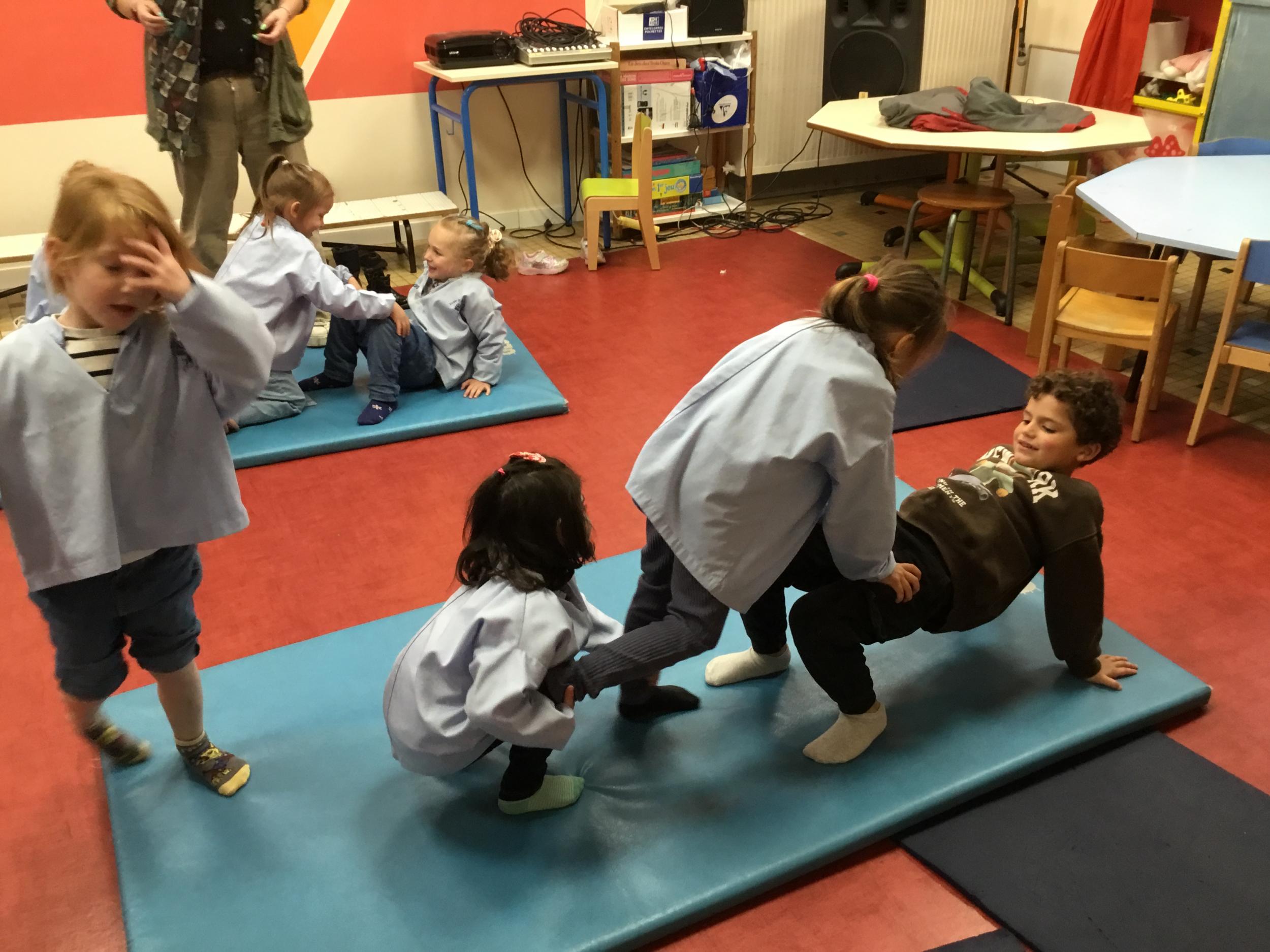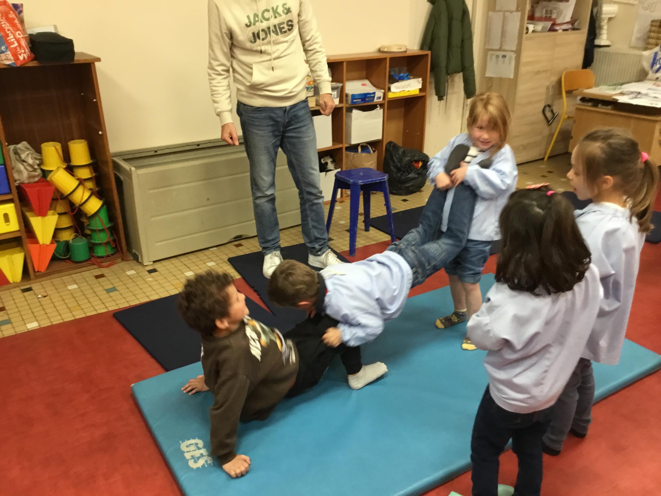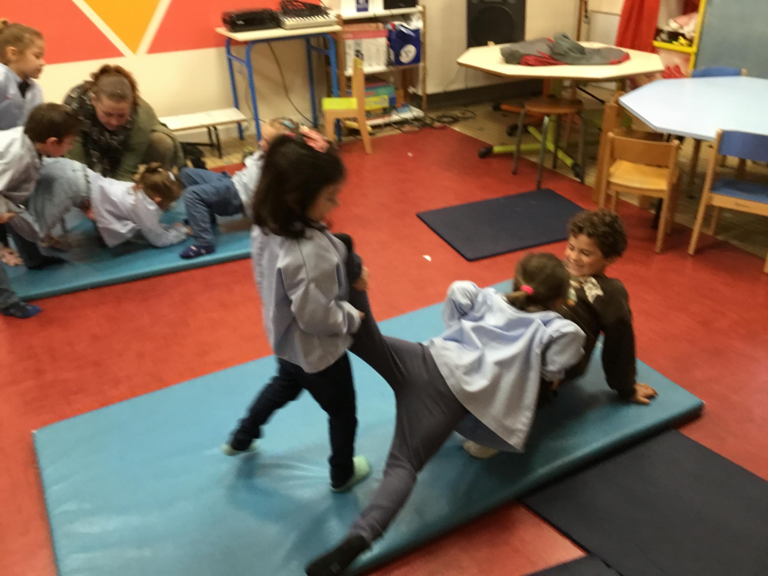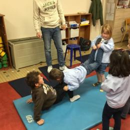 Nous commençons un cycle d’acrosport . Il s’agit de s’organiser par groupe de 3 ou 4 élèves pour faire des figures d’équilibriste . Les élèves se répartissent de manière autonome les différents rôles : équilibriste, porteurs et arbitre aide.