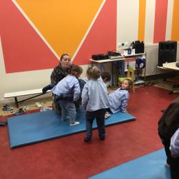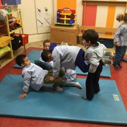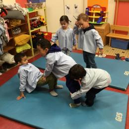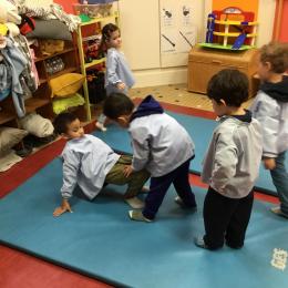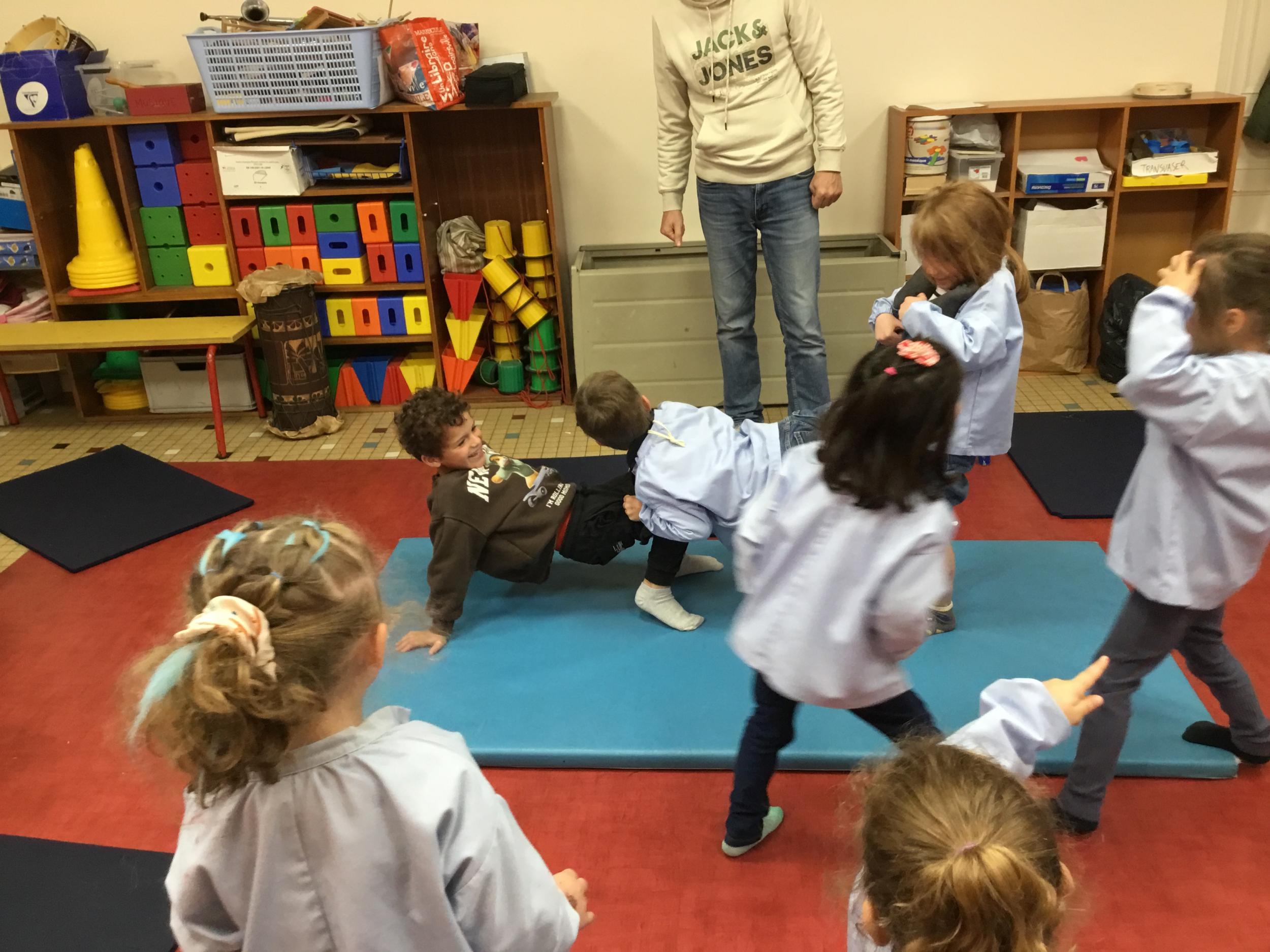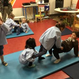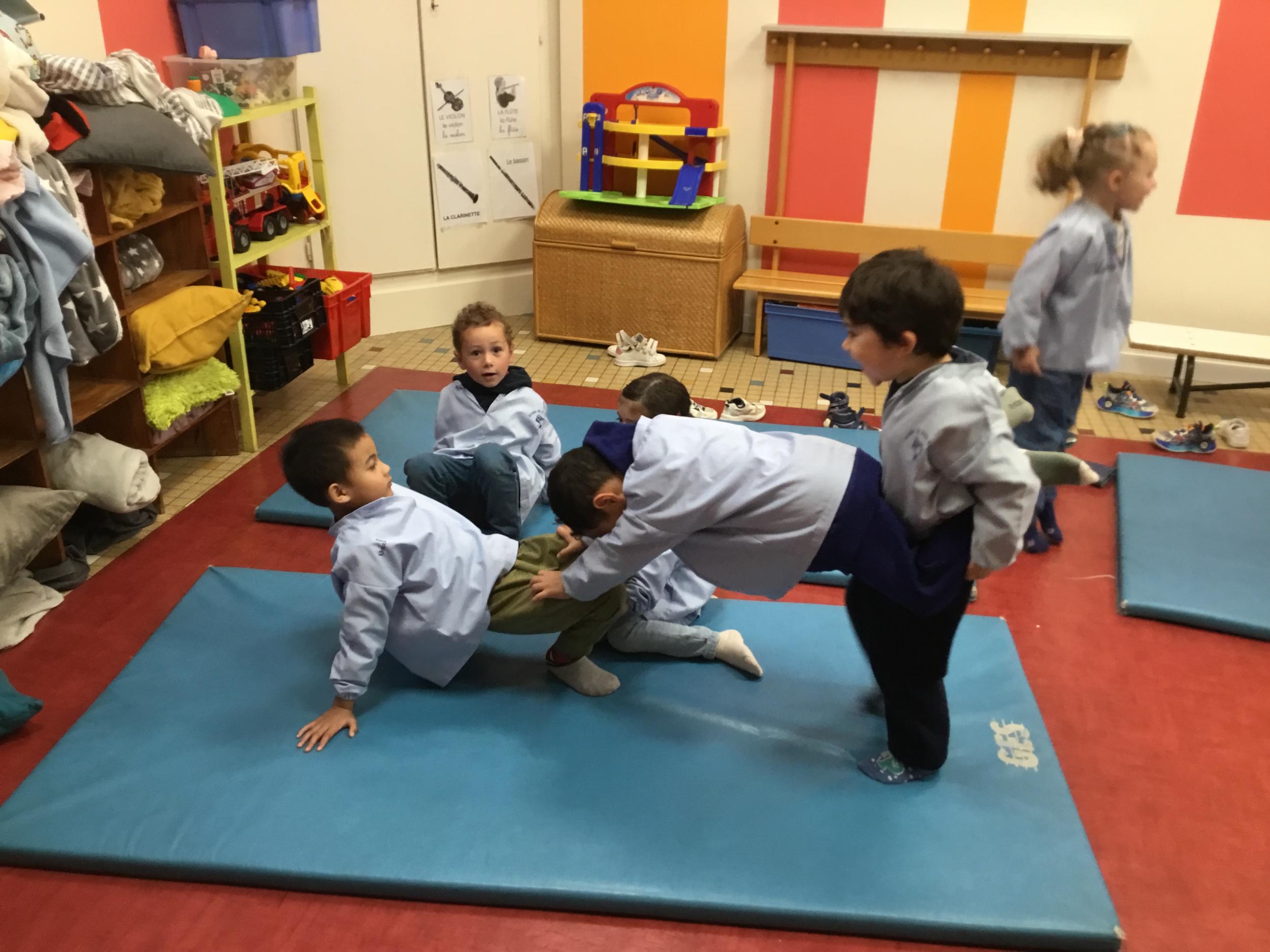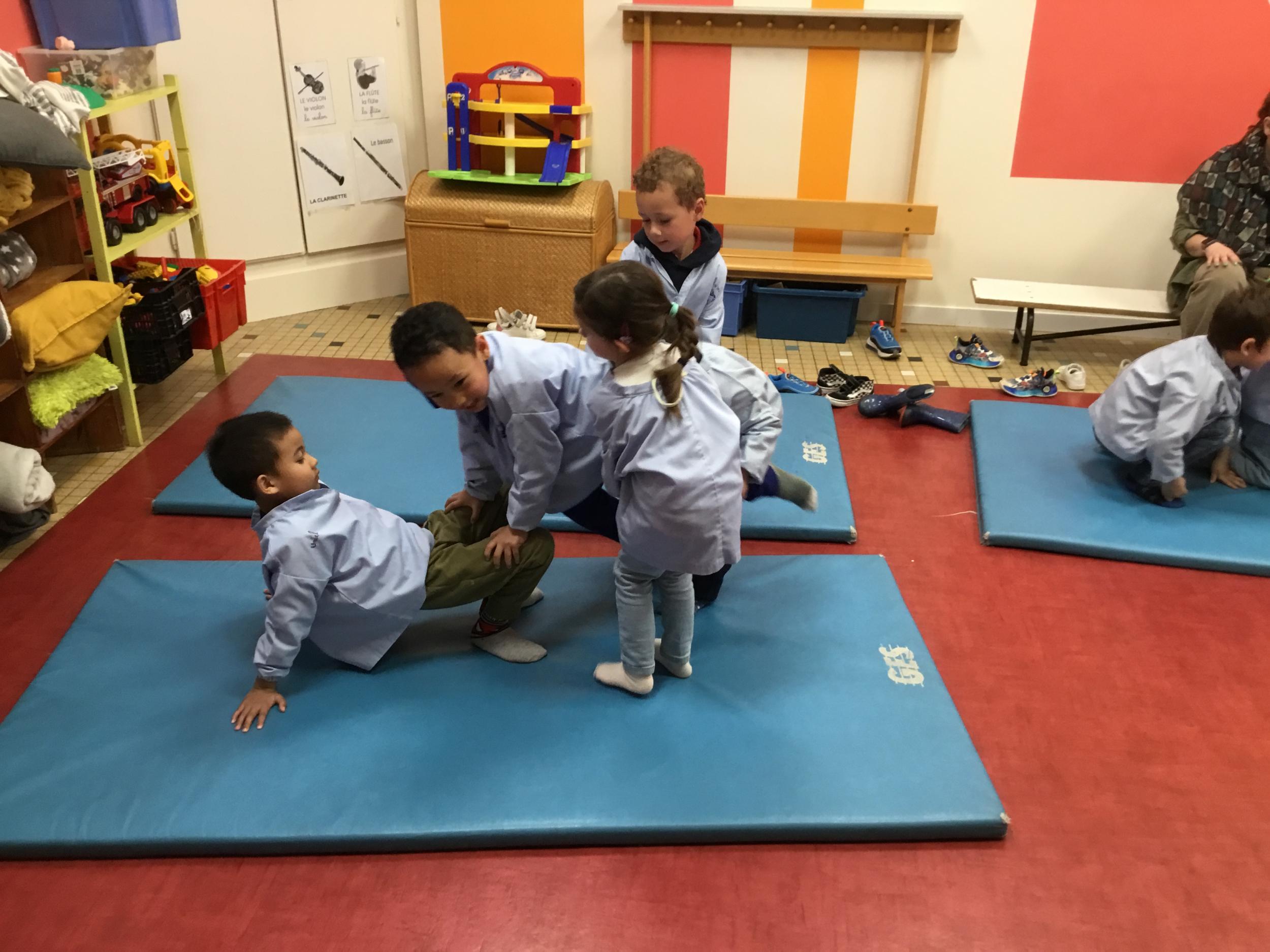 Nous commençons un cycle d’acrosport . Il s’agit de s’organiser par groupe de 3 ou 4 élèves pour faire des figures d’équilibriste . Les élèves se répartissent de manière autonome les différents rôles : équilibriste, porteurs et arbitre aide.