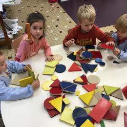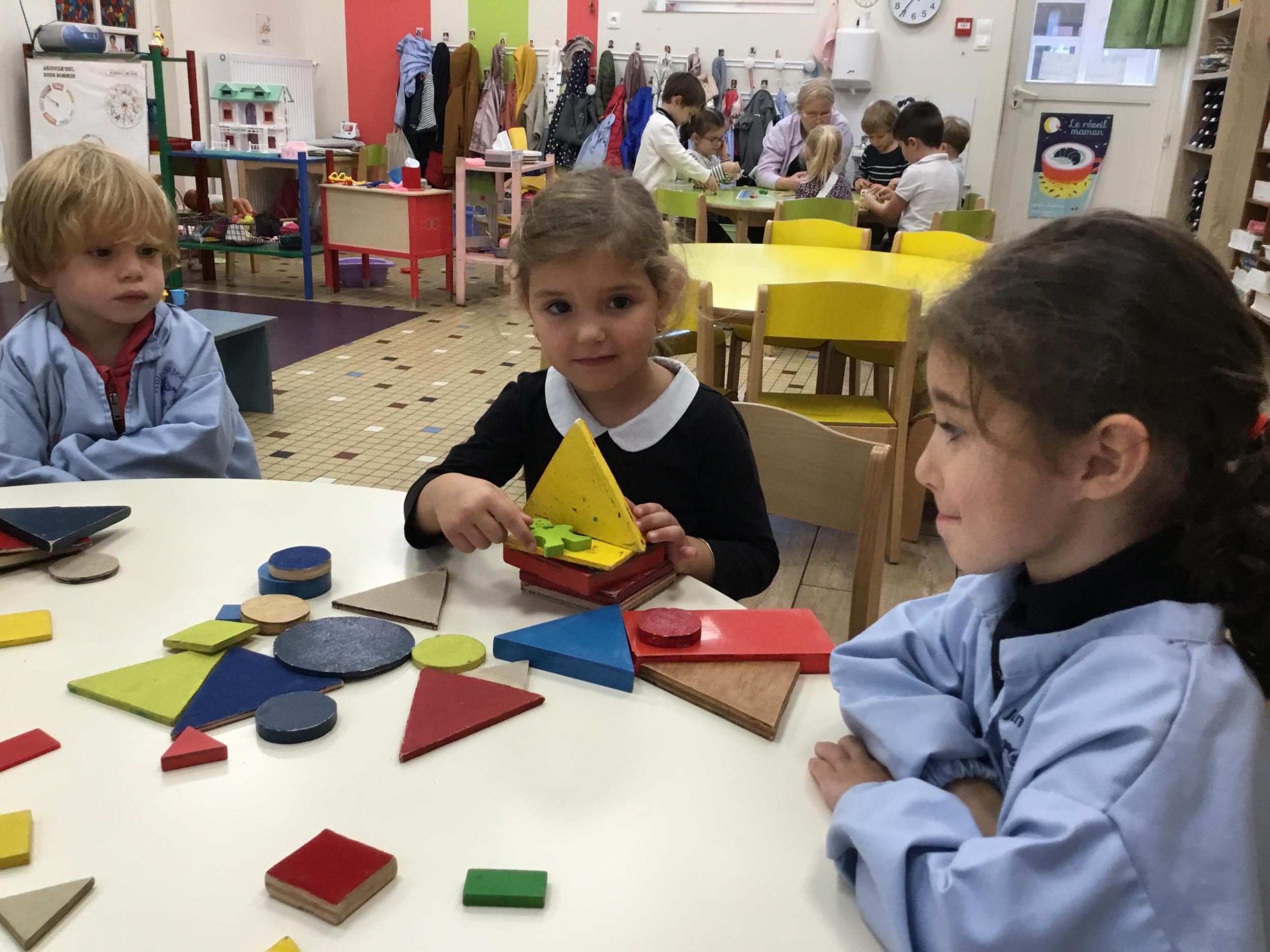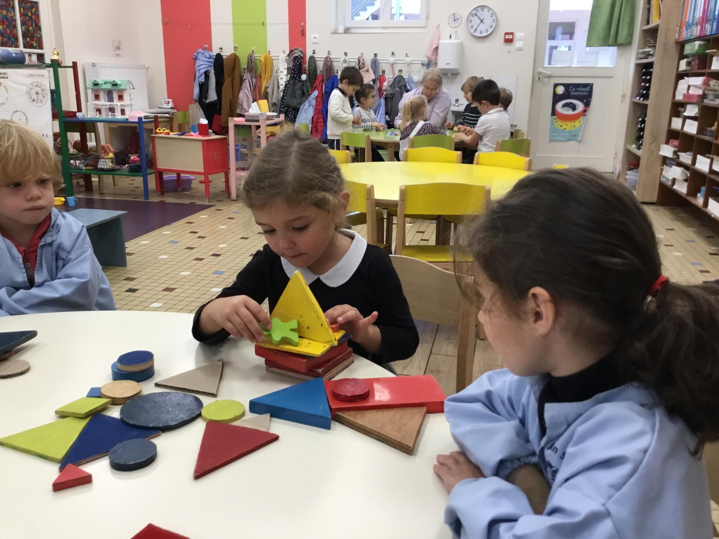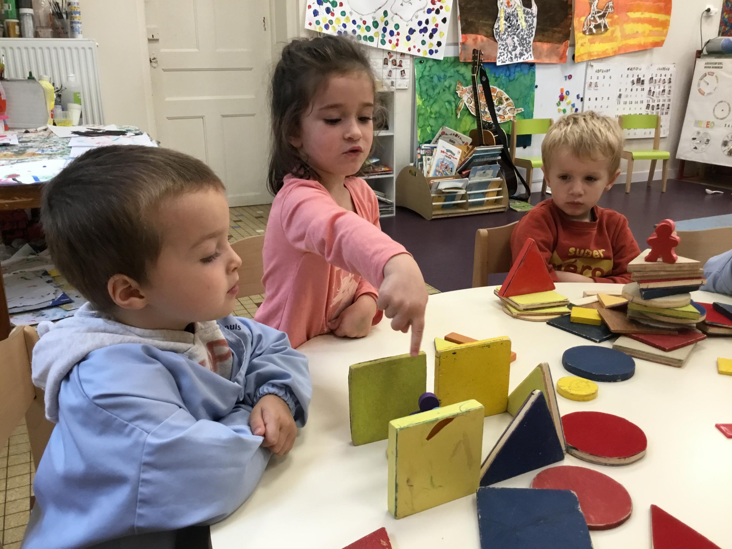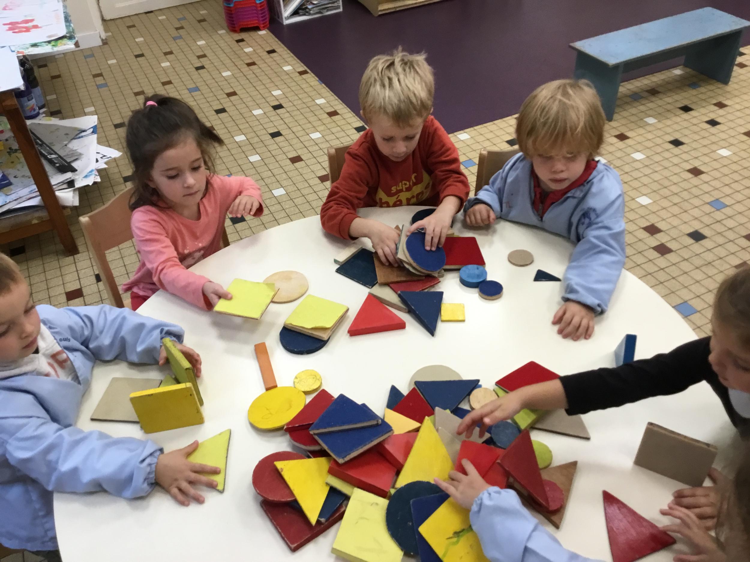 Dans cet atelier, les élèves sont par deux et doivent ensemble fabriquer un château commun. Pour cela, je leur demande de discuter pour s’organiser. Puis , une fois le château construit, à l’oral , ils doivent le présenter aux autres élèves . Pour cela , ils décrivent les différentes parties de leur château . Ils nomment ainsi les formes géométriques utilisées.