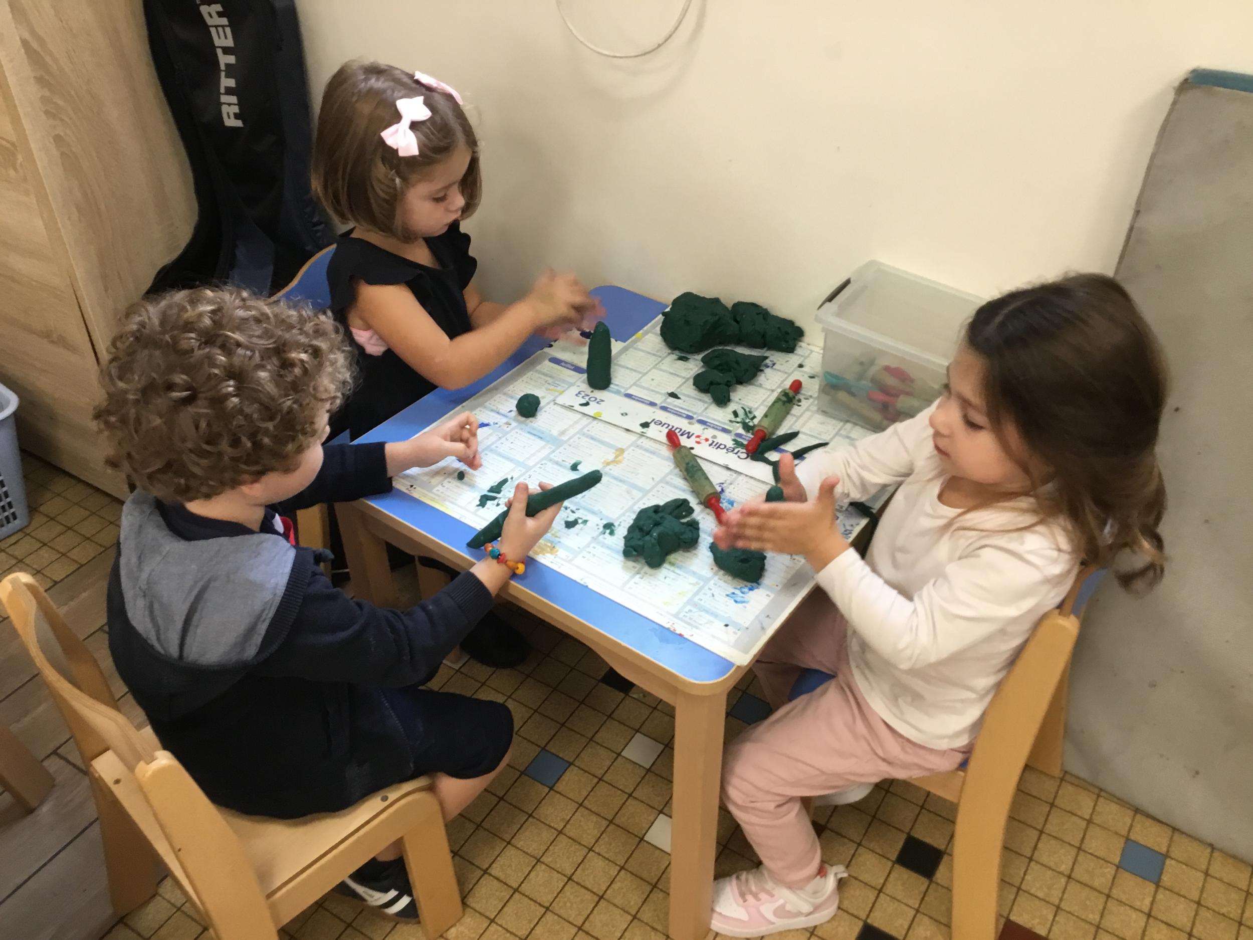 Petite et moyenne section 04/10/2024 Les élèves de MS ont fabriqué les pommiers de Montdragon en pâte à modeler.