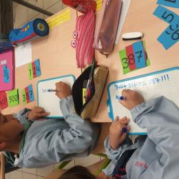 Depuis quelques semaines, les élèves de CE1 ont découvert les cartons Montessori. Ces petites étiquettes nous permettent de travailler sur les nombres en manipulant. Je passe une commande: "je voudrais les cartons suivants: un carton de 2 centaines, un carton de 5 dizaines et un carton de 8 unités". Les élèves cherchent les 3 étiquettes en question parmi leurs 27 étiquettes: 200, 50, 8 et écrivent ce qu'ils ont sur leur ardoise de la manière suivante: 200+50+8=258