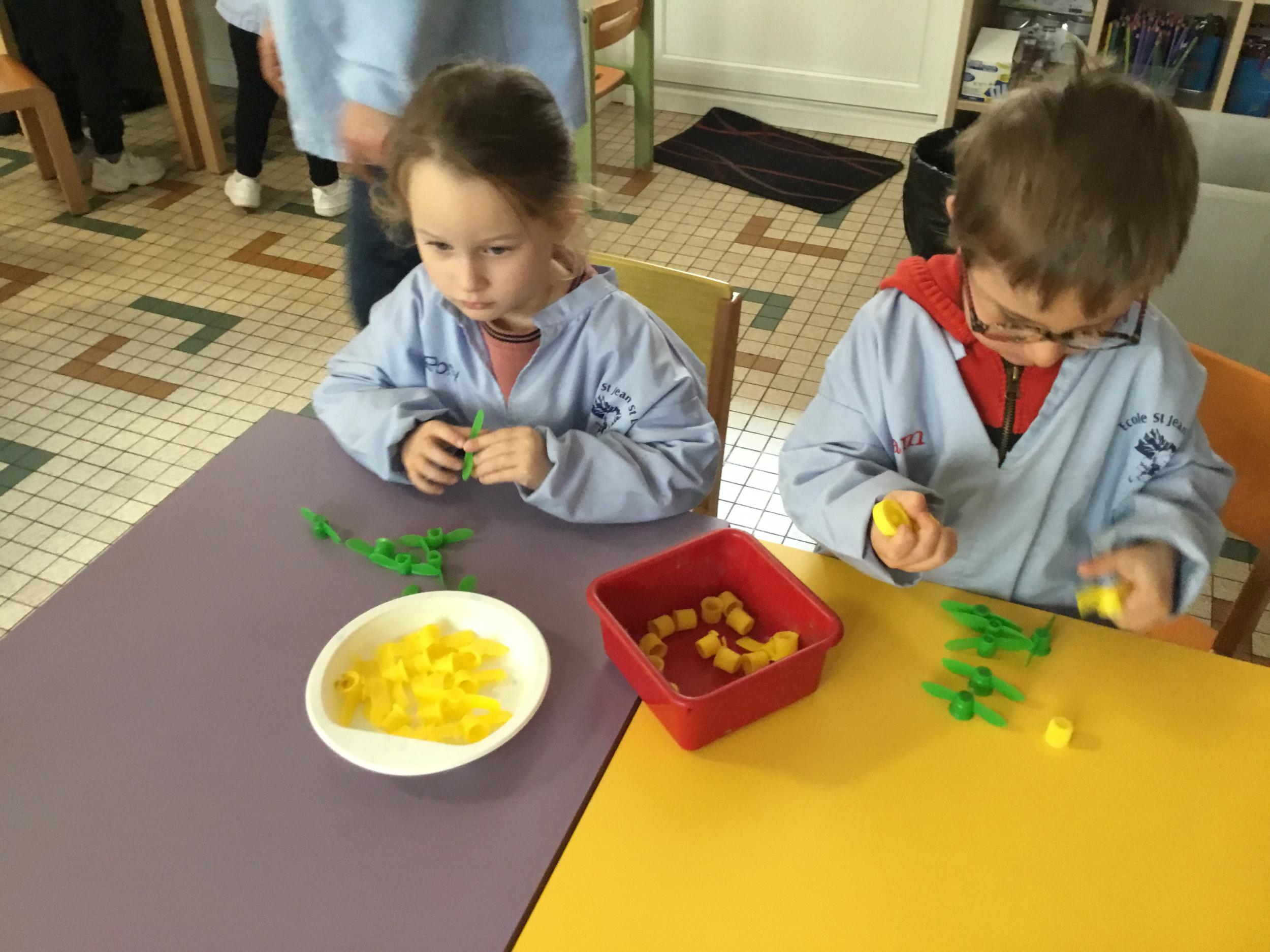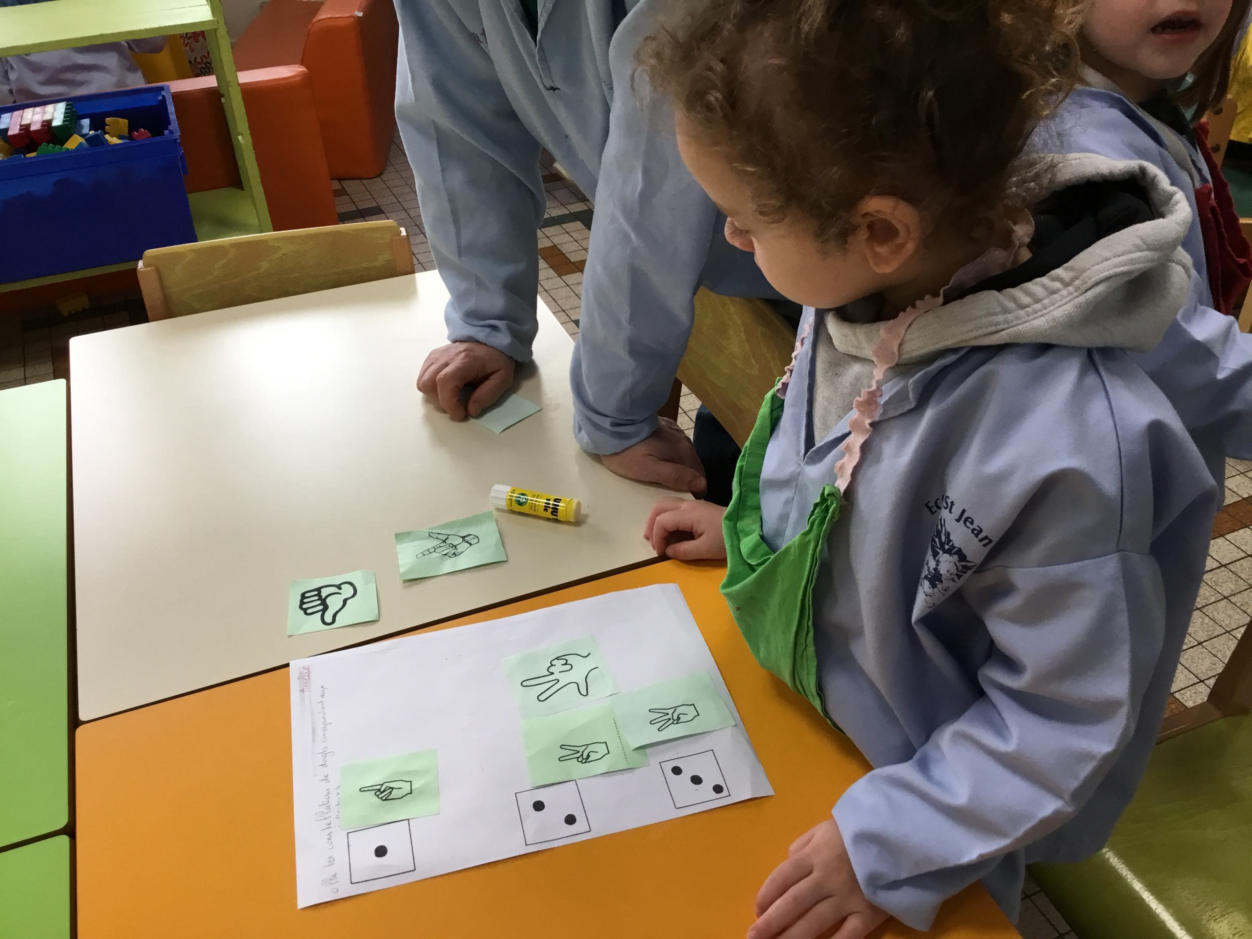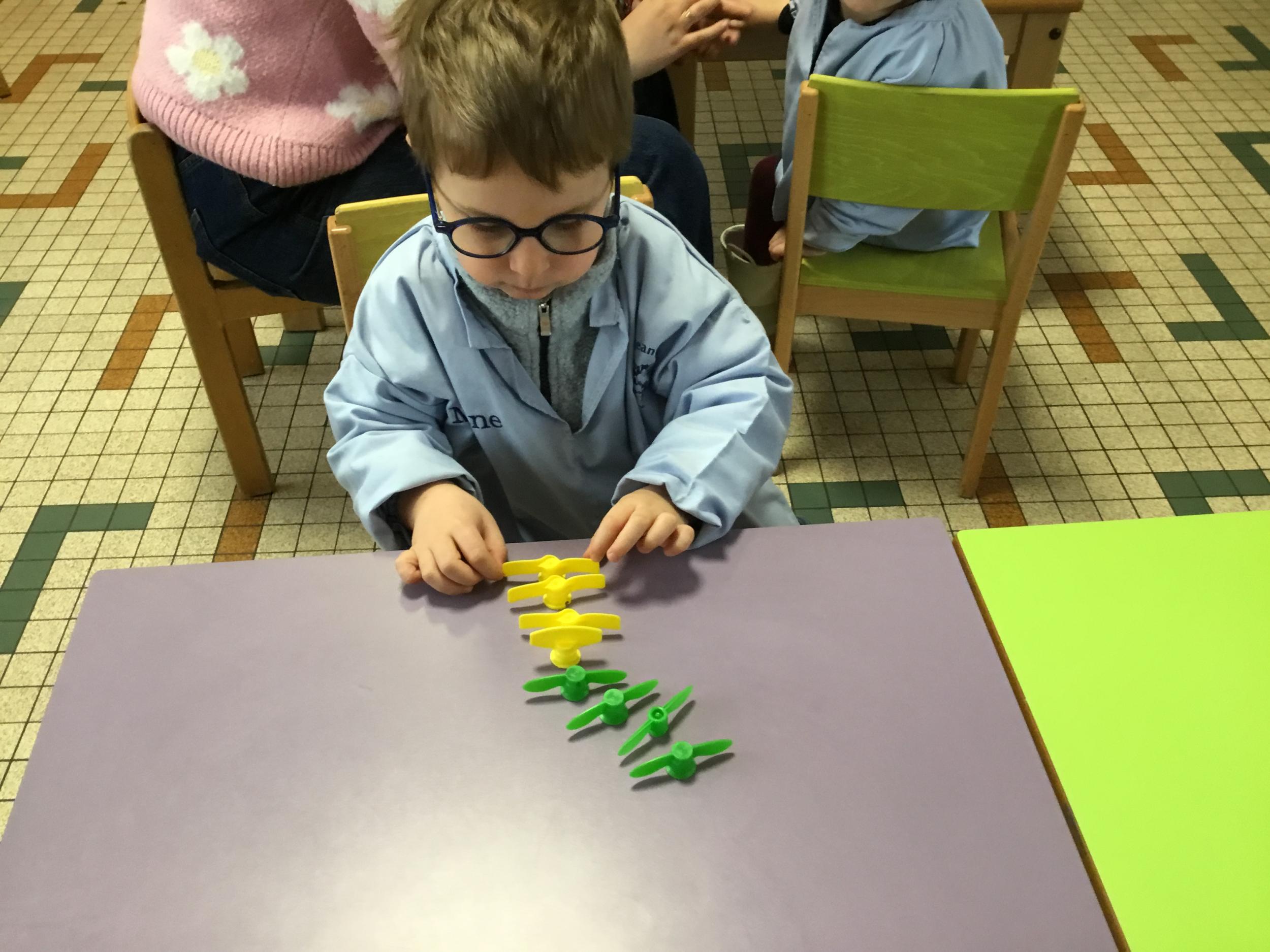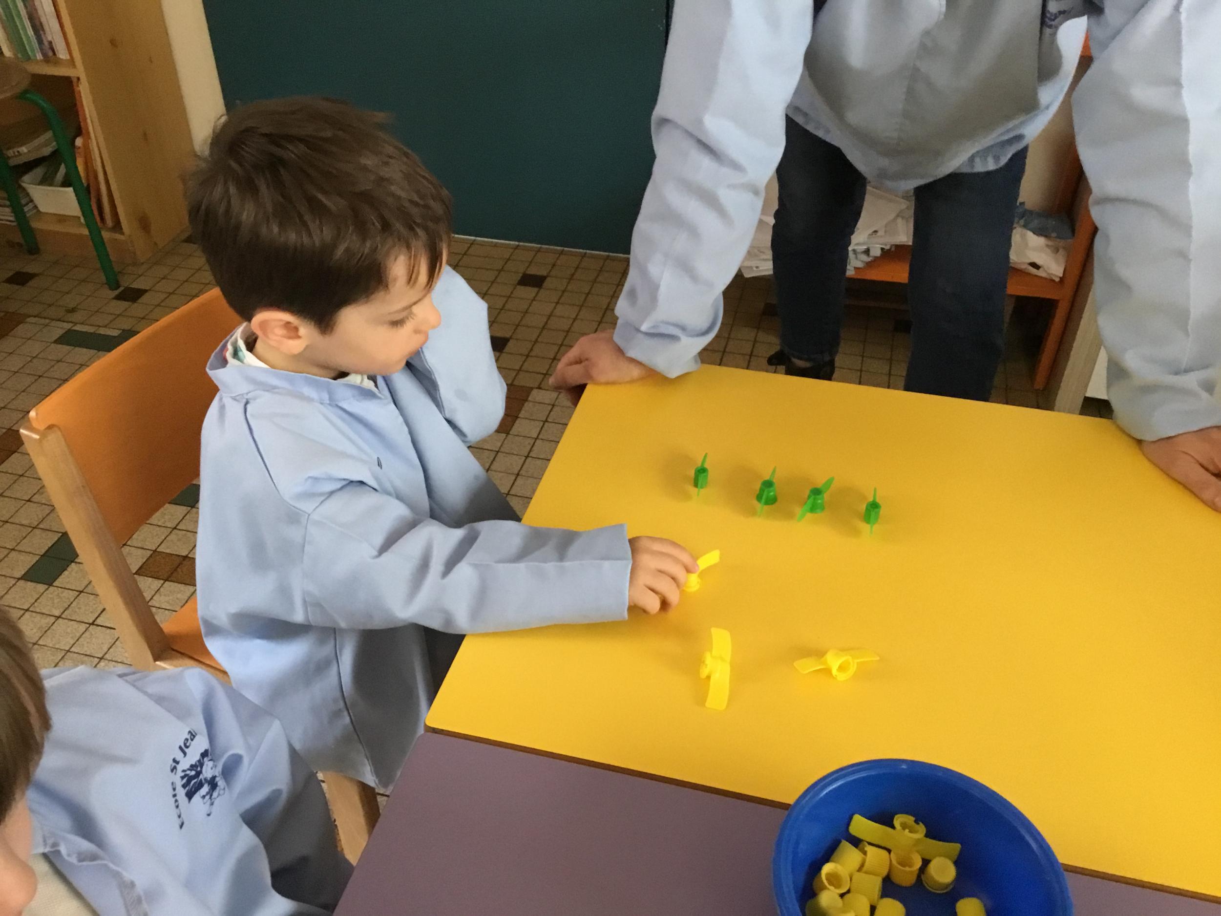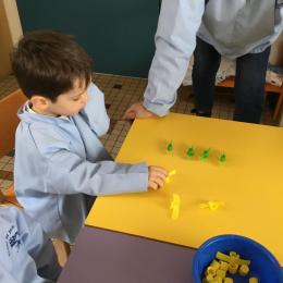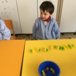 Les élèves devaient choisir autant de bouchons jaunes que de bouchons verts . La maîtresse observait leur stratégie et adaptait le nombre de bouchons au niveau de maîtrise de la compétence .