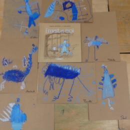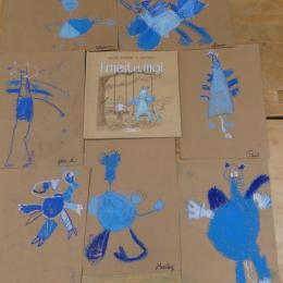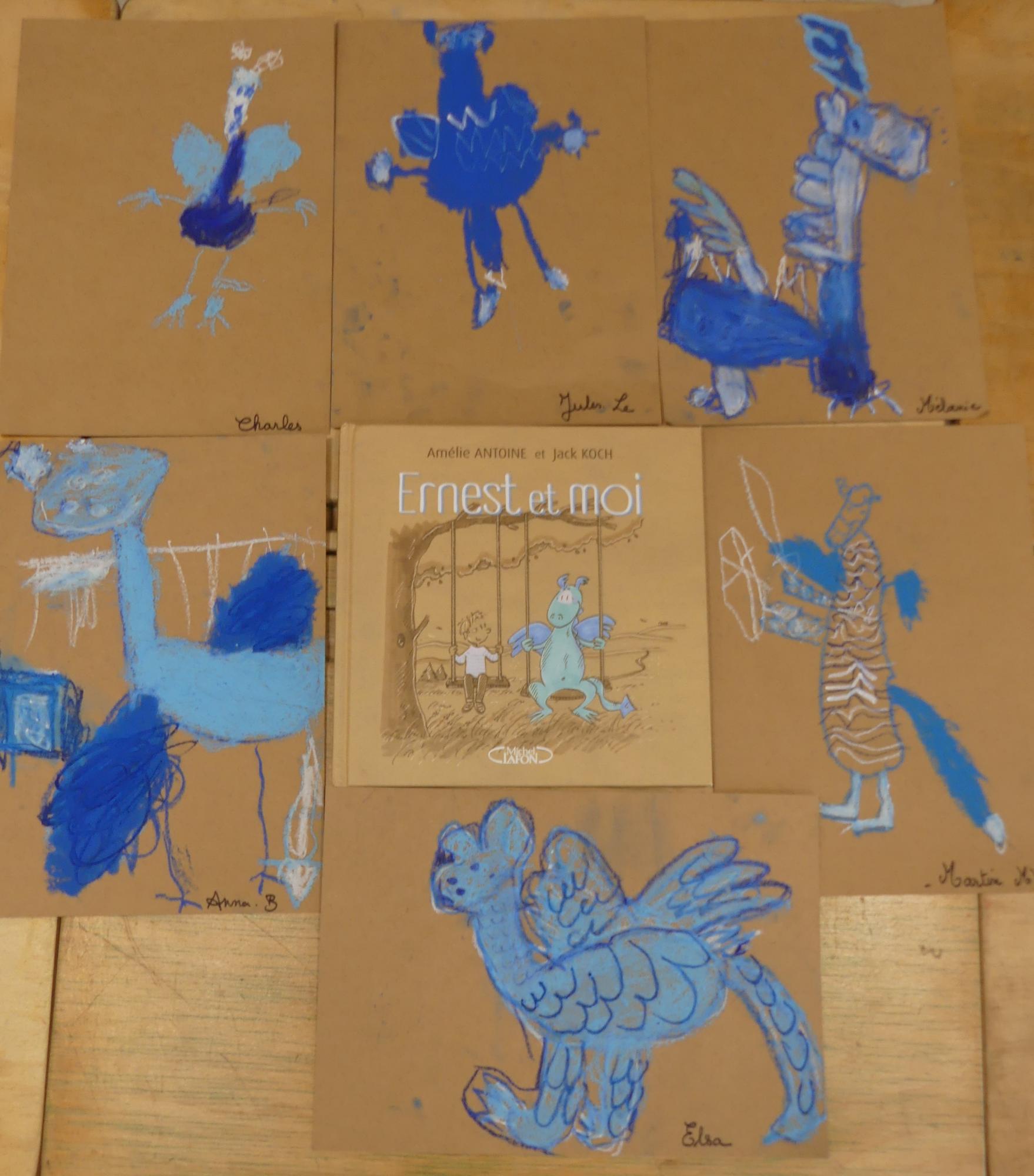 Comme album de rentrée, nous avons lu et travaillé "Ernest et moi". C'est l' histoire d'un petit garçon qui se retrouve seul après avoir déménagé. S'ennuyant, il s'invente un ami imaginaire : un petit dragon bleu qui devient vite grand pendant l'été. La rentrée arrive, Lucien a du mal à se faire des amis.. jusqu'à ce qu'il en trouve un et que son ami imaginaire ne lui soit plus utile.