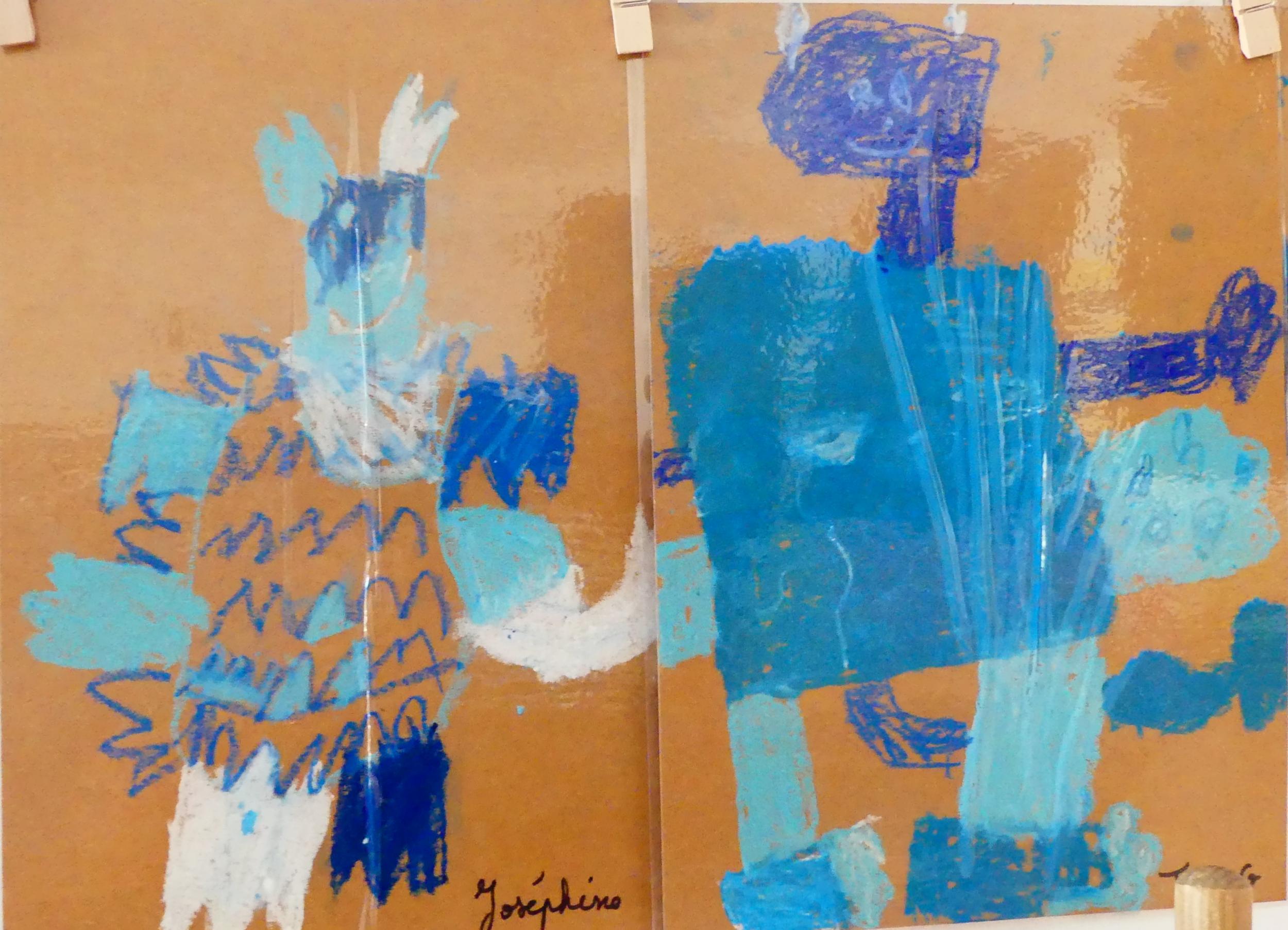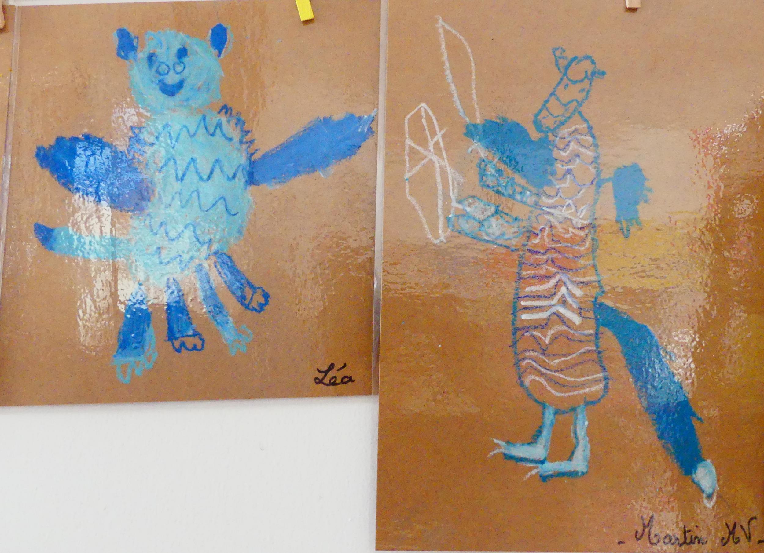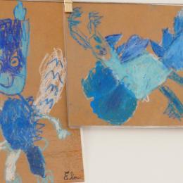 J'ai alors proposé aux élèves, d'établir la carte mentale du dragon pour connaitre ses caractéristiques et savoir comment le dessiner. Ensuite, nous avons pris une feuille de kraft, des pastels gras dans divers tons de bleus et blanc, et chacun a dessiné son dragon bleu, à la façon de Jack Koch!
