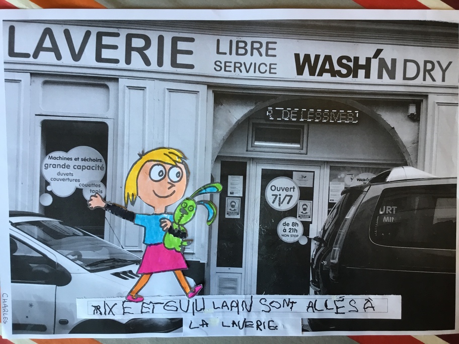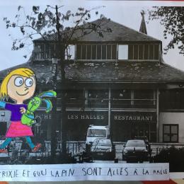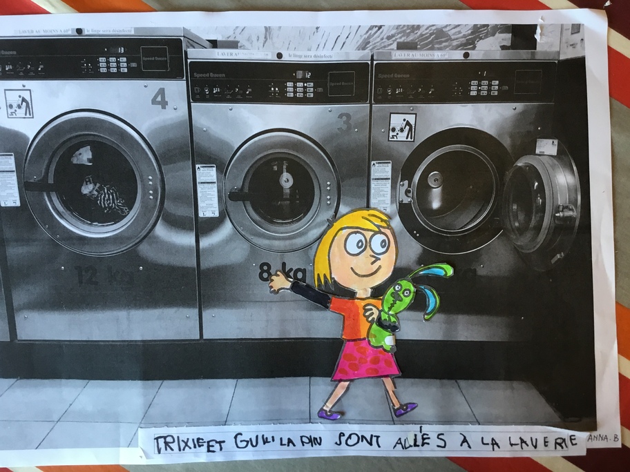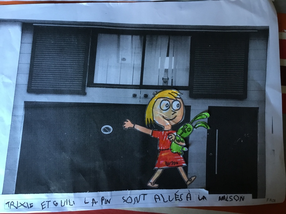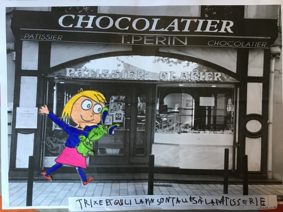 Puis chaque élève a colorié Trixie en respectant le code de l'album (sauf pour les vêtements) puis la collé sur sa photo et à copié une phrase indiquant où la scène se passe.