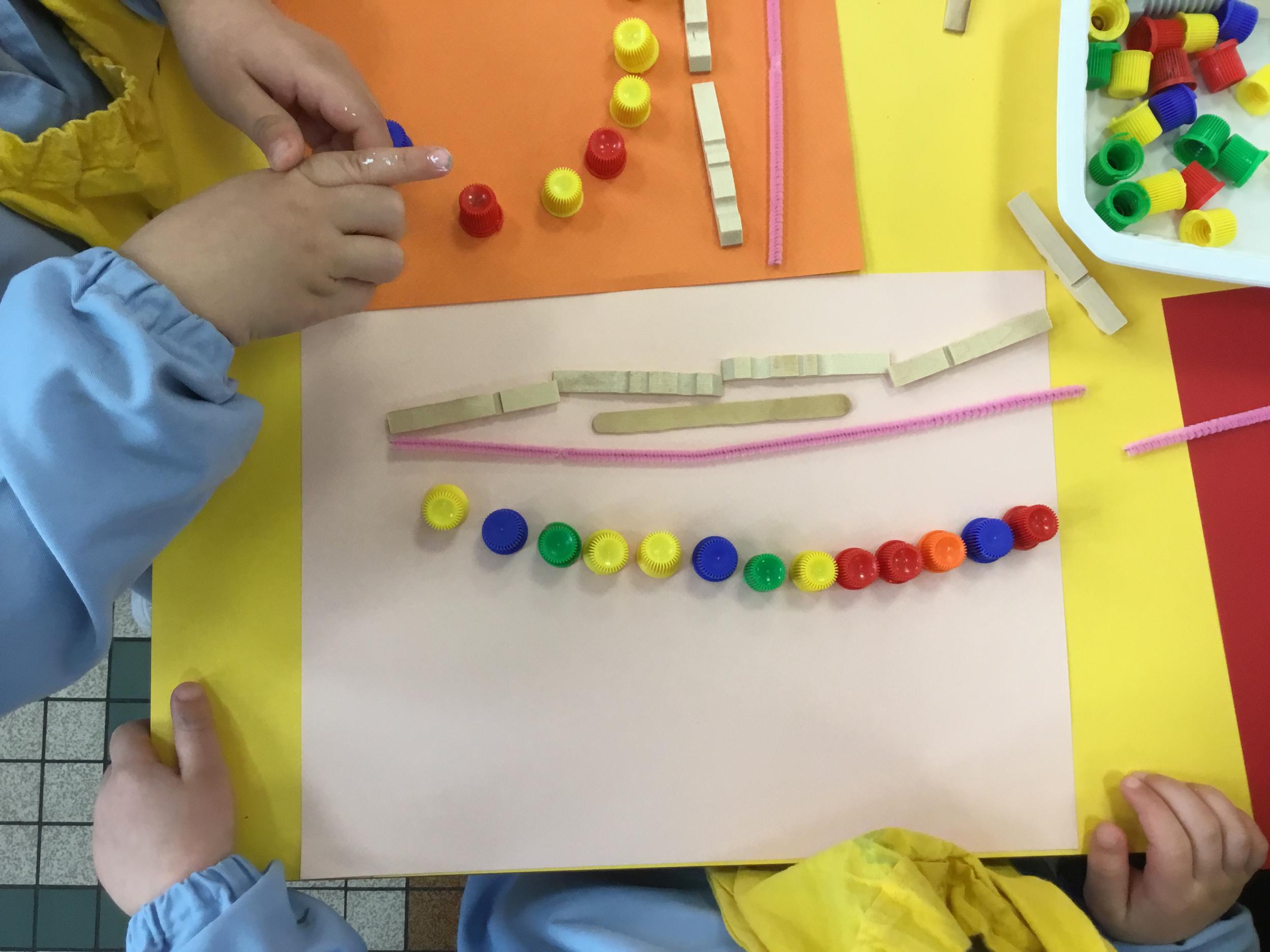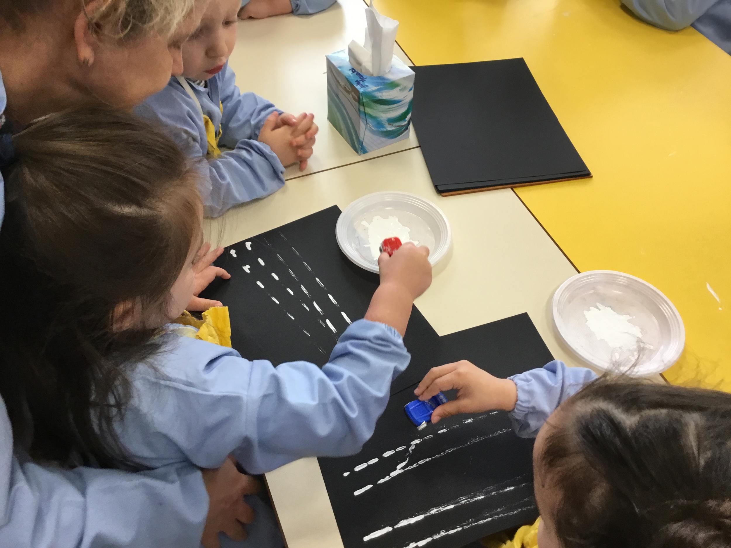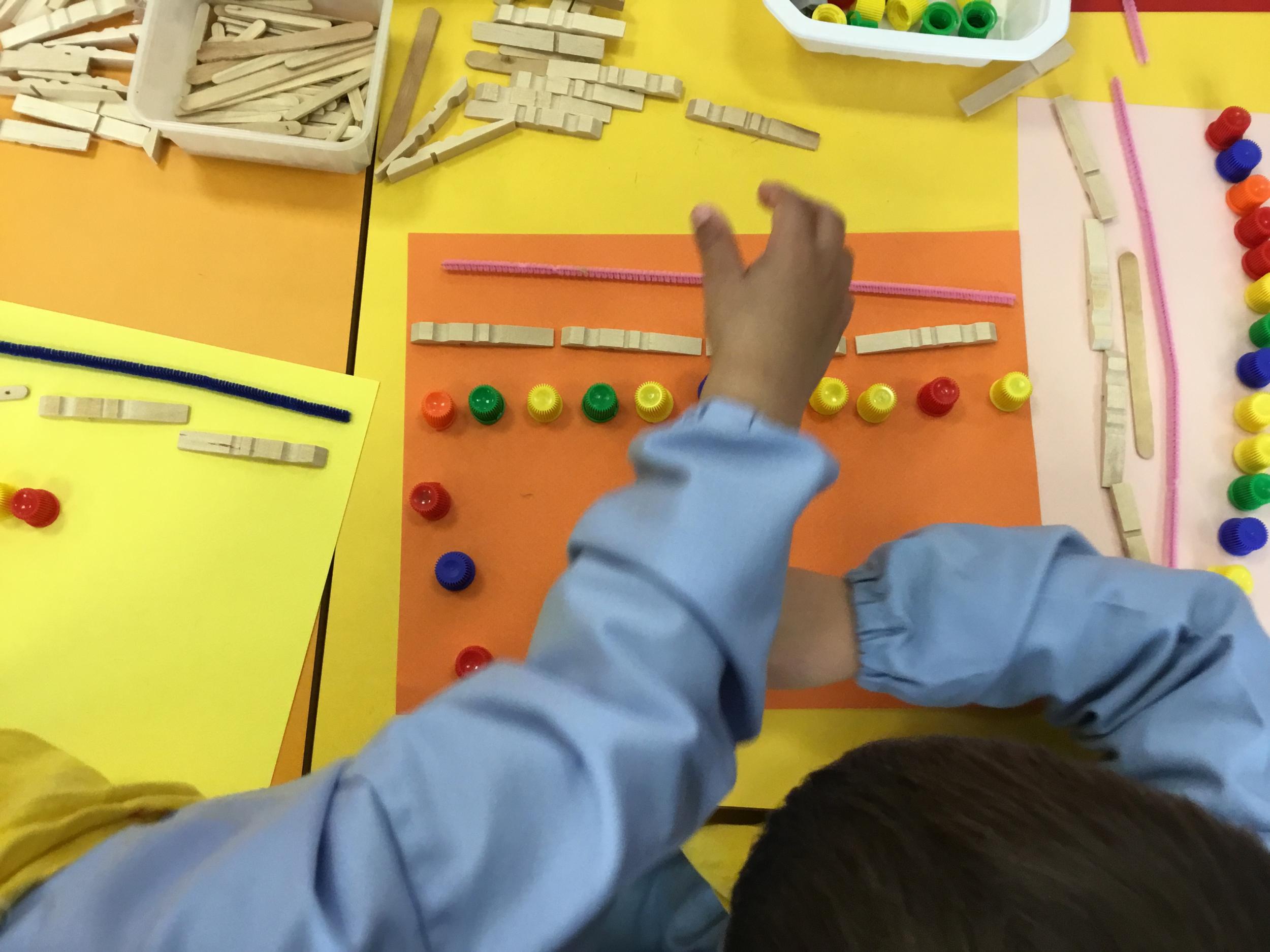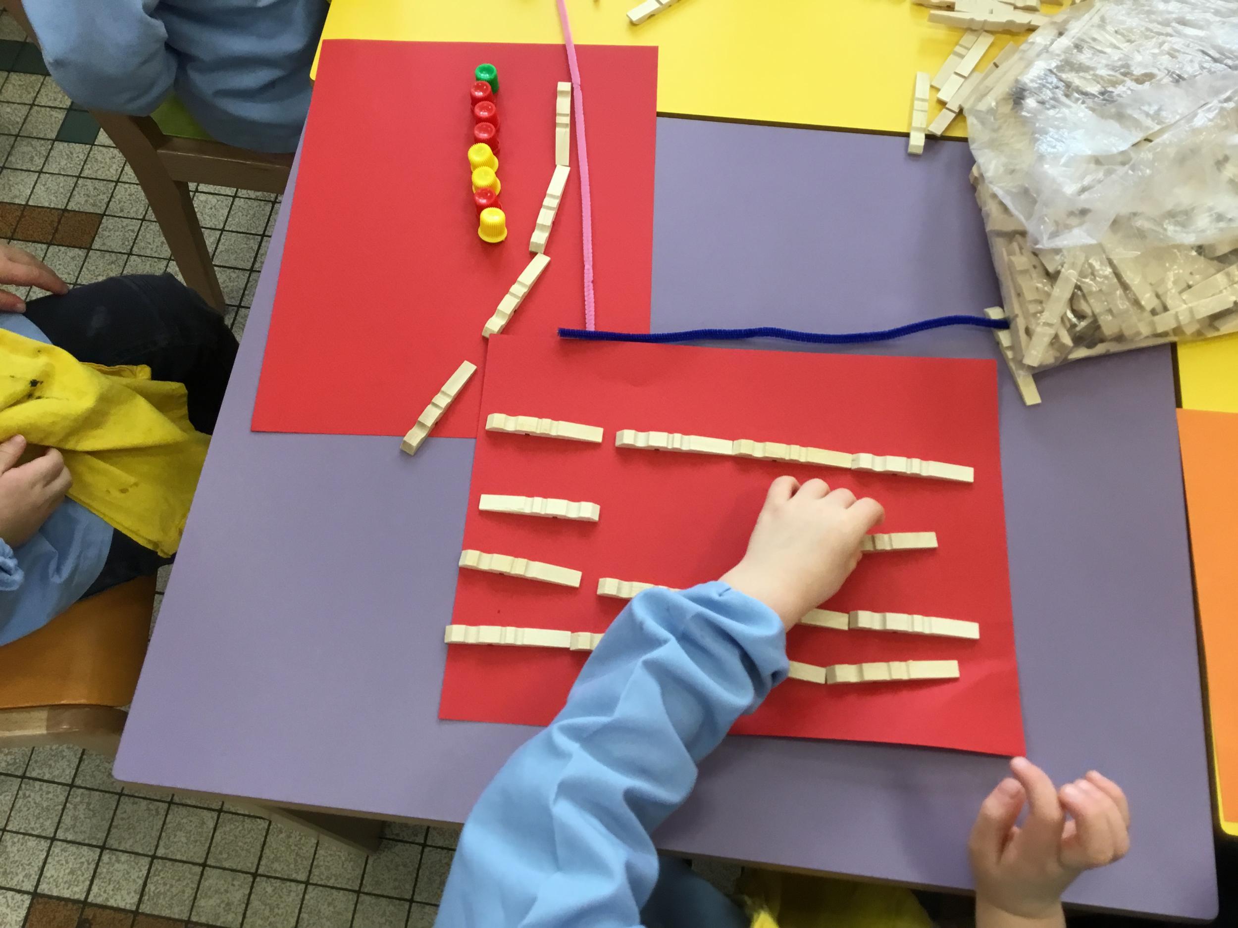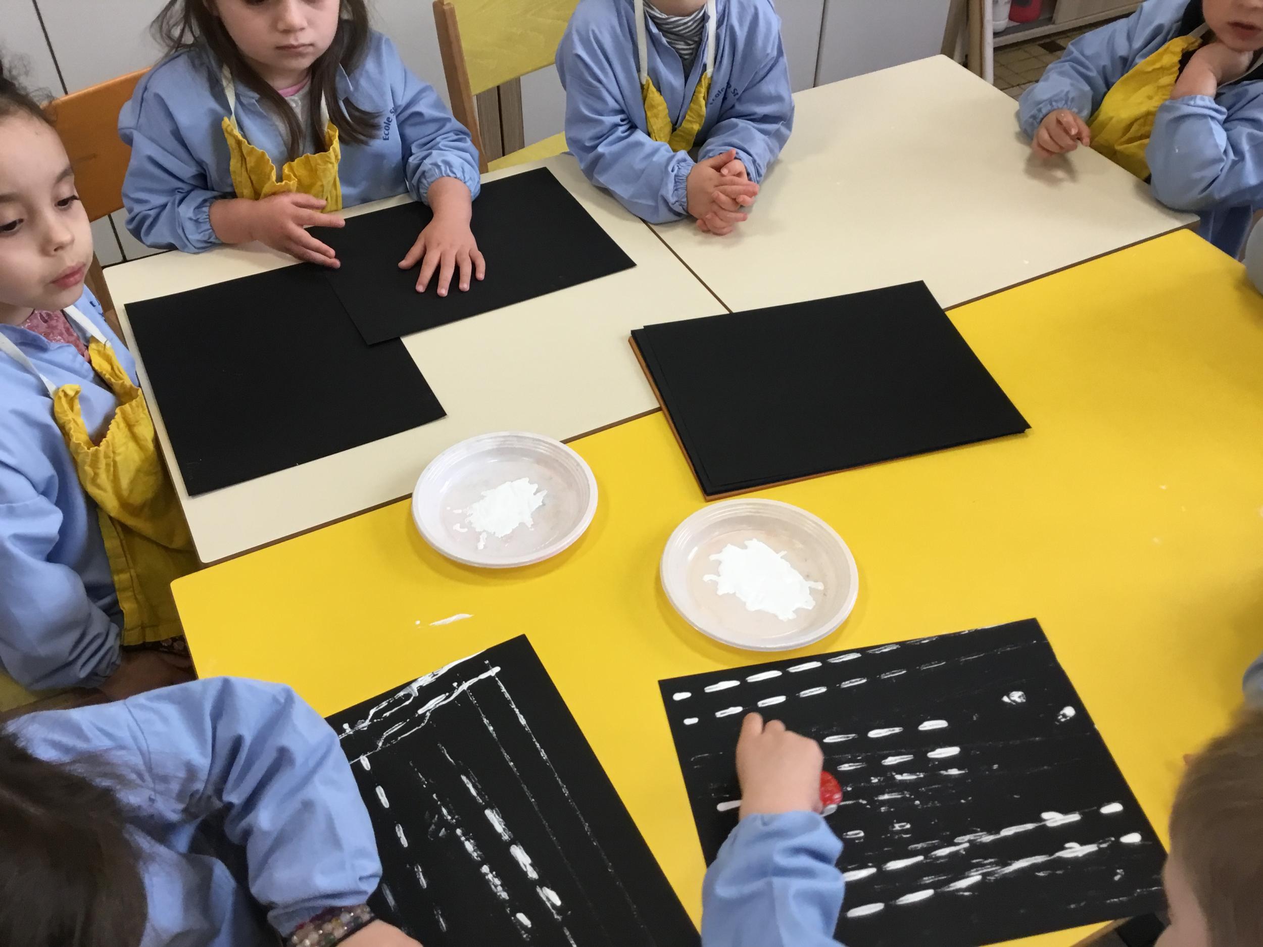 Cette période les élèves vont travailler sur le trait horizontal. Pour commencer, ils doivent appréhender le sens de l'écrit de la gauche vers la droite. Pour cela, ils ont travaillé le geste en faisant rouler, sur une feuille noire, des petites voitures trempées dans de la peinture blanche. Ils ont également aligné des objets sur des feuilles de couleur.