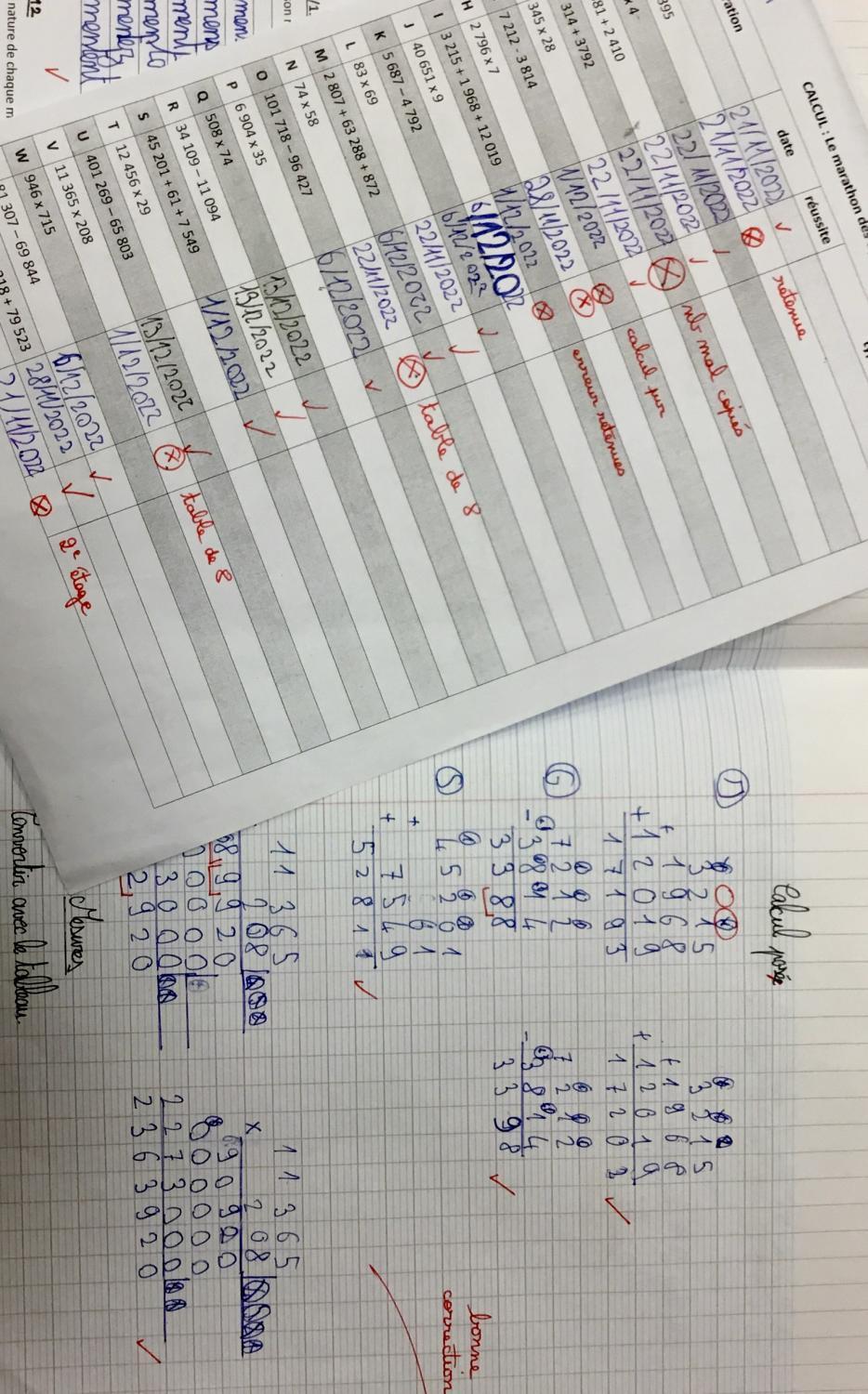 Le lundi, on fait un rituel de calcul posé. On l’appelle le marathon, car il faut calculer l’opération donnée le plus vite possible. On peut s’aider de la leçon et des tables de multiplication. Il y a des soustractions, des additions et des multiplications, donc un peu de tout à part les divisions parce qu’on ne les a pas encore apprises. Elles sont numérotées de A jusqu’à Z, donc il y a 26 calculs à faire. On pose en colonnes l’opération sur son cahier du jour et on écrit la date sur la fiche de marathon. Quand elle corrige, la maîtresse met une croix si on s’est trompé et elle écrit le type d’erreur qu’on a fait, par exemple : table de 3, retenue oubliée... Le jour suivant, il faut corriger son erreur avant de continuer.