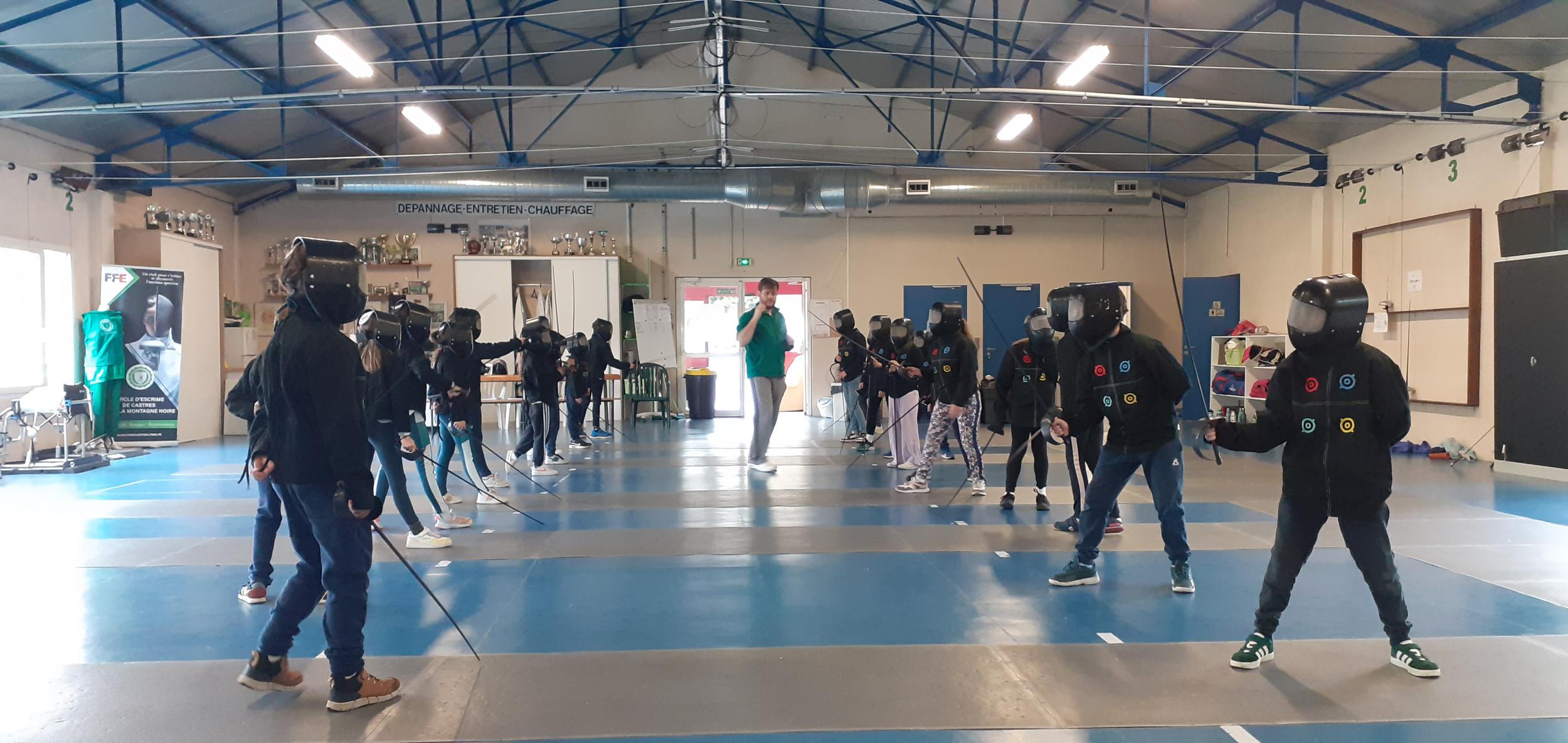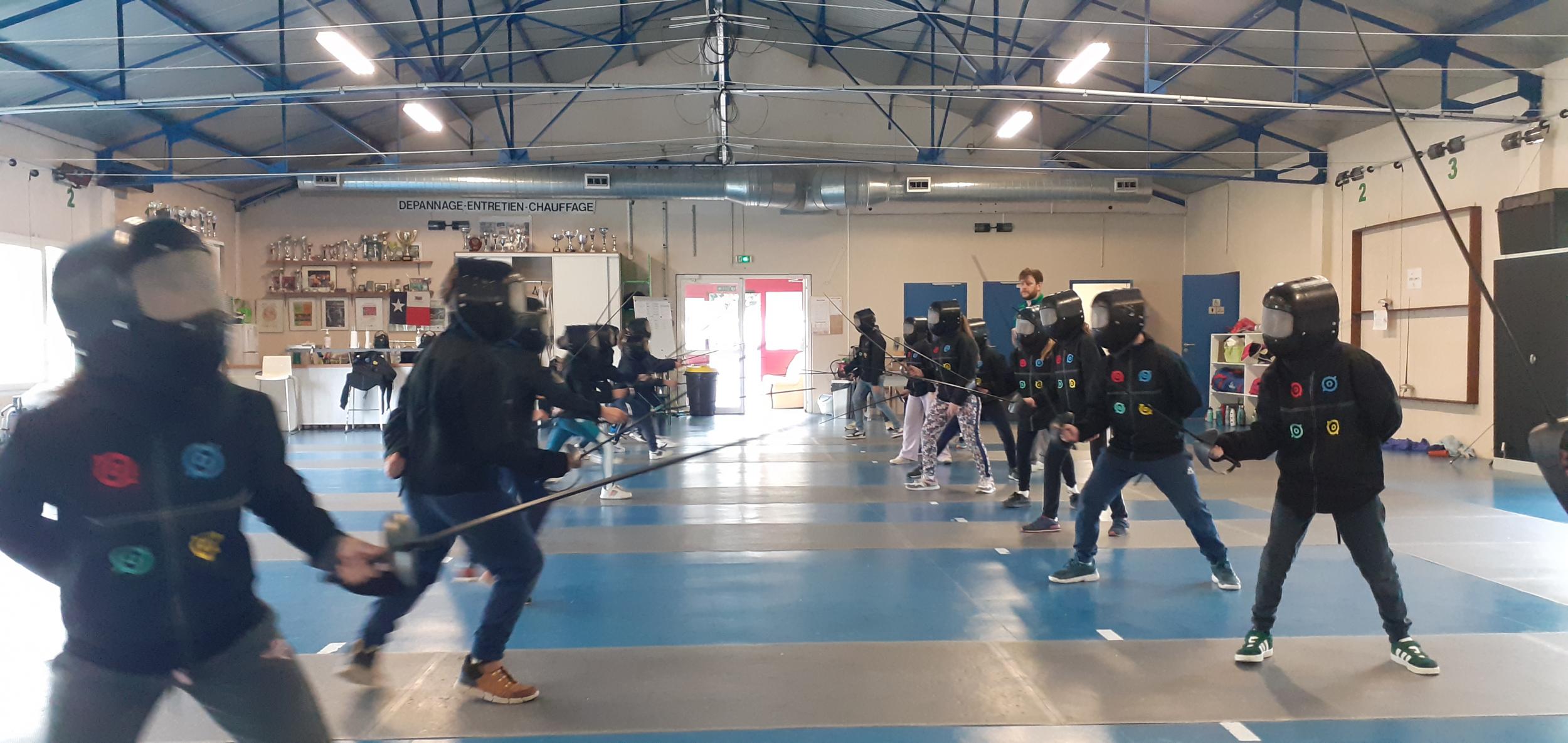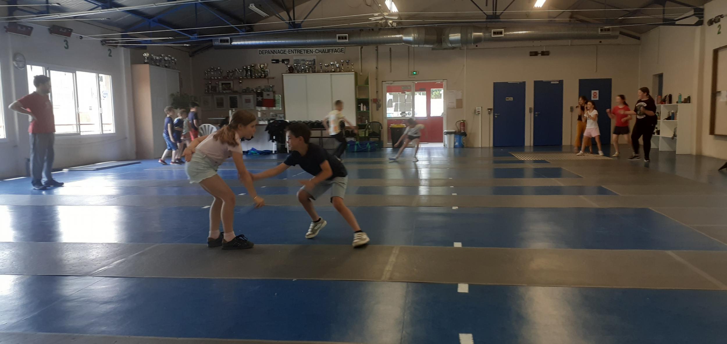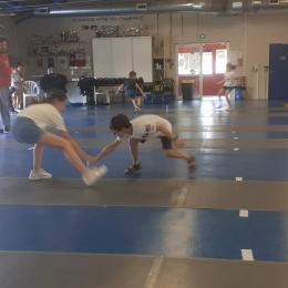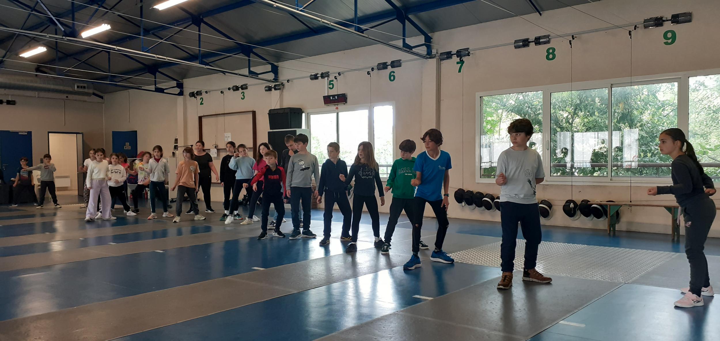 Après des échauffements sous forme de jeux (mobilisant aussi coopération et calcul mental), les élèves travaillent les techniques d'attaque, de parade et de riposte, pour mener de petits duels.